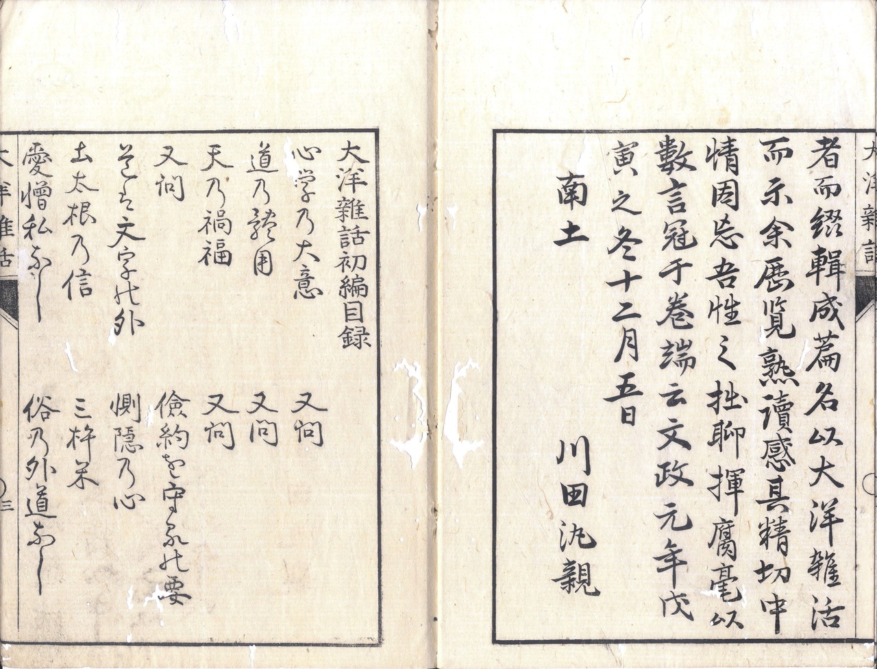 【備考】分類「心学」。第24丁落丁のため、別本コピーにより補った(PDFではダブらせてある)。問答形式で心学の基本を諭した書。本文に見出しはないが、目録には「心学の大意」「道の体用」「天の禍福」「倹約を守るの要」「道は文字の外」「惻隠の心」「土大根の信」「三杵米」「愛憎私なし」「俗の外道なし」「歌も舞も法の声」「文質」「混沌の響」「行状の急務」の14項を掲げる。作者の高村悠斎は、医者・心学者。〔生没〕生没年未詳。天保末年(-1844)頃没か。〔名号〕名、周平。〔経歴〕淡路江井浦の庄屋の分家筋に生れ、初め船乗りであったが、のち溝上孝琢に学んで医を業とした。傍ら京都の上河淇水に石門心学を学んでその高弟となり、帰郷後は家塾大洋舎を開いて淡路に心学を広めた。また、徳島藩の命を受けて領内を巡講した。〔著作〕大洋雑話〈天保5年刊〉(国書人名辞典)。