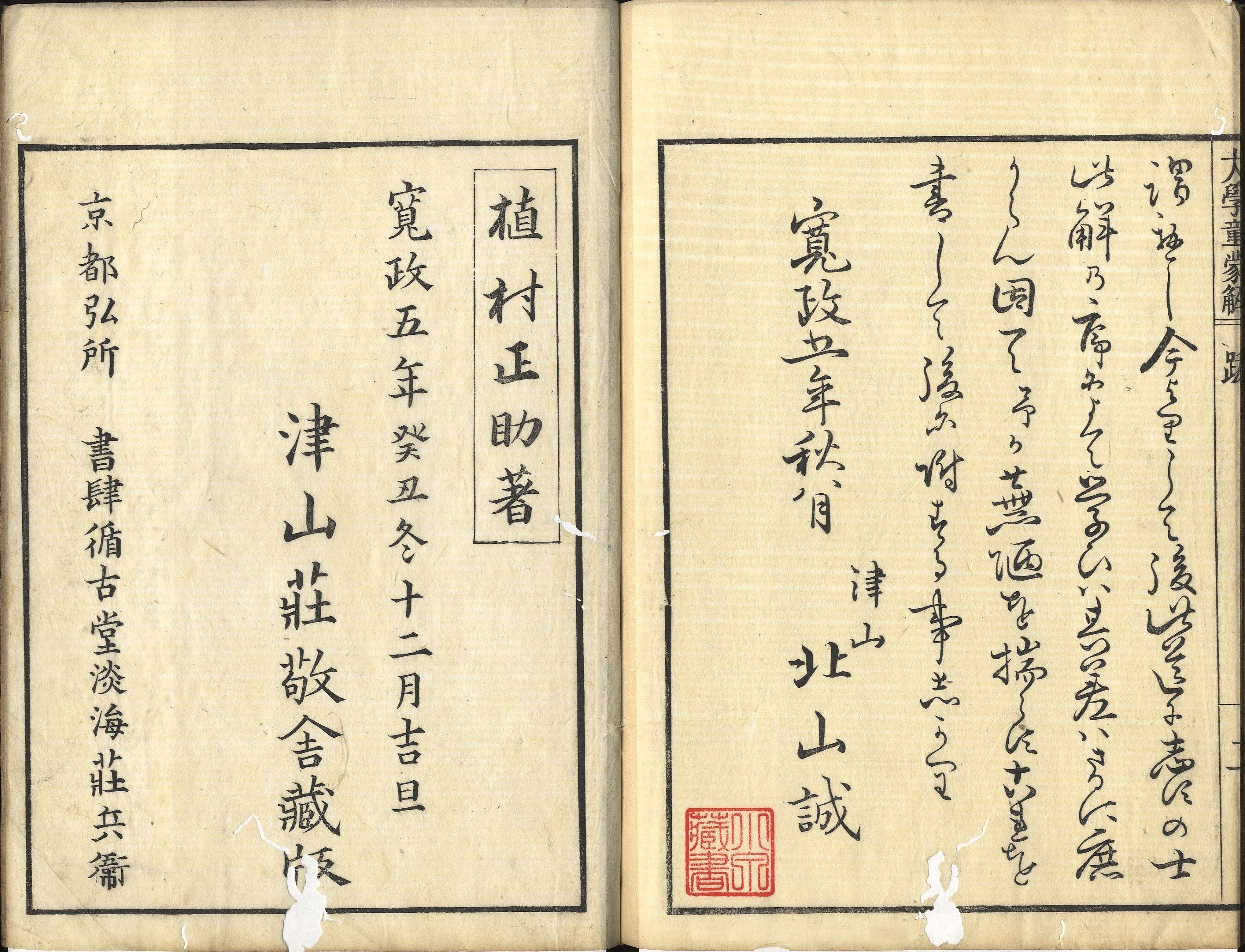 大学童蒙解 【作者】植村正助(賢道・説斎)作。上河淇水(正揚・子鷹)序。北山誠跋