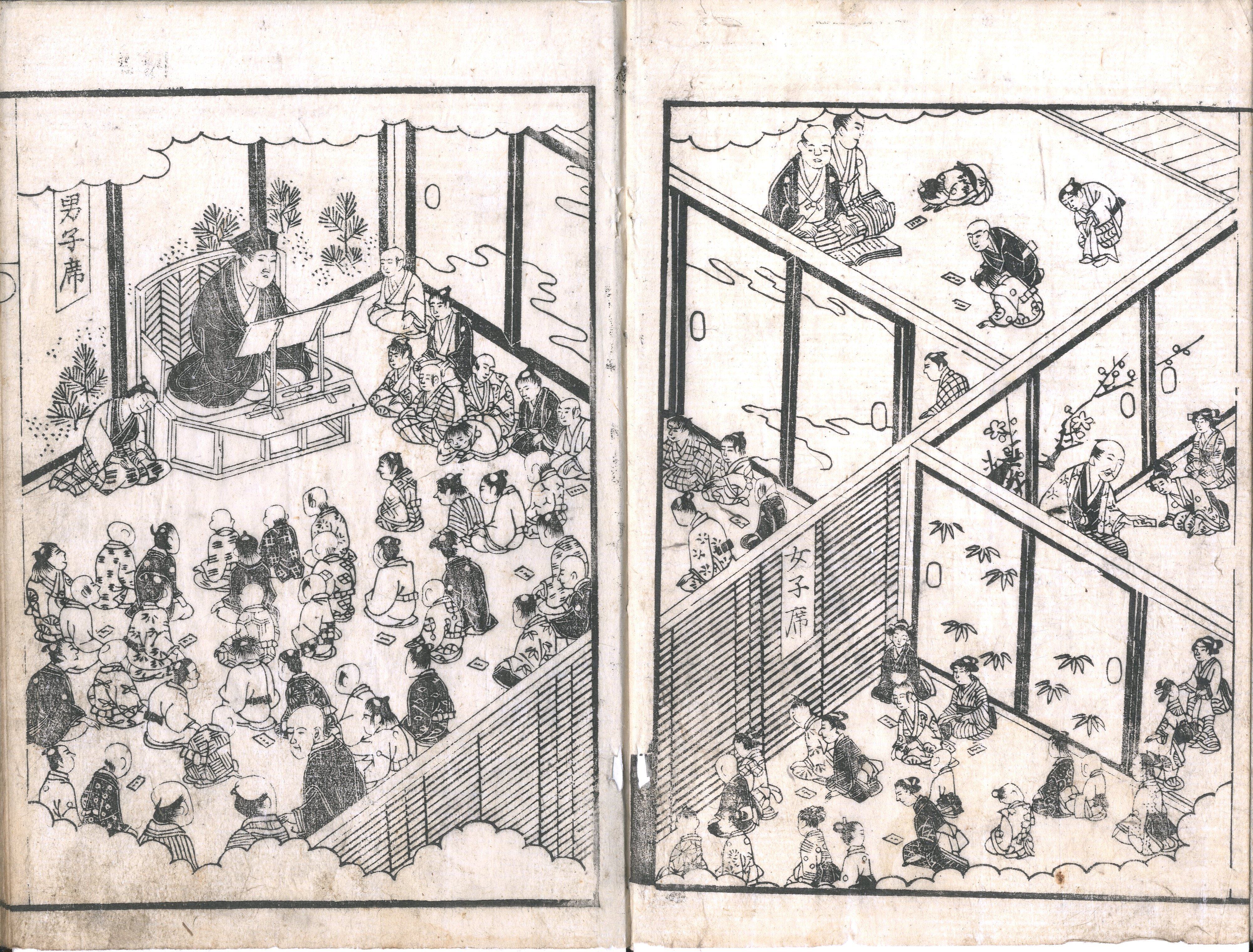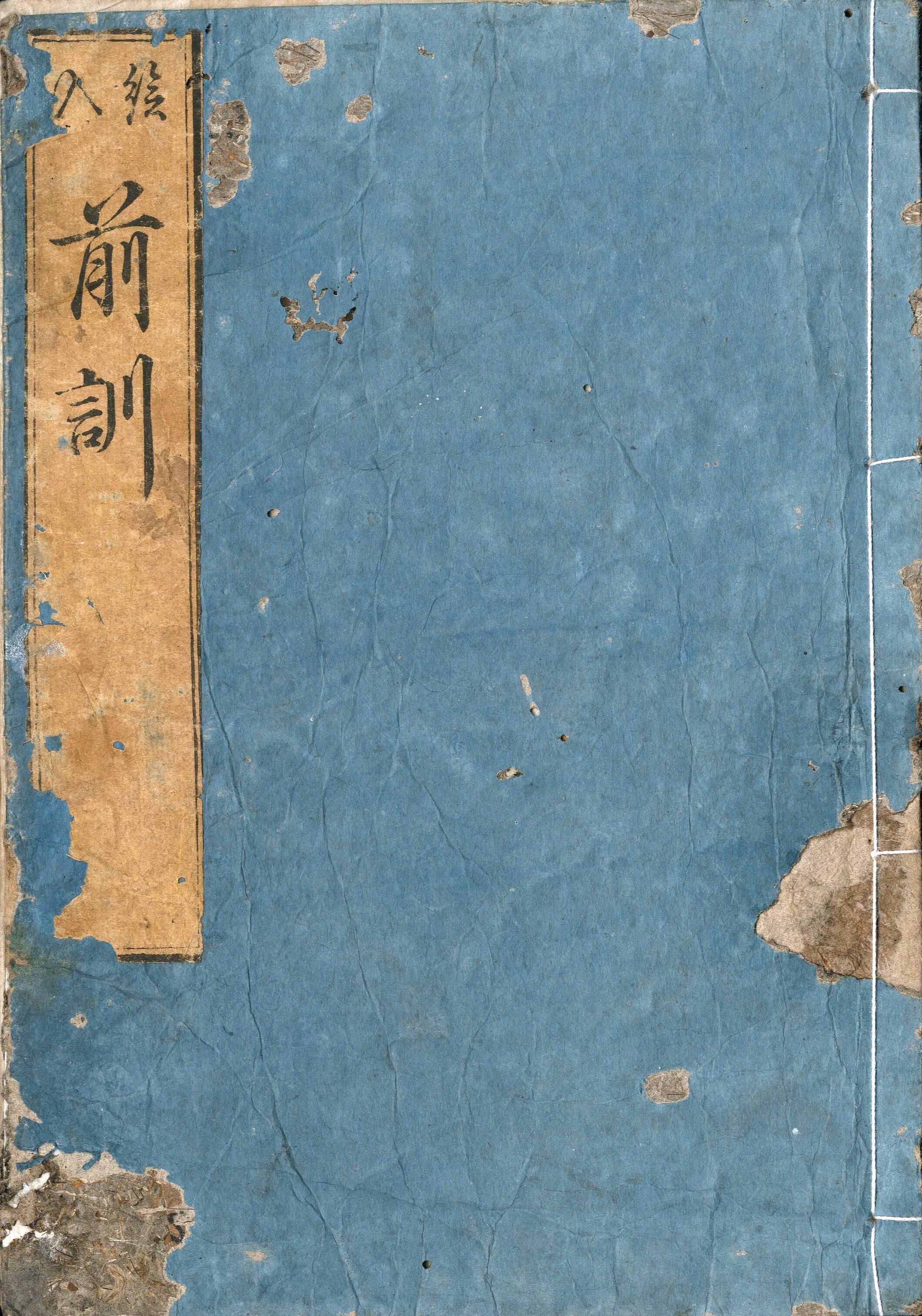 【備考】分類「心学」。同板2種を収録。本書は、手島堵庵作、安永2年刊『〈男子・女子〉前訓』の本文中に挿絵5葉を添えたもの。『前訓』は、安永2年2月から月3回(3・13・23日の八ッ半時)、7~15歳の男児と7~12歳の女児を集めて、親孝行など「御幼稚様方御行作よろしく御成り候為の御教え」を説いた手島堵庵の講話そのものを指し、その際に配布された各回の講話要旨(後述の各章単位の冊子)をまとめて一冊にした書も『前訓』と呼んだ。その初板本である安永2年板の基本構成は、上巻の男子用「口教」(4章20カ条)と、下巻の「女子口教」(1章5カ条)および、附録の「司馬温公家範・婦人六徳和解(柔順・清潔・不妬・倹約・恭謹・勤労)」から成る。ただし、男子の口教は女子も用いるべき事柄であり、女子の口教は男子もわきまえるべきと諭す。「男子口教」では、起床後の神仏礼拝、祖父母や父母に対する挨拶や返事、正直、遊び事や殺生、無礼な言動、男女の別、友の善悪、他人への嘲笑、目下への体罰、衣食への小言、両親への従順、毎月のお灸、身の養生、善悪の報い、悪と気付いたことを口にし行わないことを教え、「女子口教」では「男女の別」や「三従」「四徳」「舅姑・夫への献身」等を説く。巻頭の岡本孝道序文に「是、童子の眼をなぐさめんため、処々に絵をまじへ、こひねがはくば、修身斉家に導き勤行(ごんぎょう)せん事あれかしと。これ、先生(手島堵庵)の欲するところなり」とある。ただし、安永板の口絵にあった集合・解散時の挿絵は割愛する。序文の孝道は文政11年生、明治35年没(享年75)で明誠舎の教師。見返しの「文麗堂」は大阪・播磨屋利助(天保~安政頃)。