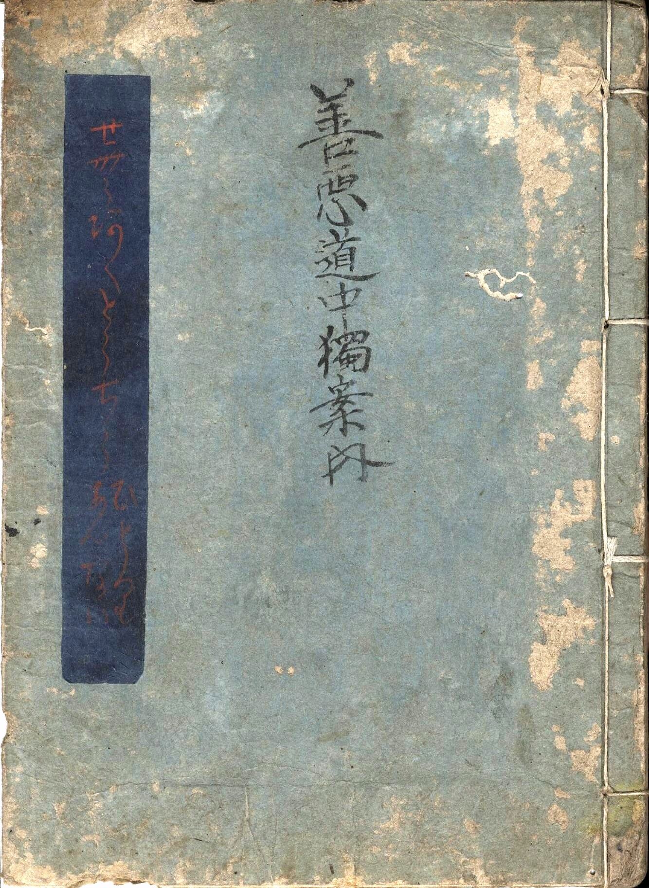【備考】分類「心学・滑稽本」。同板別本も全冊収録した。既に流布していた『人間一生善悪両道中独案内』を改編したもので、人間の一生を道中に見立てた勧善懲悪の書。巻頭に「性善以字形示」図と性善説を諭した道歌や金言を掲げる。続いて「夫婦山より五常峰をへて、隠居山安楽寺へいたる行程、ならびに名所旧跡、宿々泊々、川々船渡し等、初心の旅人の為にことごと記す。其外、迷ひ安き道すぢ、用心すべき所々は絵図に引合て熟覧あるべし」と冒頭で断り、夫婦山から安楽寺までの道中記風の戯文で、幼児から成人後までの生涯の心得を説く。夫婦山から乳母が石、乳呑井、髪置木、袴木、わんぱく堂、気ままの紅葉、手習橋、元服石、声替り坂と順々に進み、その先の六道の辻で善悪邪正・栄枯浮沈の諸方面に分かれるので「道連れを吟味せよ」と教え、ここから険しい正直坂、孝行山を経て安楽寺に行く本街道に進むべきだが、芸能山、高慢寺、酒宴堂、内損寺・吐血の滝、有頂天坂、心中谷、穴市橋、欠落坂、密夫山などの悪しき道に踏み込みやすいので気を付けよと戒める。この種の戯文は宝暦頃、江戸から流行したもので(後掲『〈善悪〉迷所図会』解題参照)、幕末まで単行本や一枚刷など数多く出版されている。なお巻末に、甲州の俳人・平橋庵敲氷(上矢敲氷)の句と「天目山人著書(心学孝の礎・心学ちよぼくれ・心学教訓歌)」を掲げる。作者・志村天目は手島堵庵に学んだ甲州の心学者・国学者。