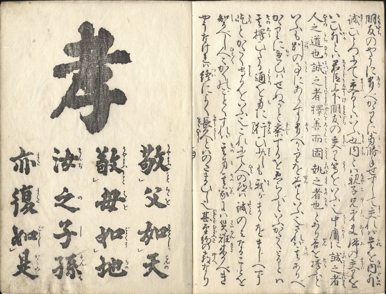 (1)枢要〈忠孝二字解〉 (心学施印)【判型】半紙本1冊。縦226粍。【作者】手島堵庵作。【年代等】江戸中期(明和7年以前)刊。刊行者不明。【備考】分類「心学」。忠孝を説いた宋丞相文天祥語(そうのじょうしょうぶんてんしょうのことば)を掲げて平易に解説した小冊子の施印本。