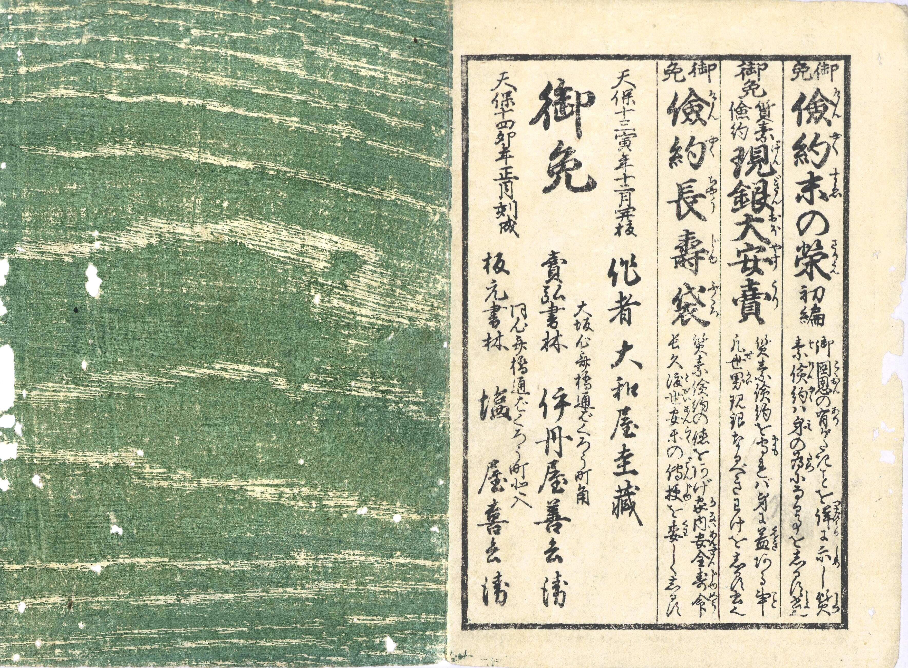 【年代等】初編:天保13年8月自序。天保13年8月刊。[大阪]塩屋喜兵衛蔵板。伊丹屋善兵衛売出。2編:天保13年9月自序。天保14年1月刊。[大阪]塩屋喜兵衛蔵板。伊丹屋善兵衛売出。