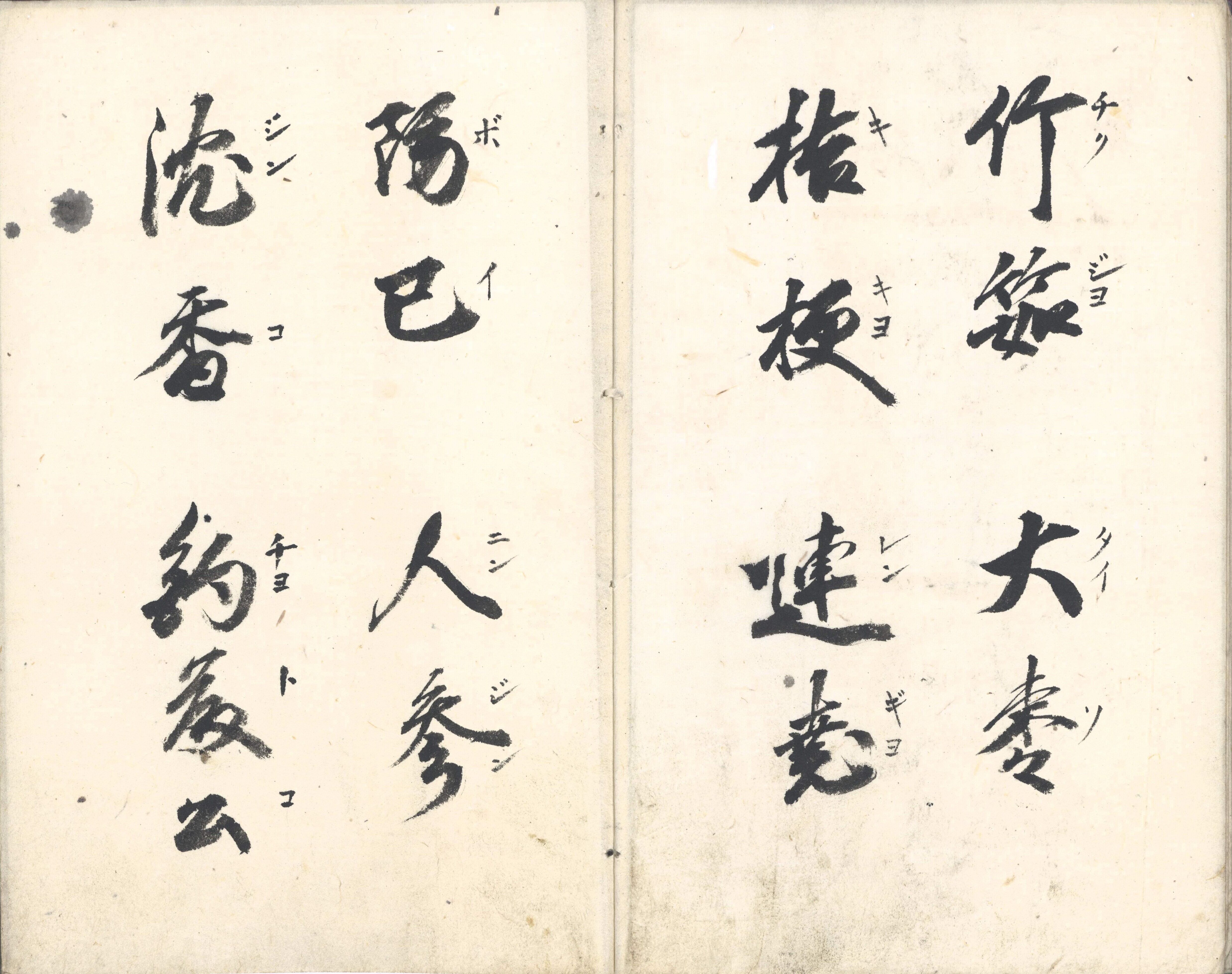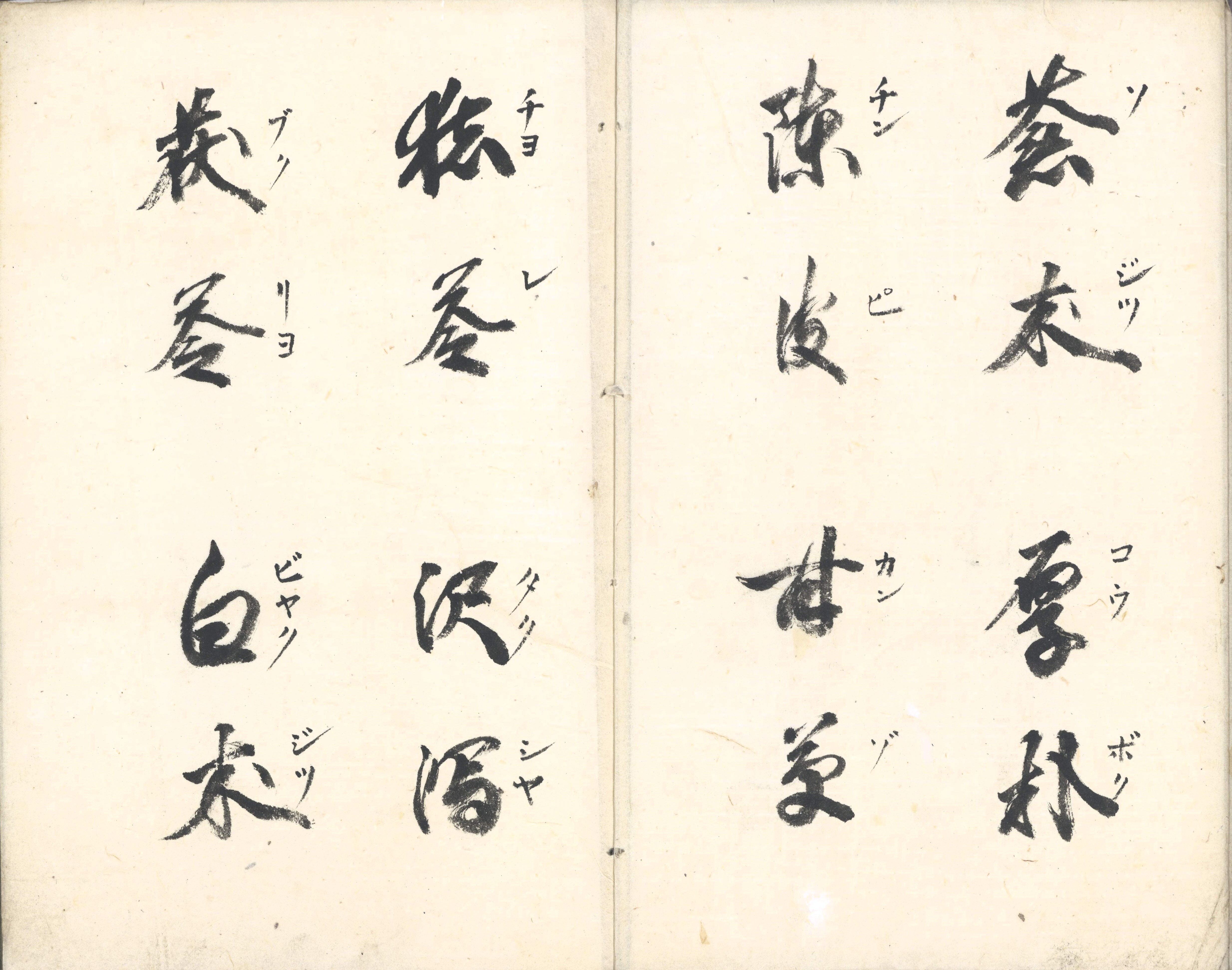 【備考】分類「往来物・医学」。『薬種名寄手本』は、薬種の名称を大字・3行・付訓で記した手本。「当帰・川・芍薬・地黄…」以下183語を列記する。筆者は薬種商の娘であろうか、女性が使用した教材として注目される。本書と同類の往来物に『薬種尽』(筑波大所蔵、重写本)があるが、これは草之部・木之部・菓之部・穀菜之部・金石土之部・禽獣之部・魚虫之部の7部に分けて薬種の名称を列挙したもので、大坂の薬種商子弟用に編まれた手本と思われる。また、文政13年書『薬性歌』は、「人参味甘、大補元気、止渇生津、調栄養衛。黄蓍性温、収汗固表、托瘡生肌、気虚莫少…」で始まる四言240句の文章で、240種の薬種の特徴や効能を列記した薬種入門書・準往来物である。