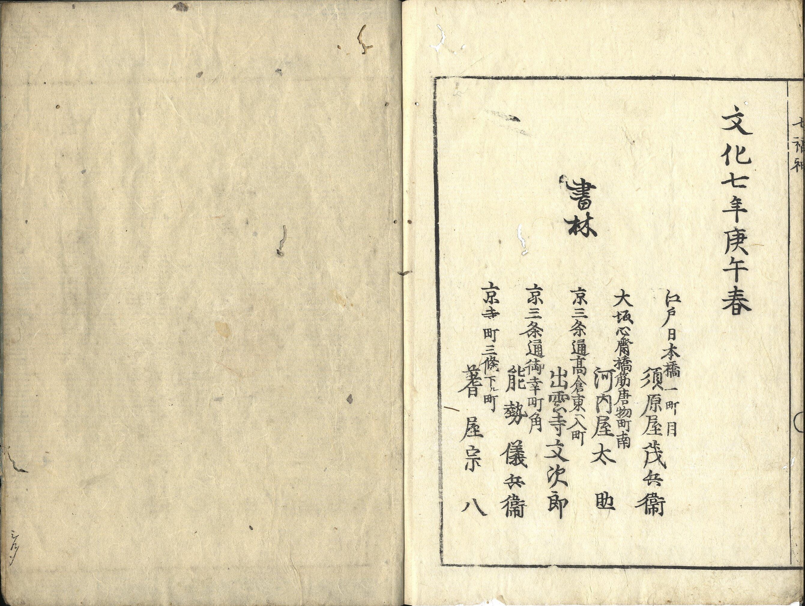 【年代等】文化元年8月作。文化7年春刊。[京都]蓍屋宗八ほか板。【備考】分類「心学」。「七福神のきらひ給ふ七ヶ条(禁方七ヶ条)」、すなわち「普請并道具好之事」「浄瑠璃をならふ事」「海山え逍遙する事」「誹諧を心懸事」「樹木を玩事」「犬・鶏を愛する事」「気に入人を親事」の7カ条を中心に生活心得を述べた心学系教訓書。