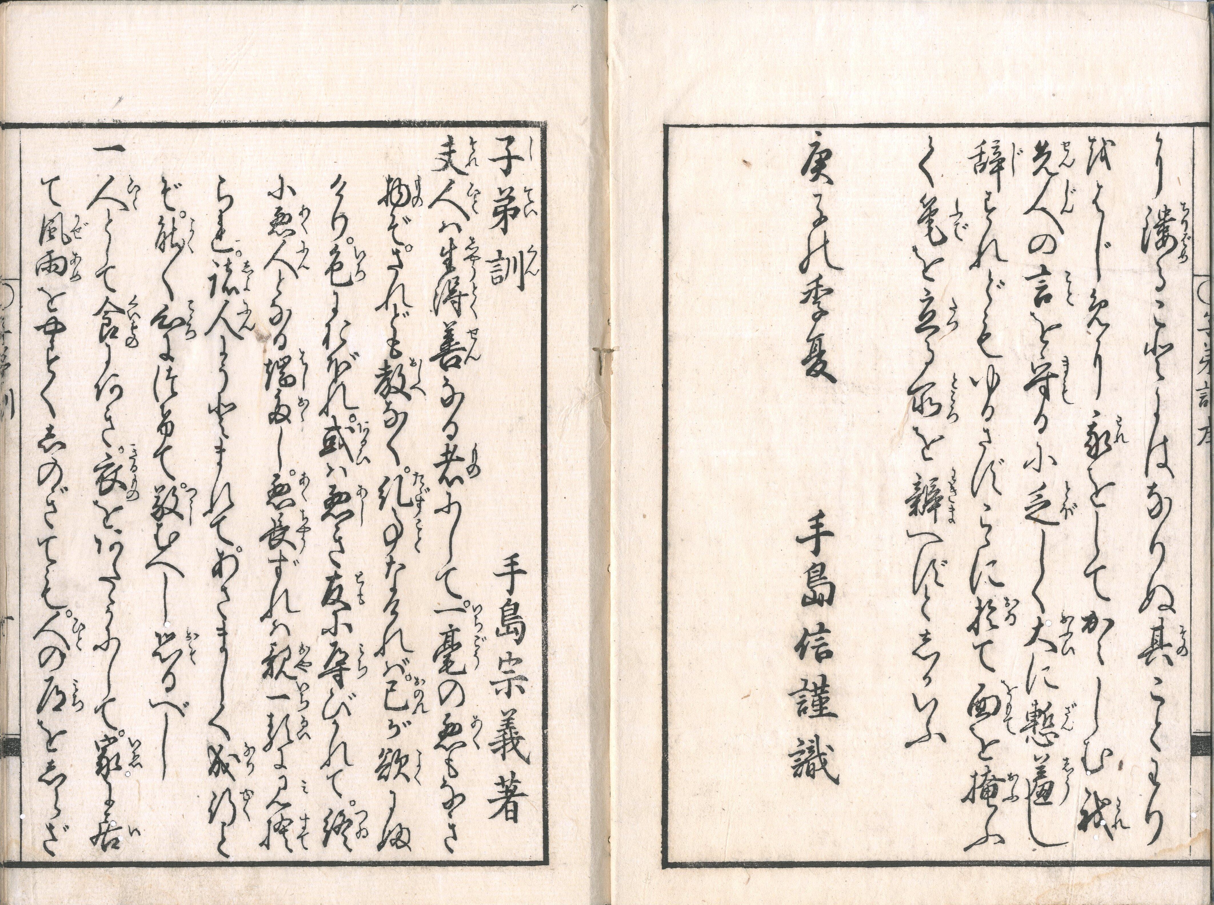 【備考】分類「心学」。安永板2種と文化板1種の合計3種を収録。『子弟訓』は、序文に「我が老父、子弟を導(みちびく)に『小学』の切近なるものを少しく仮名にしるして、其弟(てい)某にあたへ、旦夕(たんせき)によましめて、我に及べり。又、我が子弟も伝へ誦(よみ)て、其遺愛を蒙るもの多し」と述べるように、南宋・朱熹らが編んだ『小学』を参考に初学者の身近な教訓を記した書。手島家の子弟用教訓書として代々伝わってきたが、要望が強く、作者である宗義の没後に、その子・堵庵が序を寄せて出版した。「夫、人は生得(しょうとく)善なる者にして、一毫(いちごう)の悪もなき物ぞ。されども教(おしえ)なく、糺事(ただすこと)なければ、己が欲にふけり、色におぼれ、或(あるい)は悪(あし)き友に導びかれて、終(つい)に悪人となる端(はし)多し…」と起筆した前文に続き、長短含む36カ条を掲げる。人の道の基本である忠孝・五倫、孝行の具体的な方法、妻の離縁と妻への愛敬、両親の看病・服喪・法要、主人への仕え方、家来の使い方、夫婦和合と夫婦の慎み、妻の選び方と七去・三不去の考え方、兄弟関係、年長者への仕え方、来客時の家来への対応、貴人等への気遣い、貴人の相伴の仕方、択友と朋友との接し方、敬(つつしみ)の心、言葉の慎みと立居振舞・余力学問、他人への慈悲(仁恕)、約束の厳守、分を弁えること、慎独、善人になる方法、先祖の苦労を思うべきこと、我が子に身持ち・心持ち・我が行いの3つを譲るべきことなどを諭す。