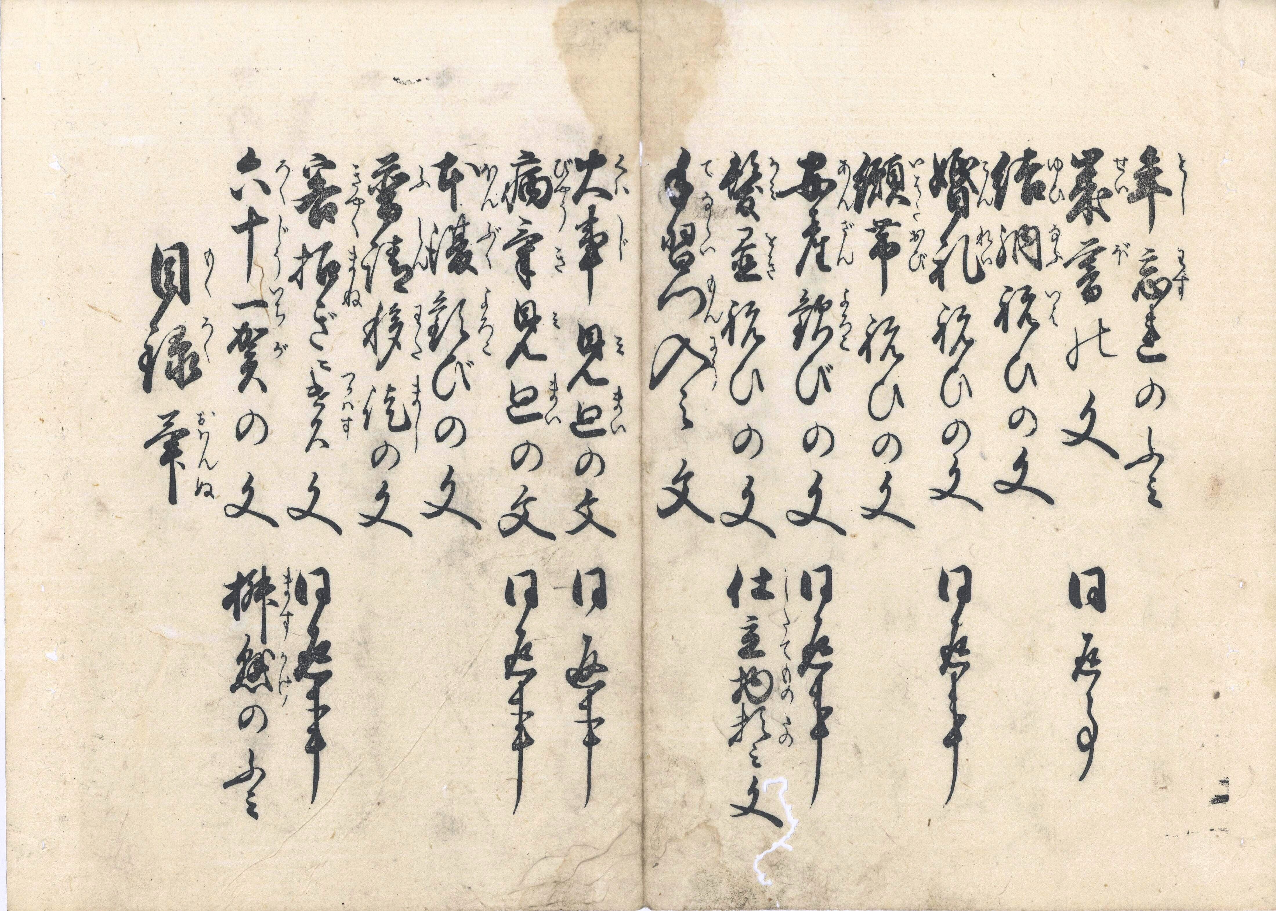 【備考】分類「往来物」。袋綴じ展開収録。刊年は見返しの書籍広告による。『女文章百千鳥』は、「年始の文」から「枡懸のふみ」までの48通の例文を収録した女用文章。概ね五節句や四季折々の手紙、各種祝儀状・見舞状等の順に収録し、各例文を大字・5行・ほとんど付訓で記す。