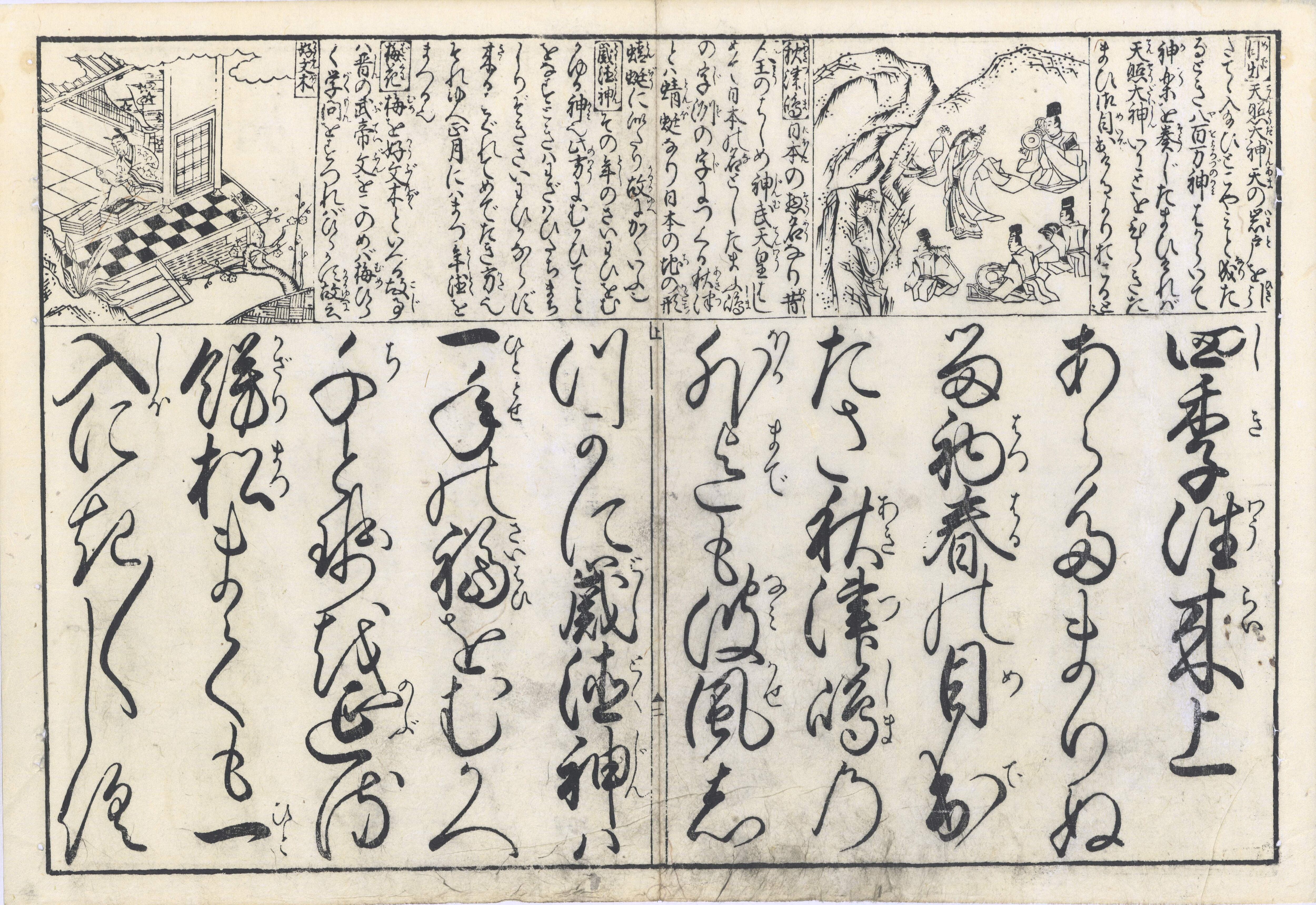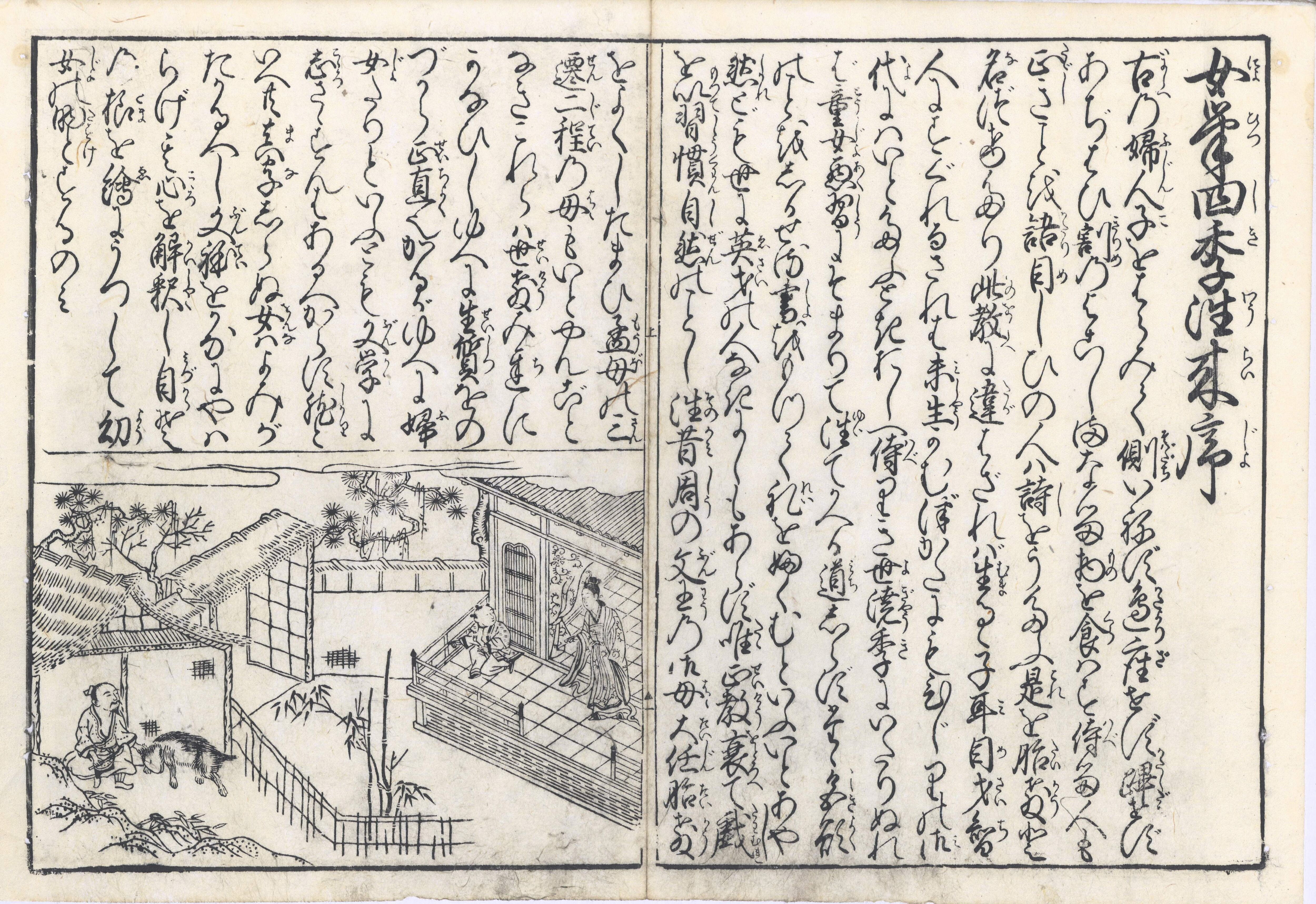 【備考】分類「往来物」。袋綴じ展開収録。中巻・下巻は元禄板の取り合わせ。上巻の全部と中巻第12丁は、元禄板とほぼ同内容の嘉永4年補刻『女徒然錦文庫』から抄録(元禄板上巻と異なる部分は、上巻最終丁裏の1カ所のみ)。題簽角書は、上巻「首書画抄」、中巻「首書絵入」、下巻「首書絵抄」。『女筆四季文章』は、万治2年以前刊『女庭訓』や延宝6年刊『四季仮名往来』と同様に、四季・花鳥風月の推移や年中行事のあらましを記した往来。全文を大字・5行・付訓の並べ書きで綴る。各月往復24通(上巻1~4月、中巻5~8月、下巻9~12月)の女文で、五節句その他の年中行事故実、四季の風趣などを紹介する。それぞれの月に即した自然の景趣、儀式行事を主題とし、京都の貴族女性が身につけるべき伝統的教養としての影響が顕著である。また、内容の一部に『女庭訓』の影響が認められる。『女庭訓』よりも簡単な記述だが、年中行事故実等についての詳しい説明と図解を頭書に掲げる。この挿絵は貴族風俗を基調とするが、近世風俗に基づくものも含む。大本3巻3冊。なお、本書に前付記事を増補した改題本『女つれづれ色紙染』が享保6年に、さらに享保板の前付などを改編した改題本『女徒然錦文庫』が嘉永4年にいずれも大阪で刊行されている。