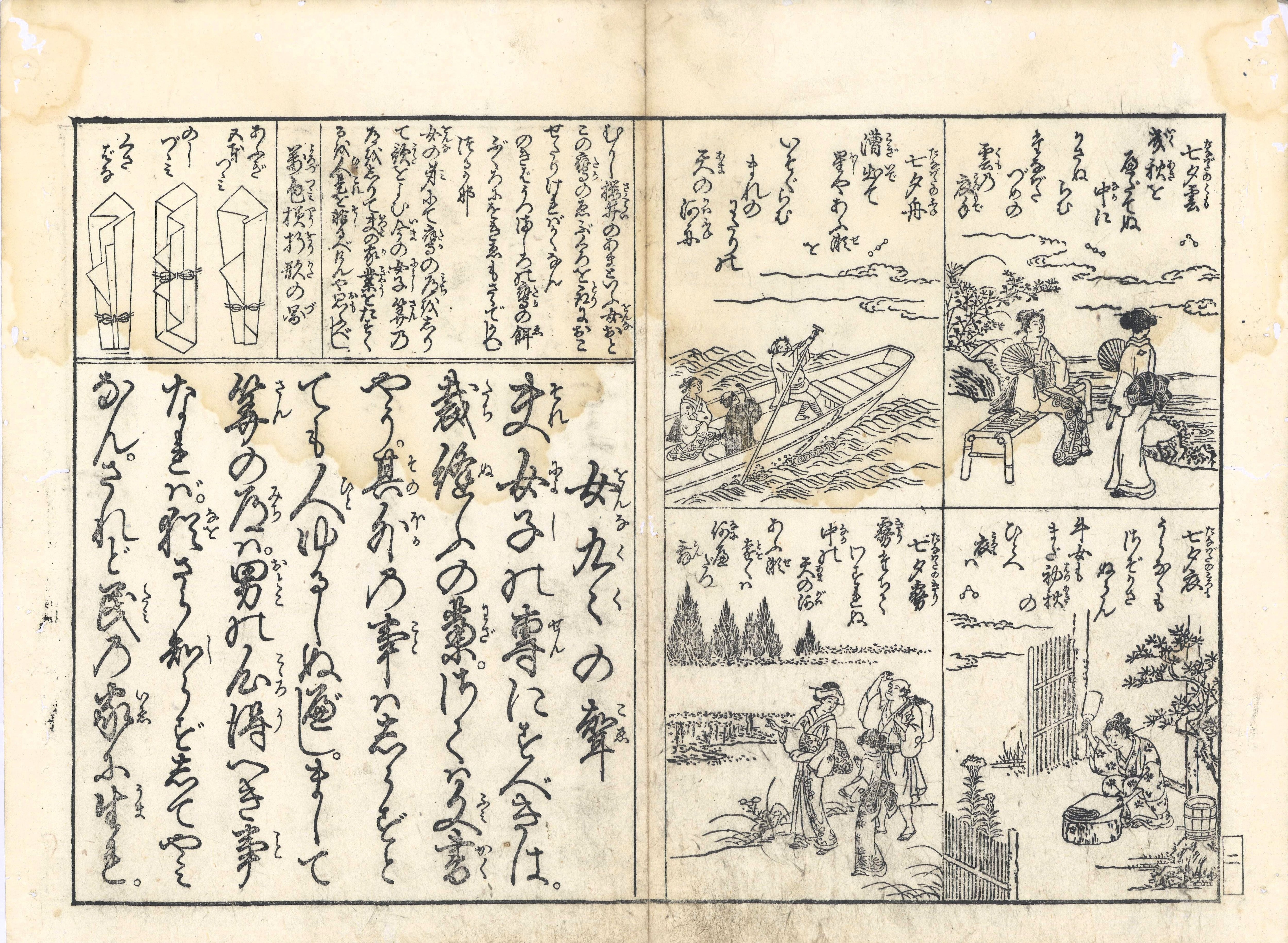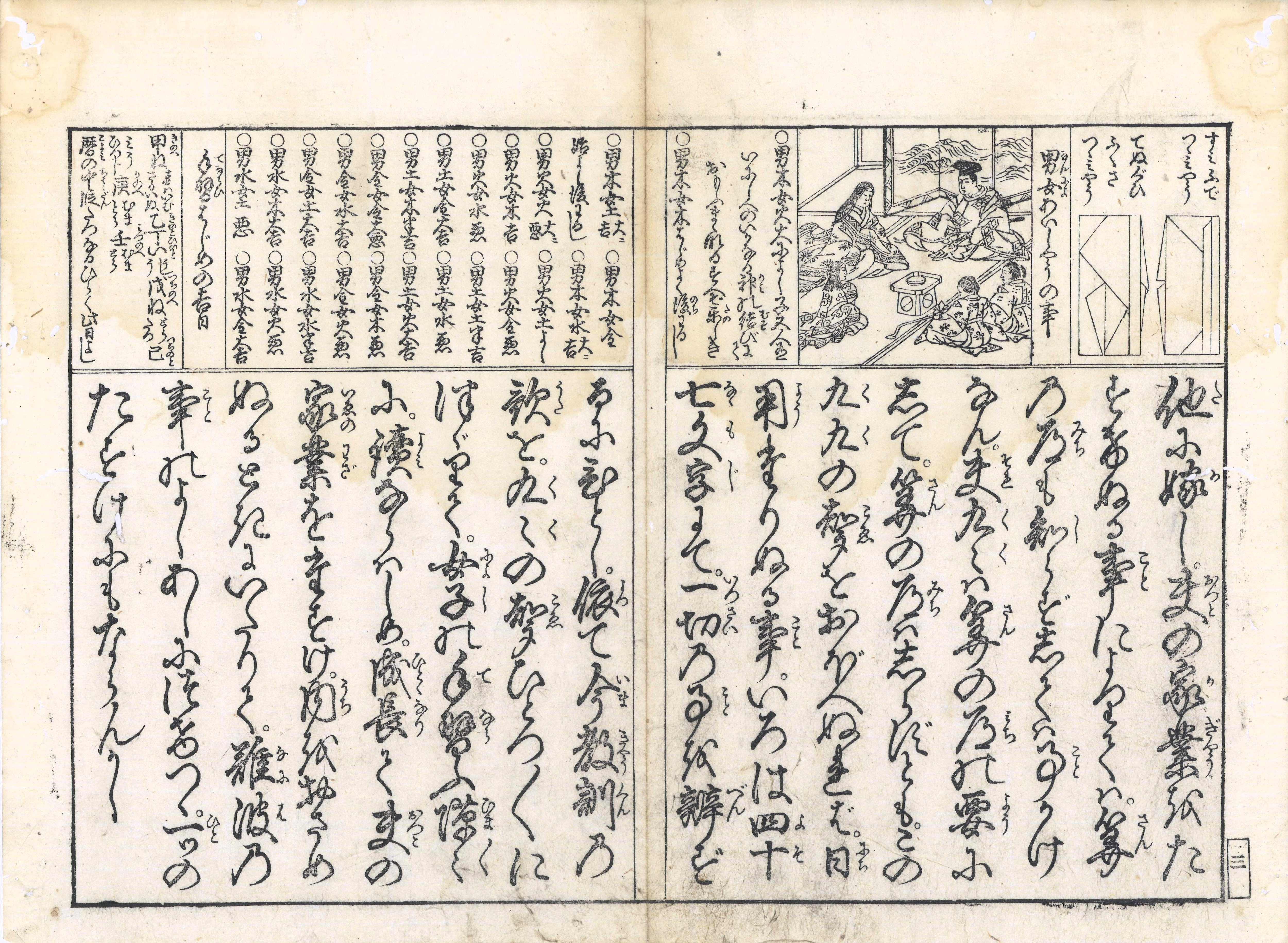 【備考】分類「往来物」。同板2種を全冊、袋綴じ展開収録した(ただし題簽は異板)。『〈稚児教訓〉女九九乃声』は、九九の読み声と教訓歌、さらにそれを敷衍した挿絵と頭書で構成された女子用往来。冒頭で女性の日常生活における九九の重要性を強調する。続いて、九九の読み声毎に第1音が文字鎖で連なる教訓歌36首と挿絵36葉を掲げる。前付に「道真の母詠歌」「正月・七夕和歌」等、頭書に「万包様折形の図」「男女あいしやうの事」「手習はじめの吉日」「手習をする事」「書を学ぶ事」「父母につかゆる事」「小児をしへ草」「問は恥にならぬ事」「口ごたへする事」「髪ゆひもらふ事」「千草むすびの事」「ますかゞ見の事」「人々癖ある事」「香を聞事」「女中神前へ向ふ事」「茶の湯心得の事」「女中の綿をつむ事」「ぬいはりの事」等の記事や挿絵を多く掲げる。