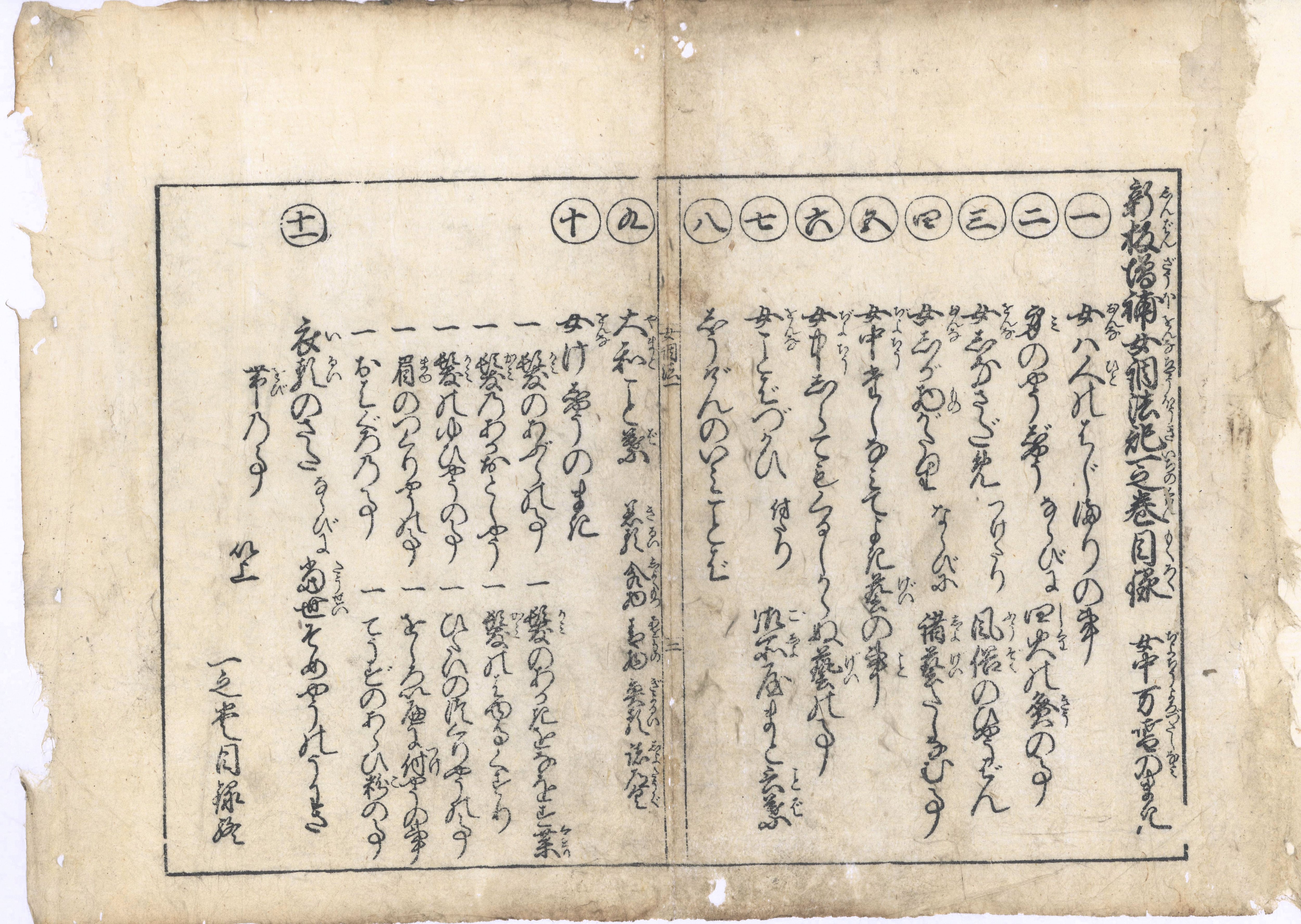 【備考】分類「往来物」。袋綴じ展開収録(見開き図再掲)。2巻第11丁落丁。『女重宝記諸礼鑑』は、元禄5年初刊『〈ゑ入〉女重宝記』5巻5冊本の改訂版。『女重宝記』は、元禄期以降に数多く板行された重宝記類のうち最も流布したもの。元禄5年板の自序に「今、この五冊の草子に、女の善を述べあらわして、かのひがみを揉めなをし、女の覚へてよき事を書あつめて、かの拙を直ならしめ申候」とあるように、女子一般の教訓を含む女性生活百科の嚆矢である。底本には、一之巻「女中万嗜みのまき」は、「女は人のはじまりの事」以下11項で、養生・風俗・教養・言葉遣い・化粧・衣裳など日常生活全般の心得。二之巻「しうげん(祝言)のまき」は、「しうげんの次第」以下13項で、婚礼祝言・諸飾り・給仕作法・食礼について。三之巻「くわいにんのまき」は、「懐妊の事ならびに養生の次第」以下17項で、産前後の養生、妙薬、新生児養生、服忌など。四之巻「しよげい(諸芸)のまき」は、「手ならひの事ならびに文かく事」以下9項で、手習い・和歌・琴・貝覆い・歌かるた・香などの諸芸と「女中諸病妙薬」「万染み物落し様の事」。付録「女節用集字尽」には、本文欄に「女用器財之字づくし」「同衣服の字づくし」「同絹布の字づくし」など9項と、頭書に「源氏物がたりの目録并ニ香の図」「小笠原流よろづ包やう折形の図」「七夕の事、并ニうたづくし」などを載せる。