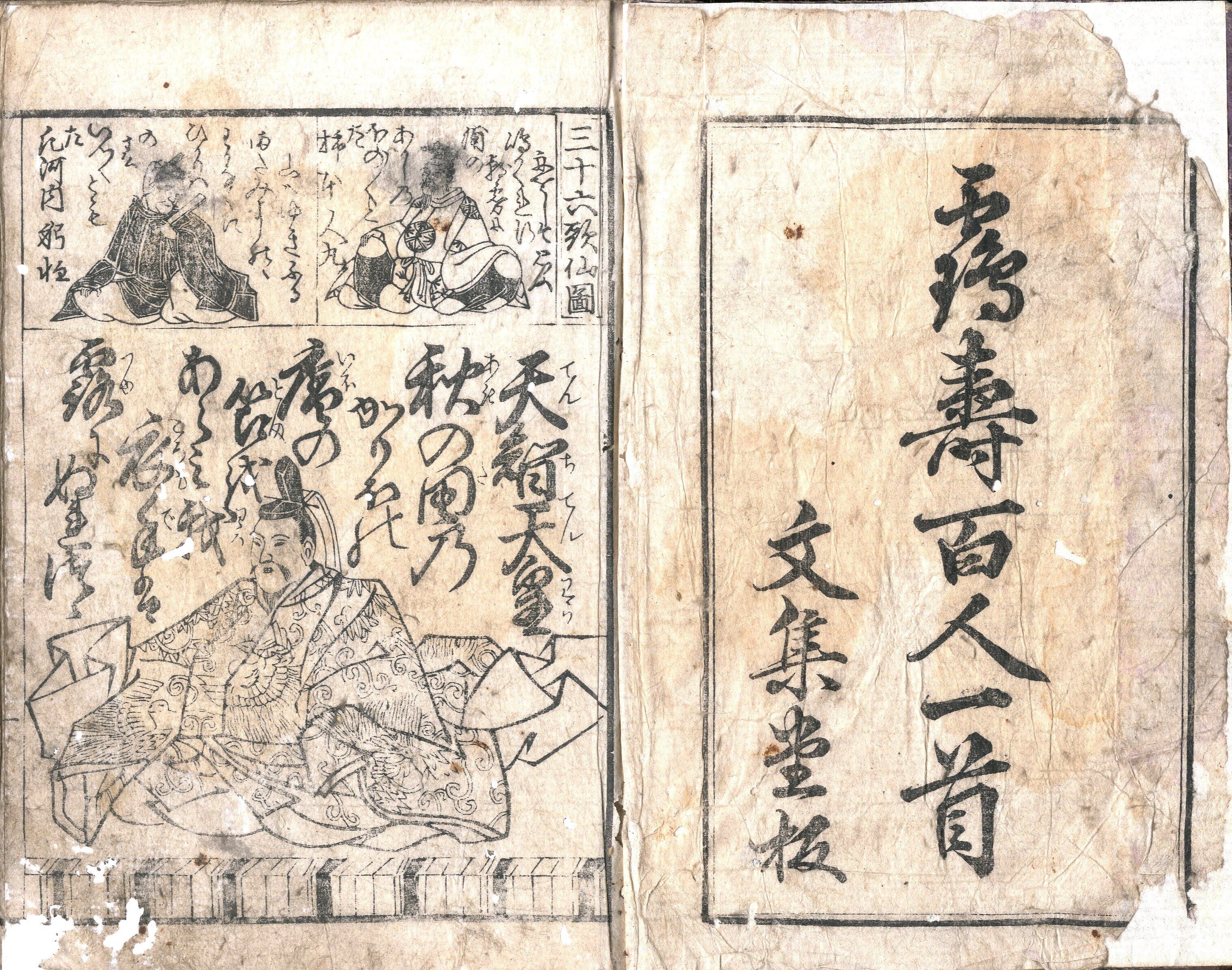 【備考】分類「百人一首」。天智天皇から順徳院に至る100人の代表歌100首を集めたアンソロジー。所収歌101首中97首が『百人一首』と共通する『百人秀歌』はその草稿本とされる。江戸中期以降は、女子用往来と合本したものや共通する記事を収録したものが1200種以上刊行され、ほとんど往来物として扱われた百人一首が刊本の主流となった。底本は、頭書に「三十六歌仙図」「源氏物語五十四帖引歌(仮題)」「百人一首読様之弁」「ふじんをしえ草」「七夕之詩歌」「婚礼式法の弁」「万折形之図」「組糸結様之図」「六歌仙の詠」を載せる。