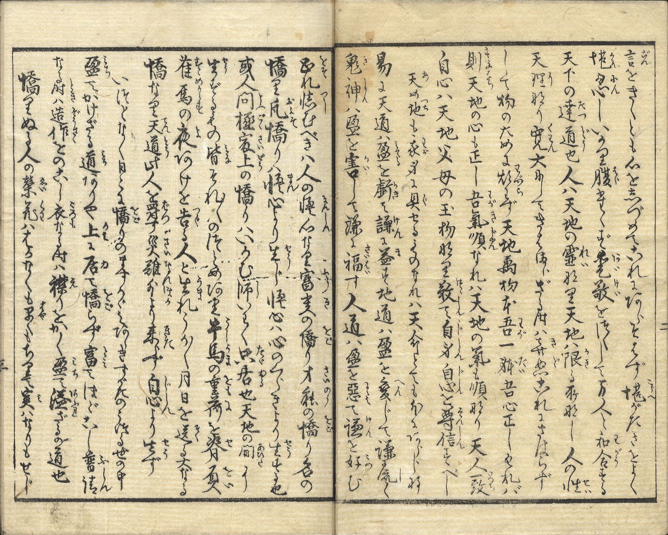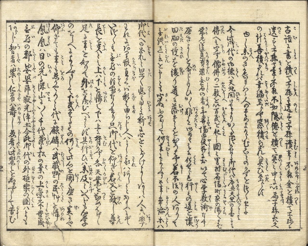 【備考】分類「心学」。嘉永元年板は、大島有隣十三回忌の追善出版で、既に焼失の板木を複刻したもの。和漢諸書からの金言・道歌や種々の故事・逸話を引きつつ心学の要諦を諭した書。