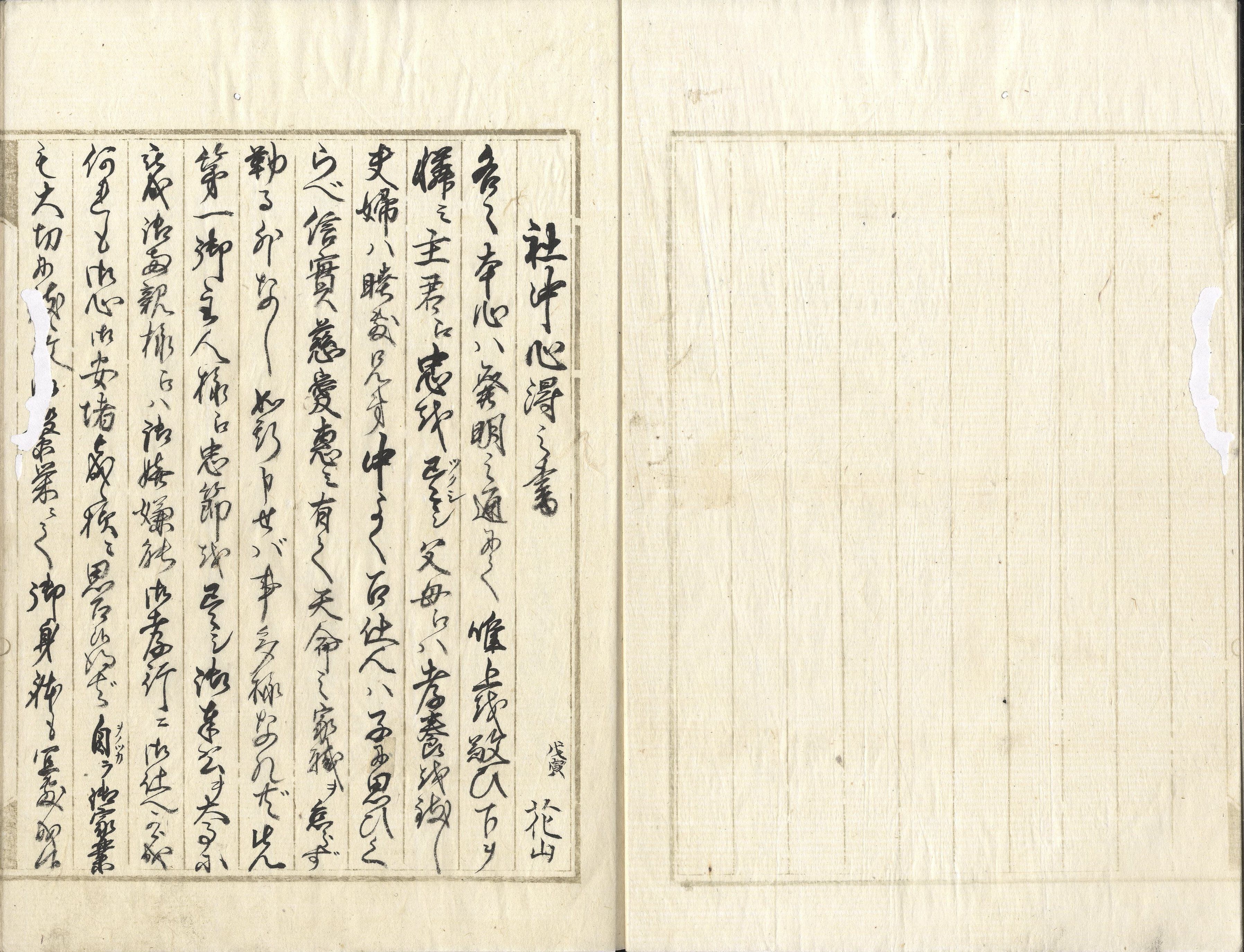 【年代等】安永9年8月作。文政元年書。【備考】分類「心学」。(1)安永9年「社中心得之書」、(2)天明2年「社中順講心得定書」、(3)天明元年「諸方道話ニ御出之朋友中御心得之大体」、(4)天明4年「都鄙社中取結ビ申合之条目」「会輔中可守之大事」「御高札之大略」の4点を収録する。本写本は心学統制上の重要な規約をほぼ網羅する。