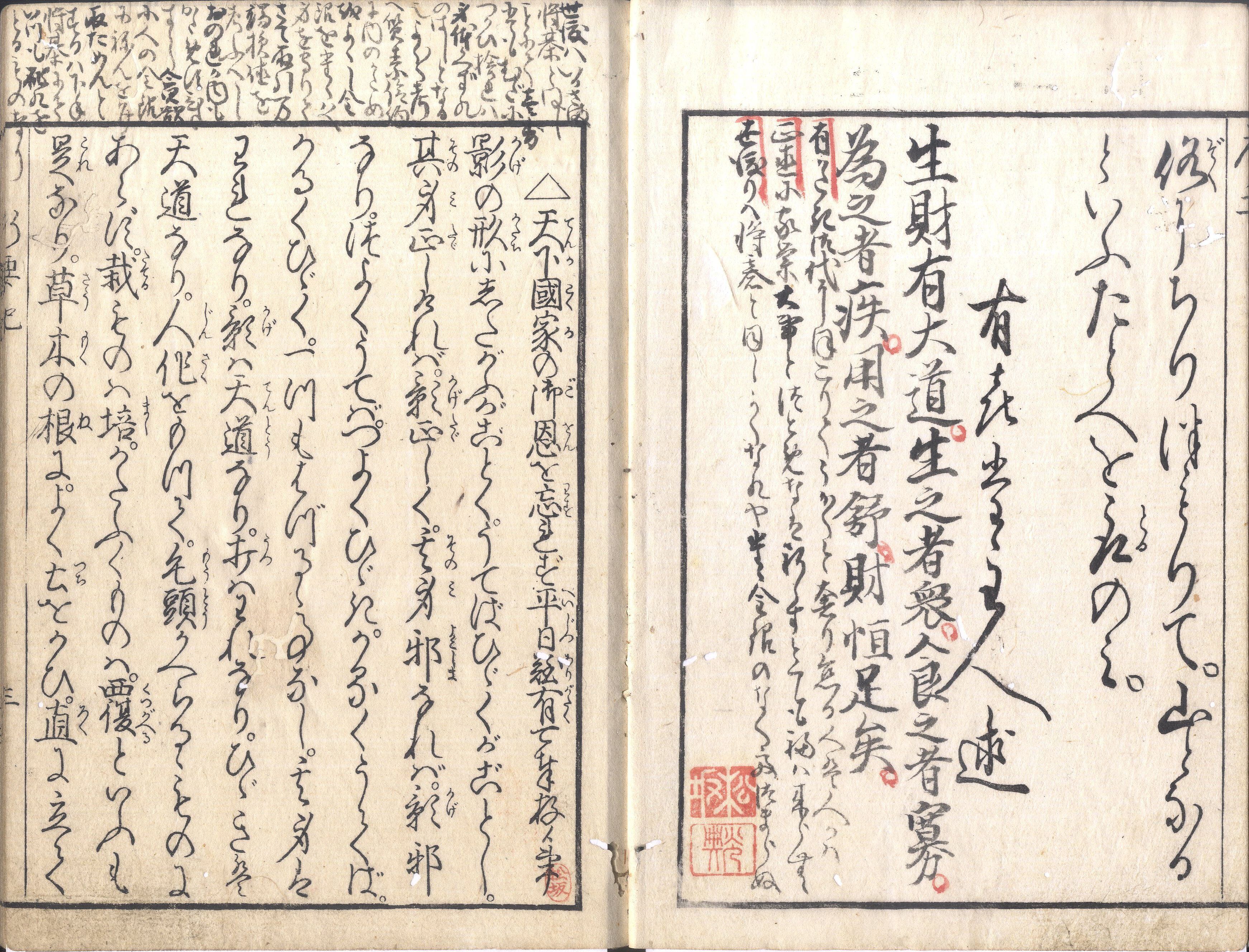 【備考】分類「心学」。後印本([名古屋]長谷川孫助板)も抄録した。表紙見返によれば、本書は「天下国家、神仏の御恩を忘れずして諸人楽々と世を渡るべき助けになる心得を記」した教訓書で、「天下国家の御恩を忘れず平日有難く存じ奉るべく候事」以下約20項目を載せる。ただし、文章の長さもまちまちで構成も整理されておらず、著者の随感や備忘録といった印象が強い。それも道理で、享保9年刊『冥加訓』第2巻や享保4年刊『町人嚢』第2巻からの引用が目立ち、さらに「我今日」は享保11年刊『民家分量記』第5巻からの引用であるように、諸書からの雑記録のような性格を持つ。本書の独自性については見極めが必要だが、主な記述内容は、『冥加訓』で説かれた天の冥加を得るための日常の生活態度や富裕になるための心掛け、また、法令遵守、火の用心、仏神崇拝、誠、分限、家職出精、始末、礼儀、質素倹約、学問その他についての雑多な心得や教訓歌である。このような寄せ集めの結果、本書には「立身出世薬」とも言うべき教訓として「〈秘法〉六味簡略丸」と「陰徳丸」の2種が同時に掲げられている。