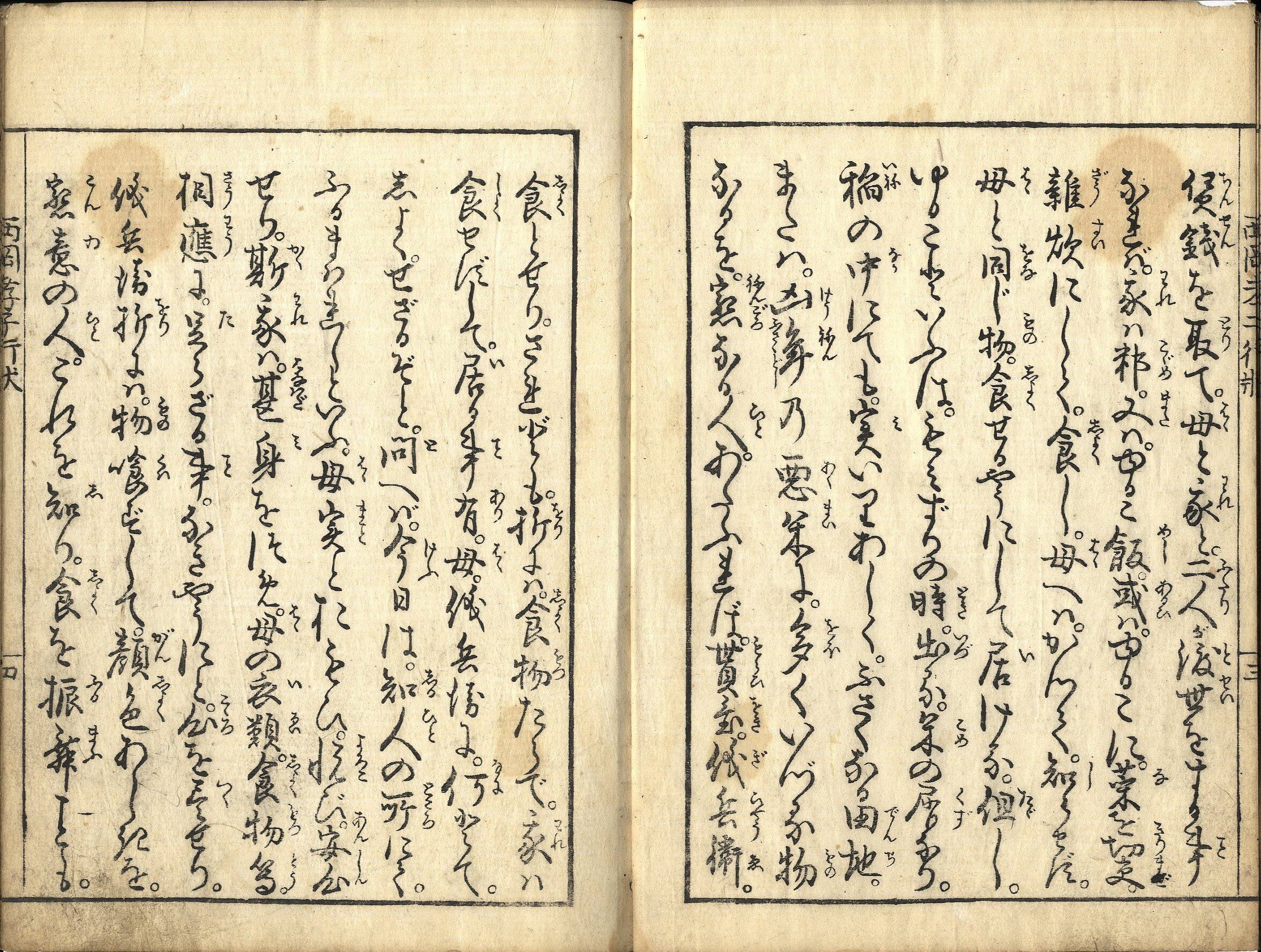 【備考】分類「心学・伝記」。山城国葛野郡(カドノゴオリ)西岡(ニシノオカ)川嶋村二町縄手(ニチョウイテ)の孝子・儀兵衛の行状を綴り、その孝子ぶりを讃えた書。底本は石川謙旧蔵書。