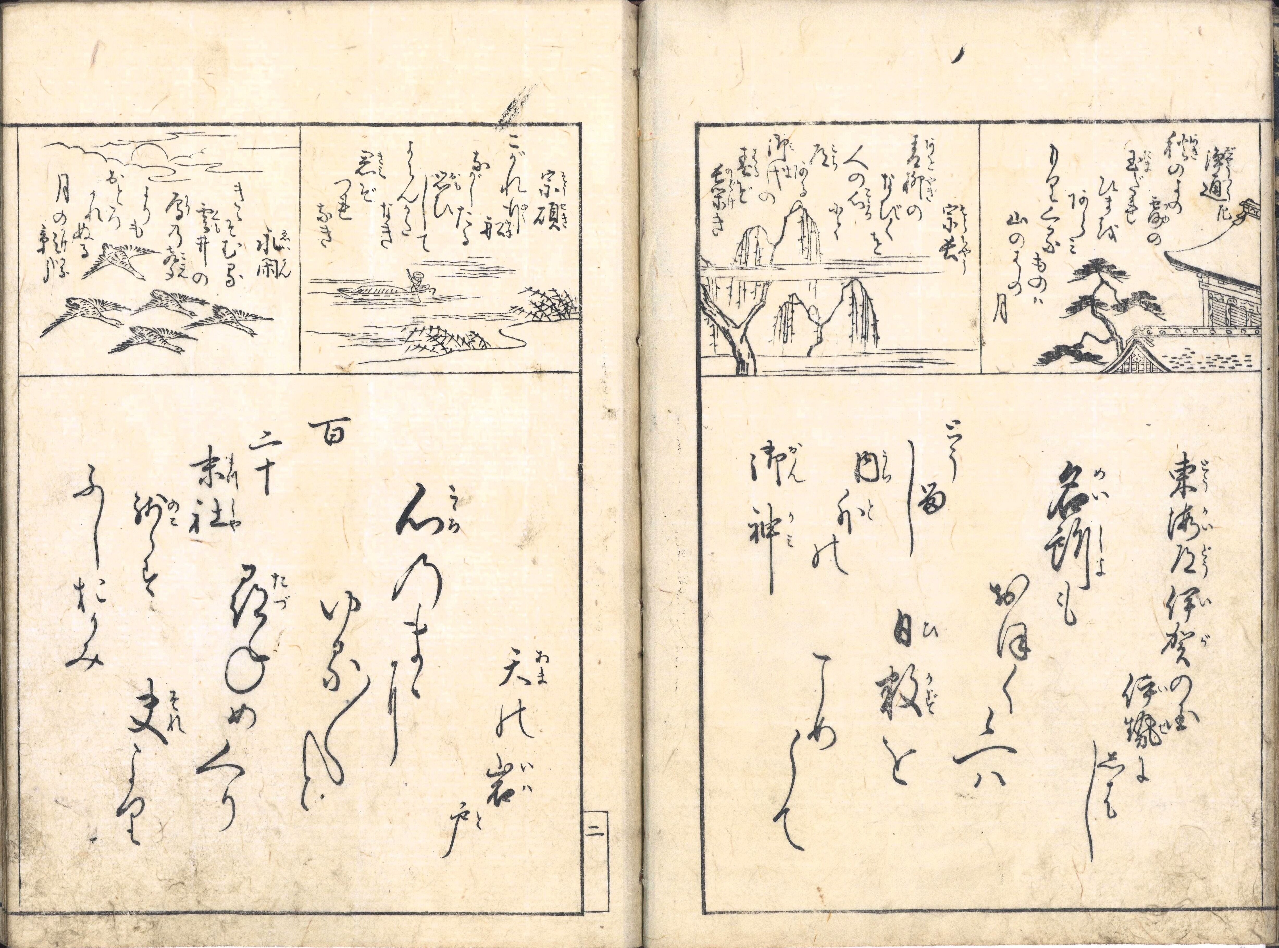 【備考】分類「往来物」。同板2種を全冊収録(後者は袋綴じ展開収録(見開き図再掲))。『女文章国尽』は、「兼てよりしめし合せし日のもと六十余州国めぐりの御事、名所もおほく候へば、日数をこめ候て心のまゝにゆるゆると尋ねめぐり、夫より二見朝熊(アサマ)へかけ、古市の芝居も、結句都よりは鄙びておもしろく候はんまゝ…」と起筆して、日本六十余州の国名を美文体で綴った往来物。本文は宝暦12年刊『女筆初瀬川』と同内容。ただし『女筆初瀬川』と異なり、本書の散らし書き(大字・所々付訓)は雁行様・立石様を織り交ぜ変化に富む。巻頭に平安貴族の挿絵4葉、頭書に「集外歌仙」「万落し物秘伝」の記事を載せる。なお、寛延4年原板・寛政8年再刊『女文選料紙箱』のように、本書を合綴した『百人一首』も数種刊行されている。