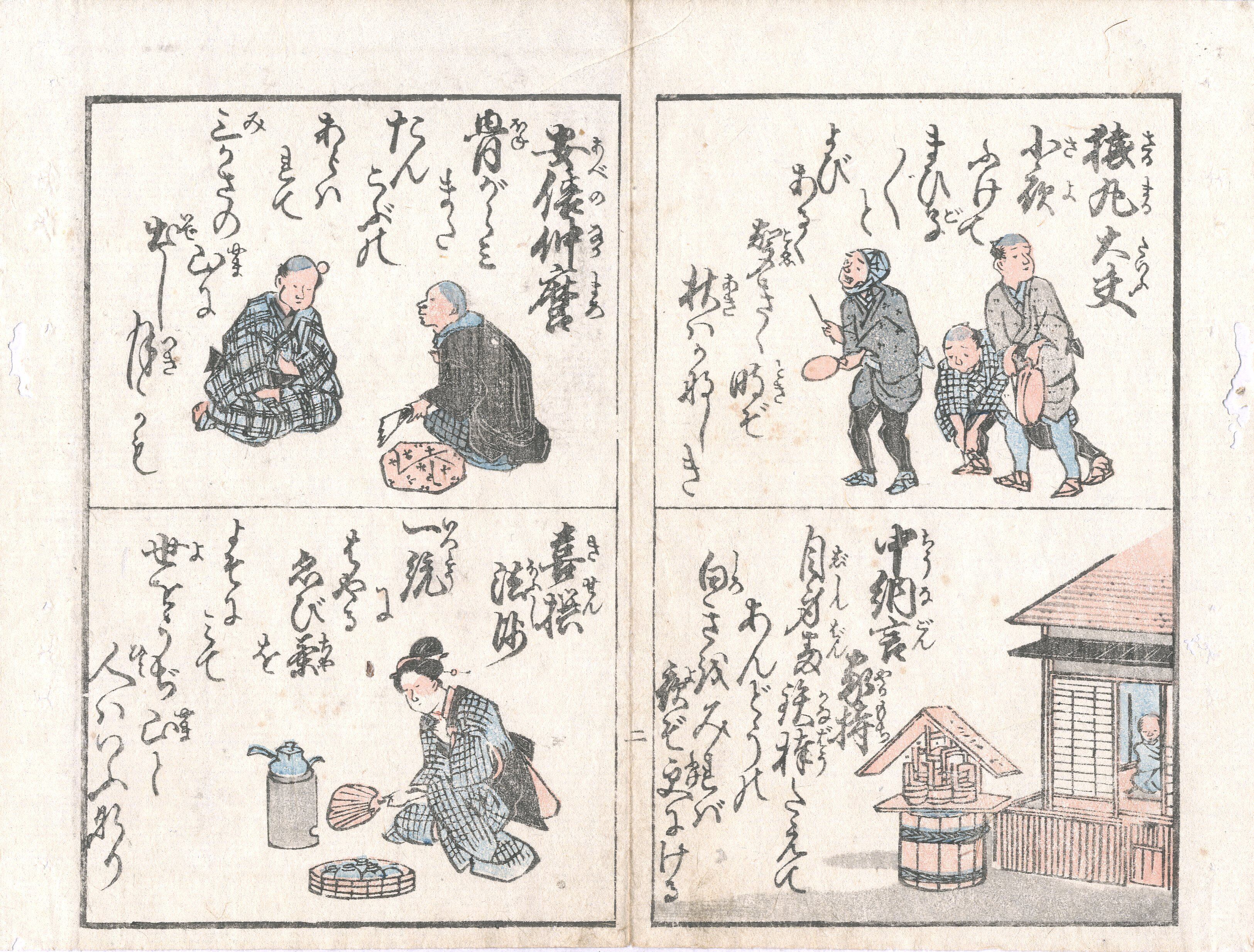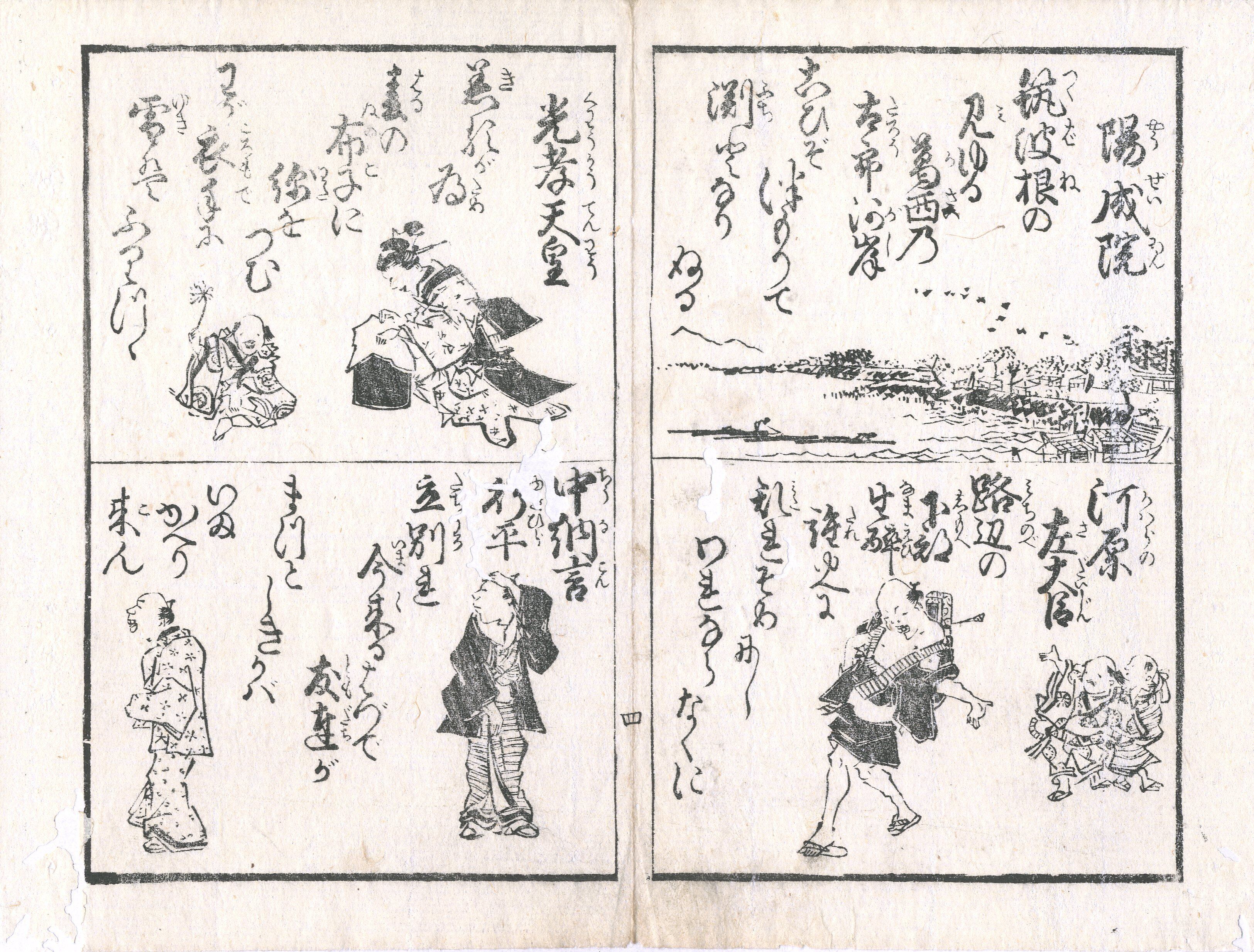 【備考】分類「百人一首」。袋綴じ展開収録。巻頭2丁は色刷り。小倉百人一首のもじり本(パロディ本)。半丁に上下二段2首ずつ配置し、天智天皇「広ぶたを前にお酌は手をのばし、わが衣では露にぬれつゝ」から、順徳院「梅やしき古き軒端の花の香は、猶あまりあるむかしなりけり」までの百首を収録する。