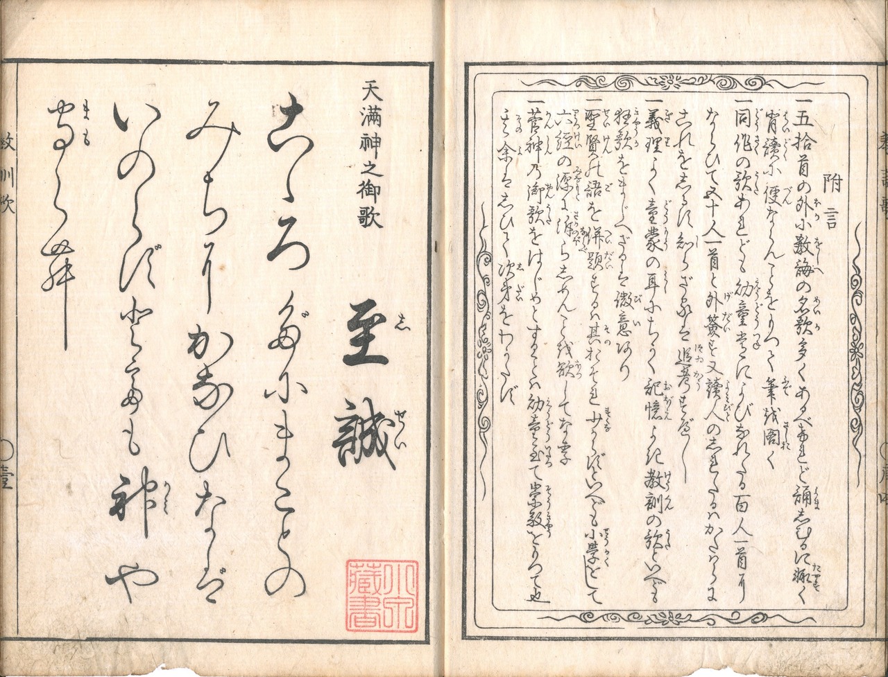 【備考】分類「心学」。早印本と後印本の2種を全冊収録した。本書は、「至誠/こゝろだにまことのみちにかなひなば、いのらずとても神や守らむ」のように童蒙教訓となる金言・格言とそれを敷衍する教訓歌50首を集録したもの。教訓歌の主題は至誠・明徳・学問・性善・孝・恕・節操・柔・忍・知足・慈愛・三省等々で、所々、歌人名を小字で付記する。巻頭口絵に「童蒙手習い図」と「婦女子読書の図」の2葉(見開き2丁)と、「附言」半丁を掲げる。同附言によれば、道歌は無数にあるが、諳誦しやすい点を重視して50首に絞ったこと、外題は幼童にも通じた『百人一首』にならったこと、道歌の作者も極力明記し、聖賢の語により各首に標題を付けたことなどを記す。また自序では、子供のみならず、子供の傍らで大人も本書を学べ日常生活で実践すれば裨益大なりと奨励する。なお、奥付予告の『〈釈教名歌〉五拾人一首』は未刊である。
