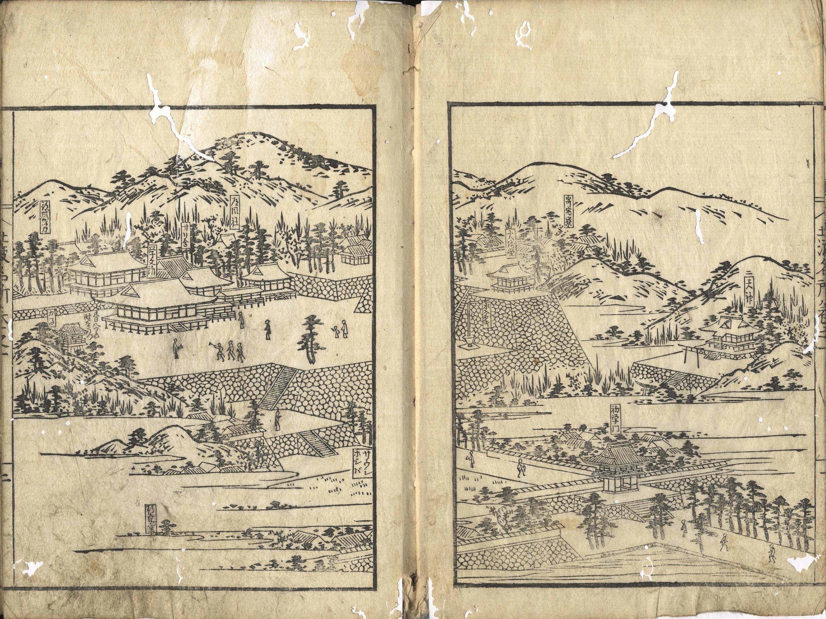 【年代等】享和2年2月刊。[京都]円屋源八郎ほか板。【備考】分類「心学」。人間一生の心得を名所廻りの旅路に見立てて説いた戯文(ぎぶん)で、見開き挿絵を随所に掲げて名所図会風に作る。もと全10卷の構想だったが、「児輩の耳目に納得しやすき」5巻を上梓したという。