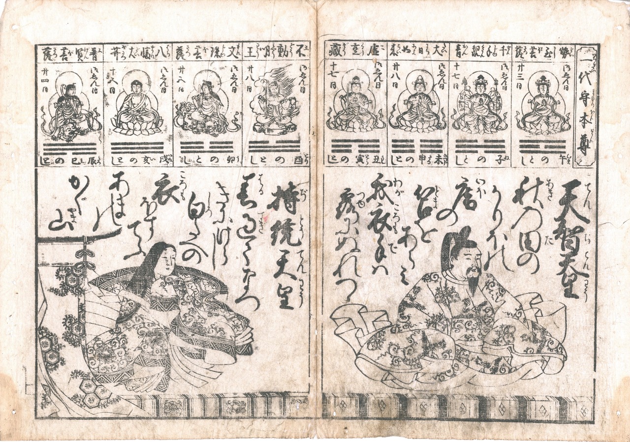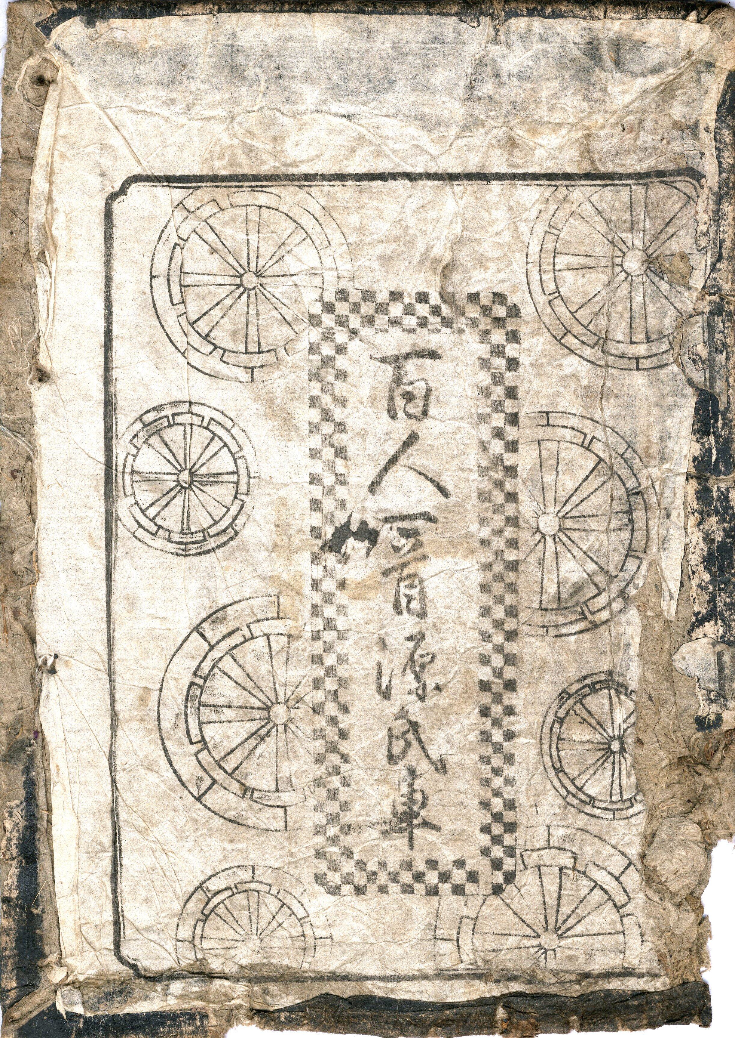 【備考】分類「百人一首」。口絵に「六歌仙」と王朝貴族の図など2葉。本文上欄頭書に「一代守本尊」「不成就日」「灸の忌日」「四季皇帝の占」「男女相生」「六十図」「人間一生の祝儀」「懐胎十月教歌」「倭こと葉(大和詞)」「折形」「いろは教訓歌」「書初詩歌」「七夕詩歌」「風俗心得」「名頭字尽」「状の封やう」「十二月異名」「御改正服忌令」を収録。