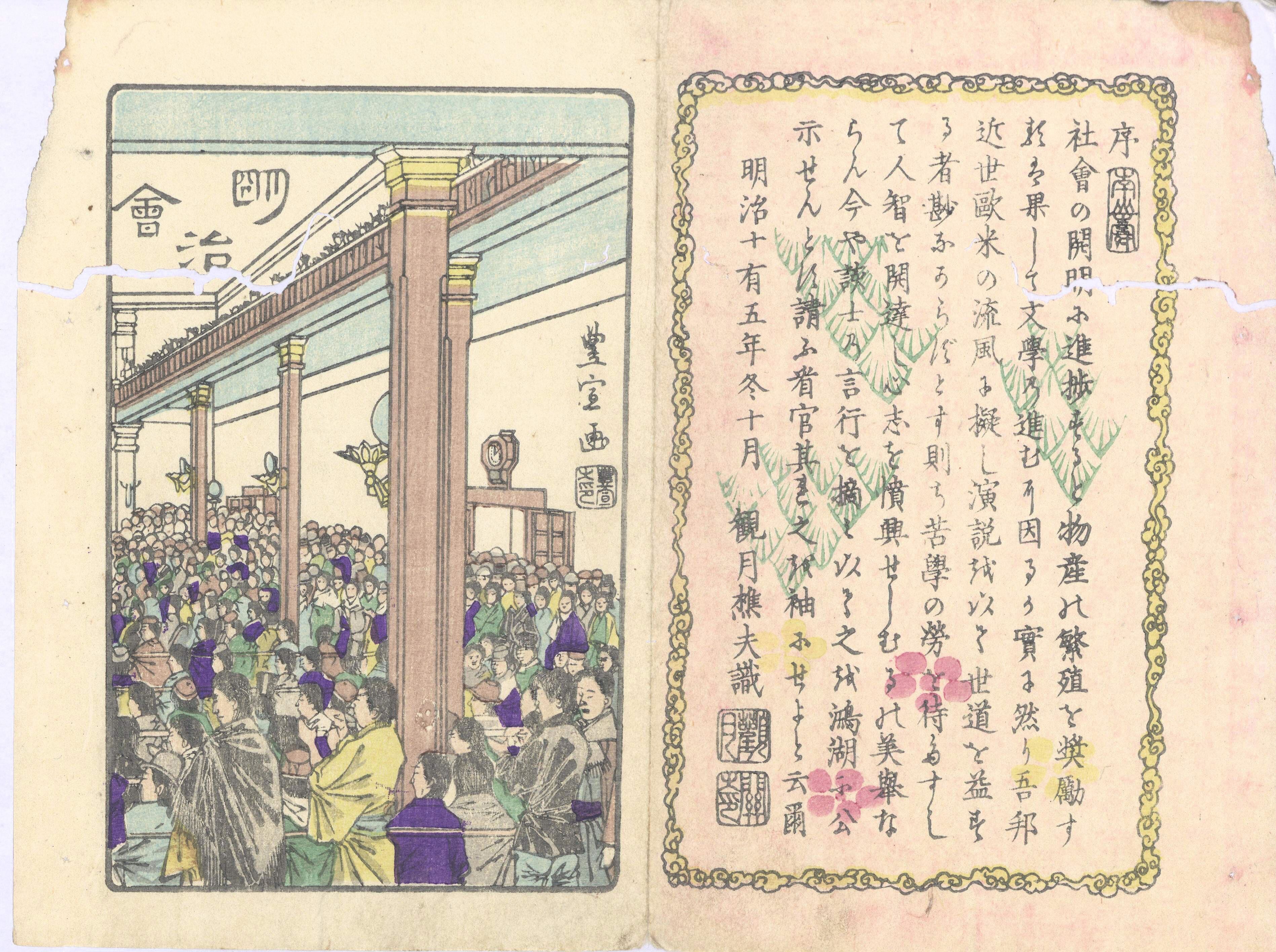 【備考】分類「百人一首」。全2巻の上巻1冊。袋綴じ展開収録(見開き図再掲)。『〈愛国民権〉演説家百詠選』は、当時の著名な政治演説家100人の詠歌を集めた異種百人一首。第1首「ことやまの 紅葉をたづね ゆかんより あふぐ高根の あけの玉垣」(板垣退助)から、第100首「いろいろの 草木はなべて おもしろく 匂ひそめぬる 梅のひと枝」(大隈重信)までを収録し、頭書に作者の略伝を掲げる。巻頭に色刷口絵「明治会堂演説之図」と、明治15年4月6日の板垣退助暗殺未遂事件(岐阜事件)のあらましを掲げる。
