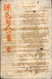 【備考】分類「百人一首」。同板2種を全冊収録。袋綴じ展開収録(見開き図再掲)。『源氏百人一首』は、「源氏五十四帖かな文」「百人一首「女今川」「女国尽」を合綴した往来物。冒頭部「源氏五十四帖かな文」7丁は色刷り。