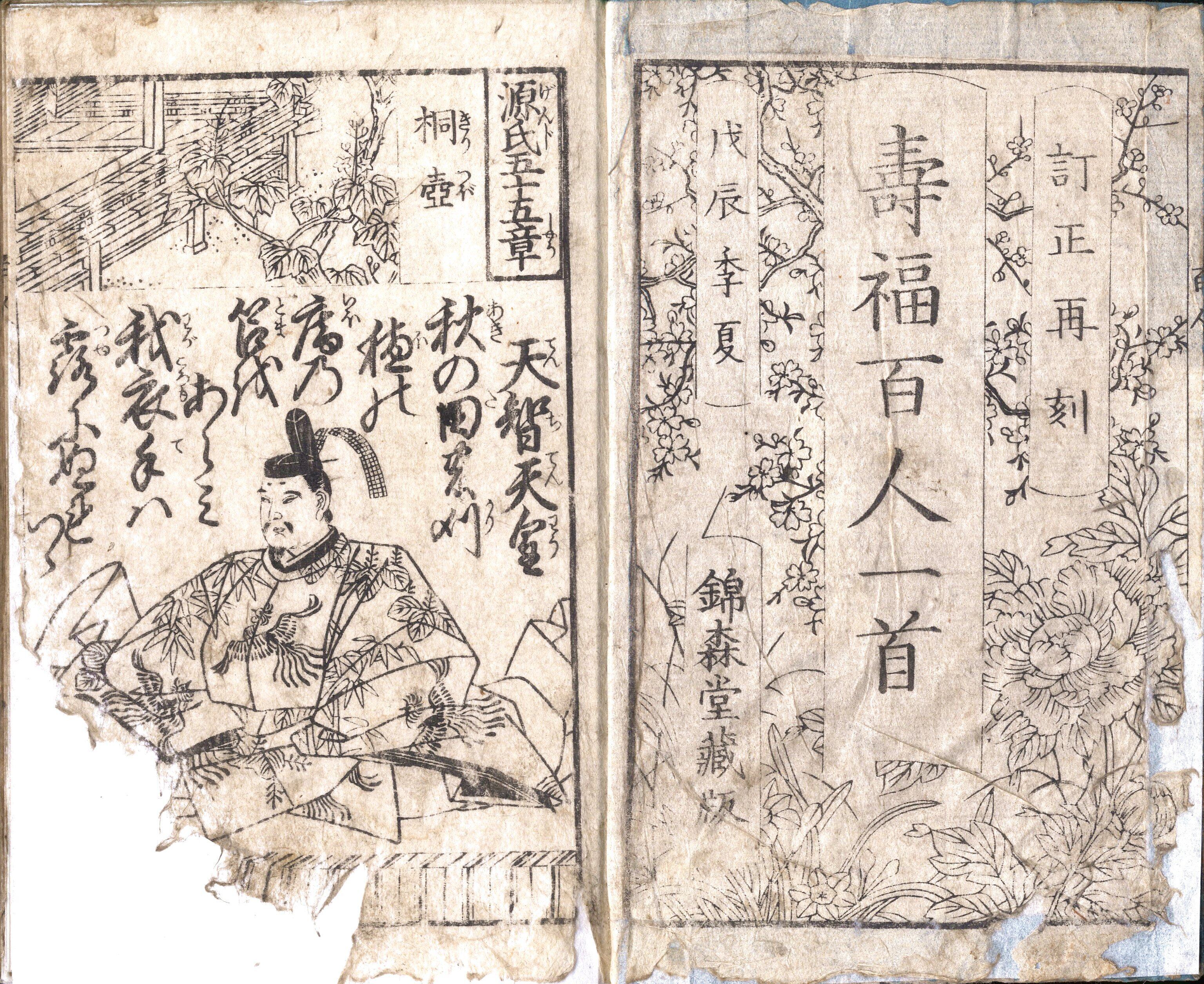 【備考】分類「百人一首」。『寿福百人一首』は、小倉百人一首を本文欄に1首半丁ずつ掲げ、頭書に「源氏五十五章」「大和言葉大概」「七夕詩歌づくし」「婚礼之式法」「五節句之由来」を載せる。