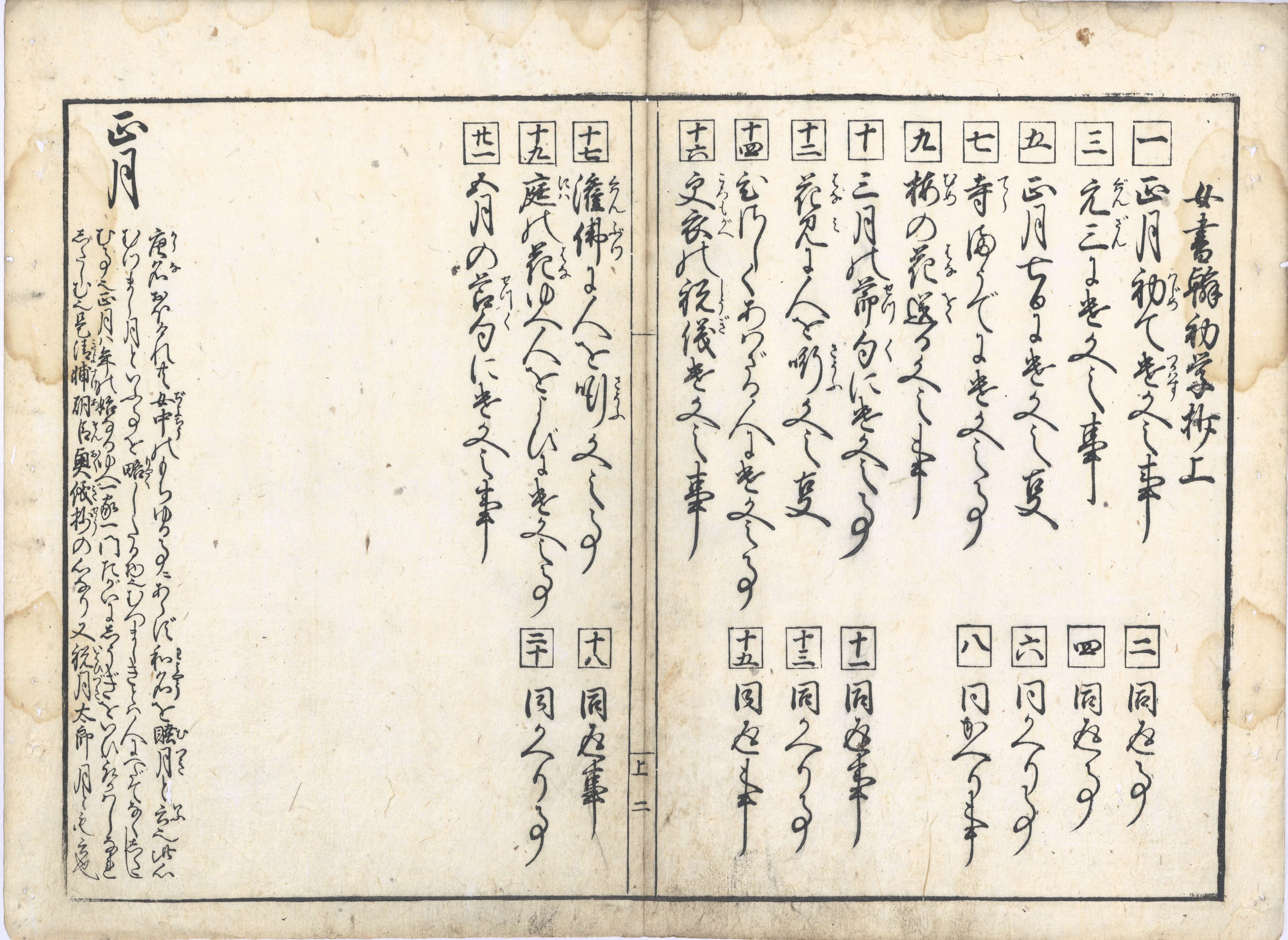 【備考】分類「往来物」。早印本2種(初刷り2巻(中巻欠)とやや後印3巻本)を全冊袋綴じ展開収録。『女書翰初学抄』は、ある人の求めに応じて女子手習いの手本として居初津奈が著わした女用文章。例文を月次順に配列し、上巻は1~5月の例文(「正月初て遣文之事」以下21通)、中巻は5~10月の例文(「五月雨に遣文之事」以下21通。ただし、第16状「紅葉を送る文之事」の返状は頭書欄に掲載するため、これを含めると22通)、下巻は11~12月の例文(「雪のふりたる時遣文之事」以下15通)と付録記事6項から成る(全57通収録)。四季時候の手紙を主とするが、用件中心の例文や弔状なども含む。上巻のほとんどが散らし書きなのに対して、中・下巻は大半が並べ書きである。本文の要語に振り仮名や漢字表記、略注などを添えており、特に頭書注釈が広範かつ詳細(類語や出典も明記)なのは、女筆手本中随一。また、下巻末に「女中詞遣字尽」「文かきやうの指南十ヶ条」等の記事を載せる。本書は後続の女用文章に多大な影響を及ぼし、付録記事を改めただけの改題本・改刻本として、元禄11年刊『女用文章大成』、元禄12年刊『当流女筆大全』、享保6年刊『女文庫高蒔絵』、元文3年刊『女文林宝袋』、宝暦5年刊『女通要文袋』の5本があるほか、元禄10年刊『女万用集』にも本書の大半を収録する。 SE01489