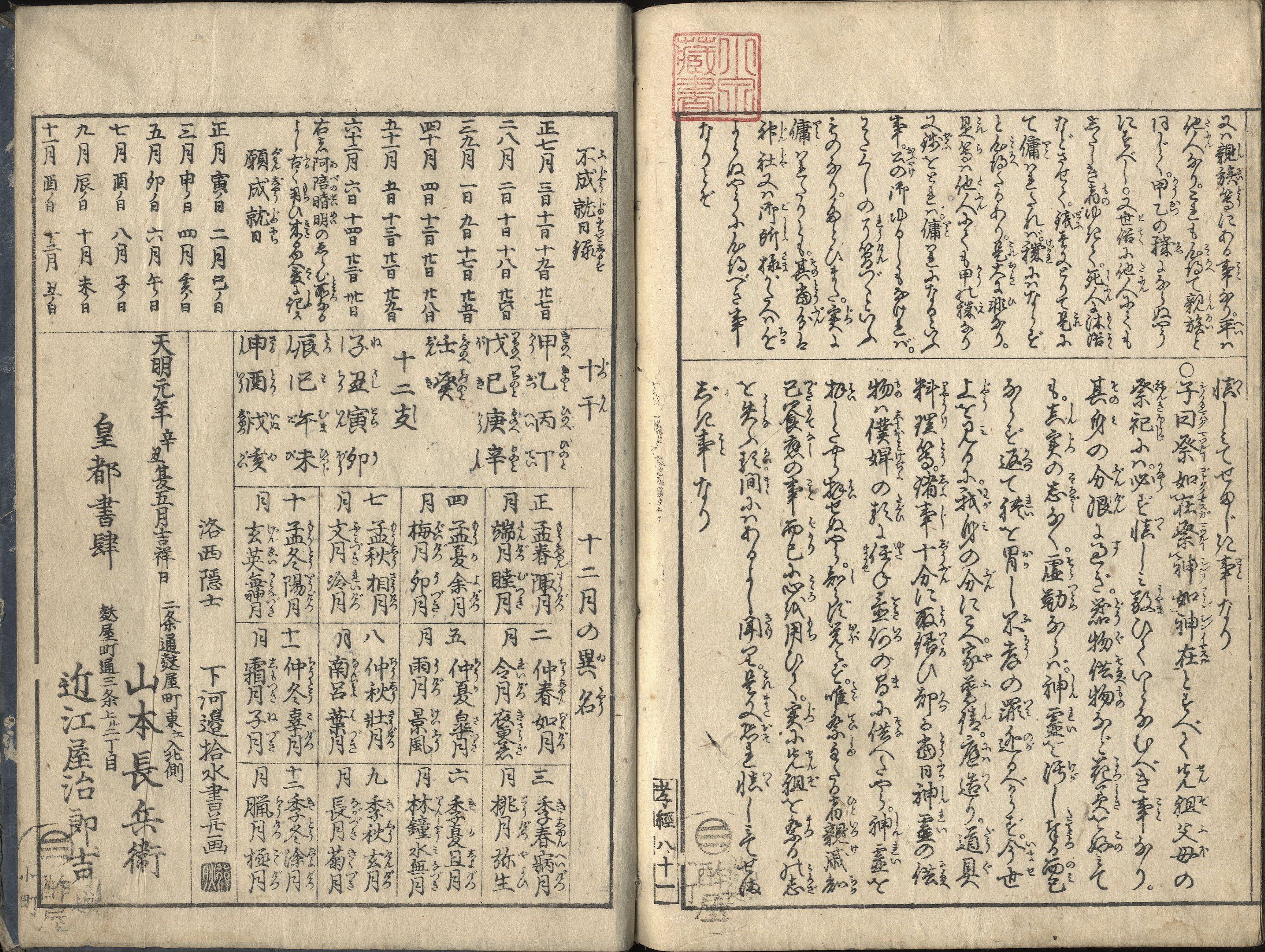 【年代等】安永8年または天明元年刊記。寛政頃初刊([京都]炭屋勘兵衛ほか板)。嘉永6年9月再刊([京都]俵屋清兵衛ほか板)。