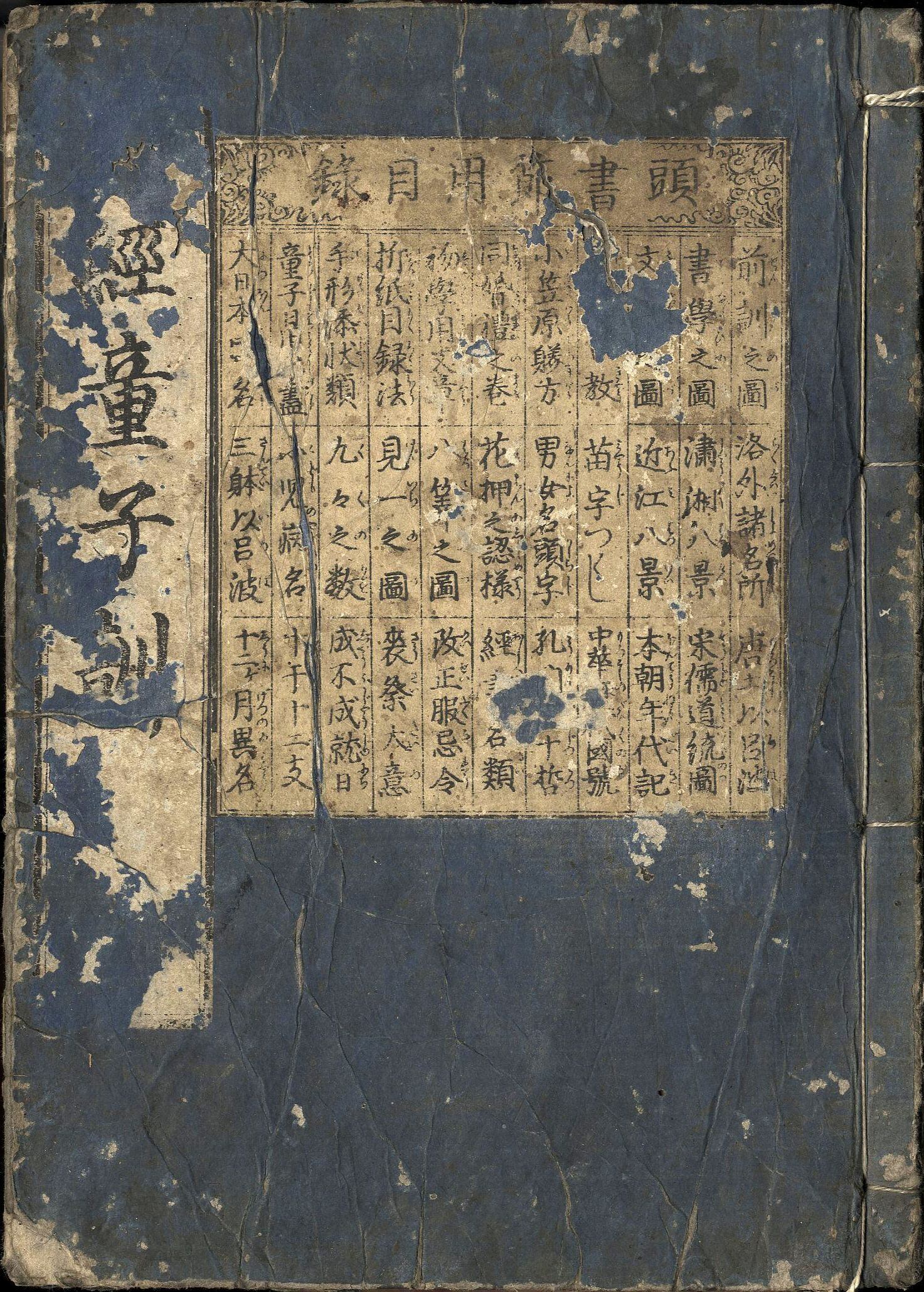 【備考】分類「往来物・心学」。天明板・嘉永板各2種の合計4種を収録。天明板系統のうち安永8年の刊記は『女前訓躾種』の流用。天明板系統は、巻末年表より寛政元年以降の刊行と推定される。『孝経童子訓』は、石門心学者による往来物・心学書の一つ。本文は文字通り『孝経』の平易な和解で、『孝経』本文を1、2句毎に大字・6行大・付訓で記し、続いて、字下げした小字・2行割注様の注釈文で字義や各句の大意を詳述する。本書は付録記事が多彩で、巻頭に「前訓の図」「書学之図」「文房之図」を掲げ、頭書に手島堵庵作「前訓」を始め、「小笠原流躾書抜粋(30カ条)」「婚礼巻抜粋」「初学新用文章(消息例文・証文手形文例52通と目録その他書法)」「童子日用字類(諸道具・衣服織物・諸木・草花・野菜・諸魚并貝・諸鳥・諸獣・諸虫の9分類の日用語集)」「大日本畿内七道国名」「諸姓氏抜粋」「男女俗称字類」「算法略記」「小児病名略」を収録するほか、巻末にも「日本年代略記」等の記事を載せる。