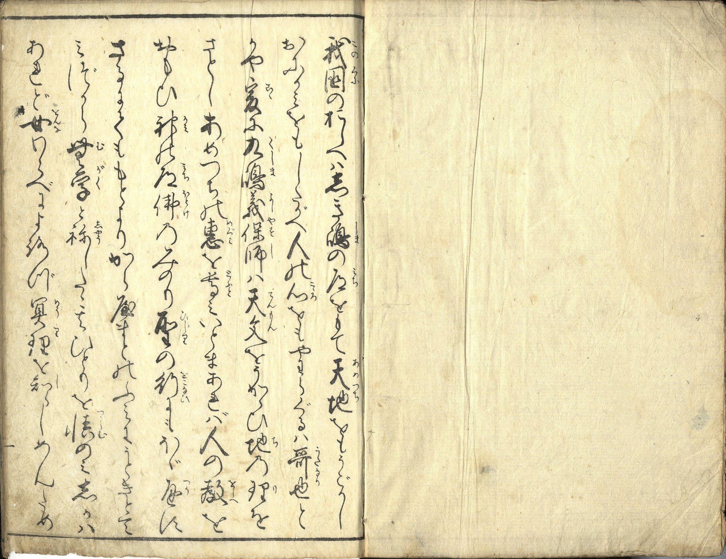 【備考】分類「心学」。糸綴じの関係でノド部分が完全に見えないため、袋綴じ展開画像も全冊収録した。寛政5年刊『天の恵』を大幅に改編した書。「六根清浄大祓」「よねのおほんめぐみ(米の御恵み)」「父のねざめ」「母のおしえ」「天満宮御遺訓(菅公道真誡書)」「一休和尚法語」「いろはうた」「神の恵(神のおほんめぐみ)」「魂鎮祓(たましずめのはらい)」等を収録。 『大阪書目』195頁に「天の恵 一冊/作者 天恵斎(大阪)/蔵板主 右同人/売弘 藤屋弥兵衛(高麗橋一丁目)/出願 文化六年三月/許可 文化六年五月二十七日」とある。