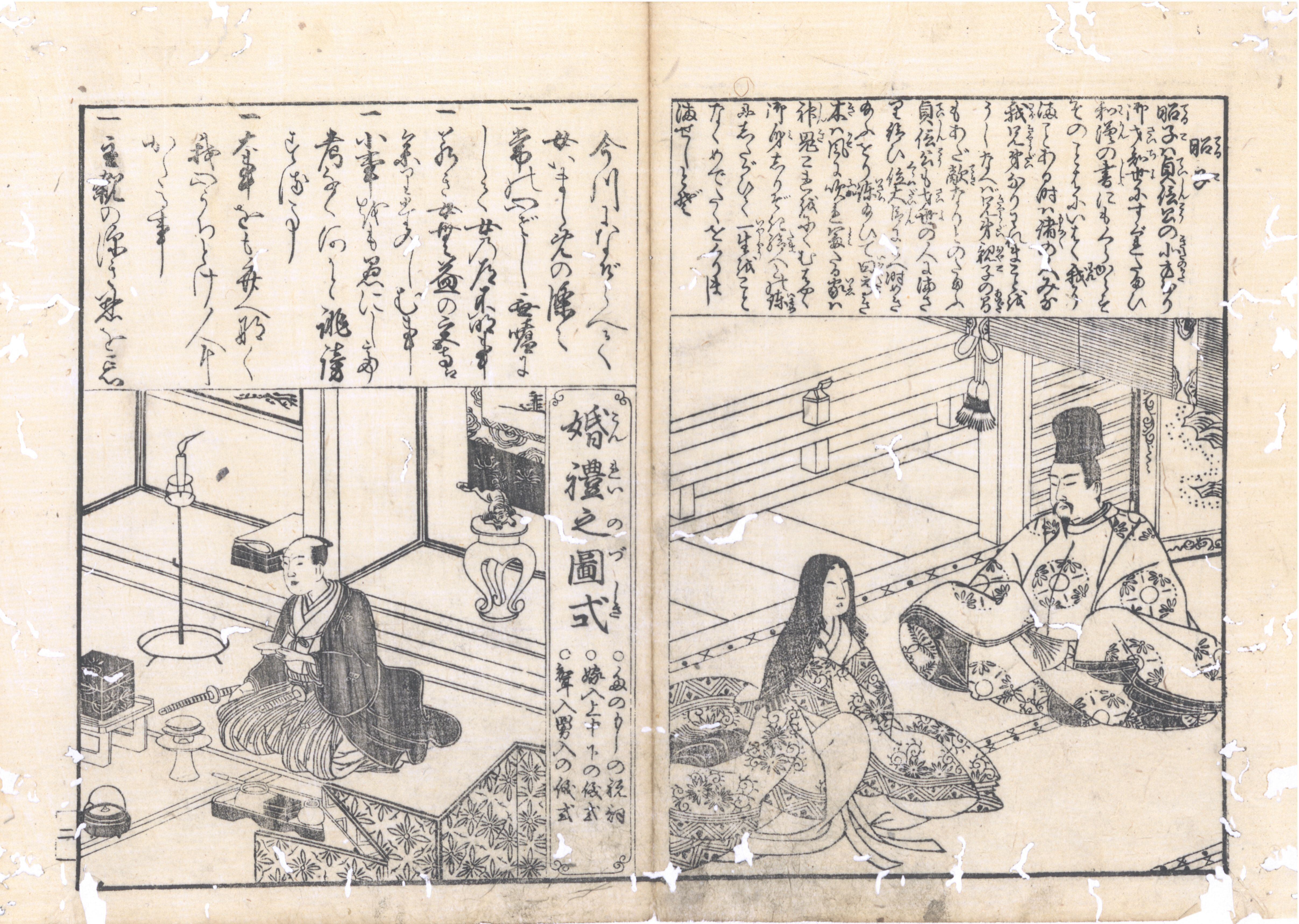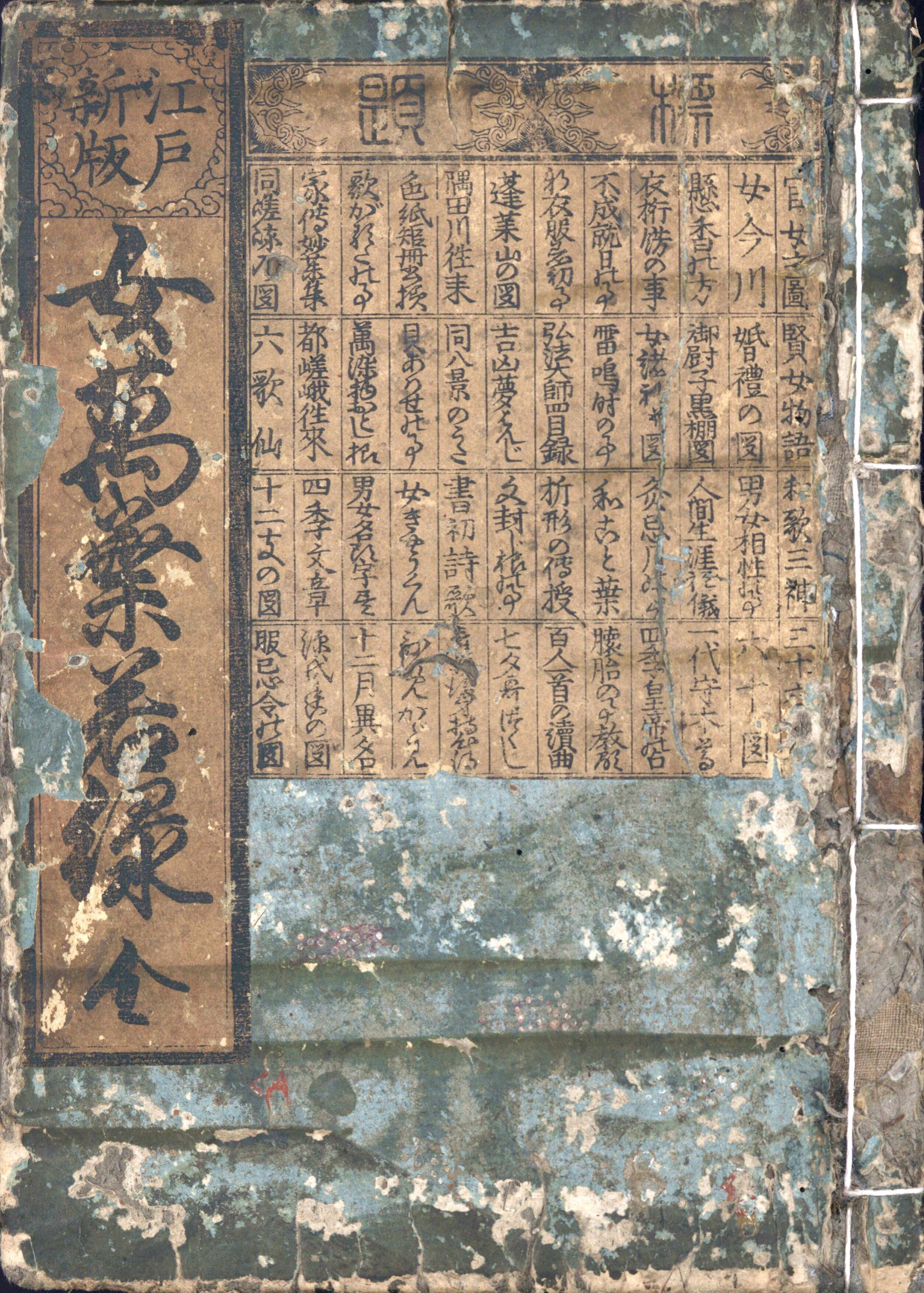 【備考】分類「百人一首」。袋綴じ展開収録(見開き図再掲)。『〈江戸新版〉女万葉若緑』は、頭書や前付に豊富な記事を収録した厚冊本の百人一首。本文に「女文章」「百人一首」「隅田川往来」「嵯峨往来」を収録し、巻頭口絵に「女子読書図」(色刷り)、前付に「紫式部ほか略伝」「女今川(貞享板系統)」「婚礼之図式」「懸香の方」「御厨子棚餝様」「黒棚之餝様」「衣桁飾の事」「源氏物語香図引歌」「女中ぶみのしをり」「六歌仙」「女諸礼絵抄」「不成就日之事」「弘法大師四目録のうらなひ」「蓬莱山の図」「ゆめはんじ」、頭書「和歌三神画図」「三十六歌仙図」「男女相性」「人間生涯祝儀」「一代守本尊」「灸の忌日」「四季皇帝の占」「倭こと葉」「懐胎十月教歌」「折形伝授」「百人一首よみくせ」「状の封やう」「七夕歌づくし」「書初詩歌」「産前後身持心得」「女鏡教訓草」「名頭文字尽」「十二月異名」「隅田川八景」「色紙短冊の書様」「貝合・歌がるたの図」「万しみ物おとし様」「家伝妙薬集」、裏表紙見返しに「十二支之図」「九族之図」を掲げる。