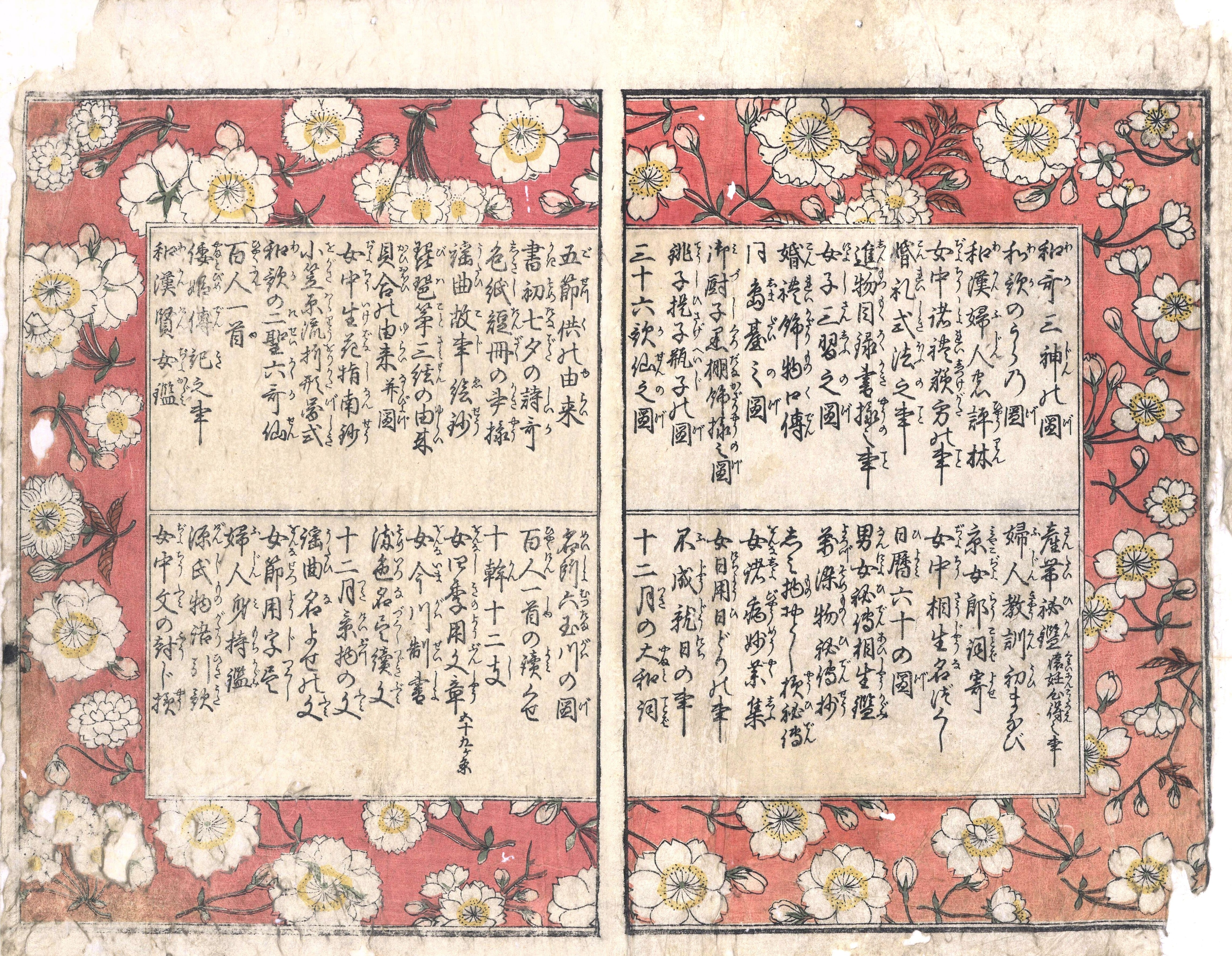 【備考】分類「百人一首」。袋綴じ展開収録(見開き図再掲)。『〈百人一首・女用文章〉女遊学操鑑(文化13年)』は、「百人一首」と「女用文章(四季文づくし)」を合綴したうえに種々の付録記事と収録した往来物。巻頭に「和歌之三神」など色刷り口絵2葉を掲げ、前付に「婦人評林」「女宗が貞節」「染殿皇后」「鄙卑が妻」「典侍直子」「女一宮紀伊」「たらし姫」「女中諸式礼」「祝言之式法」「結納進物目録次第」「女子之三習」「婚礼聟方之式法」「三十六歌仙之図」「御厨子・黒棚飾様之図」「祝言銚子・提子・瓶子之図」「五節句の事」「書初并七夕之詩歌」「色紙・短冊書様之事」「琵琶・琴・三味線の図并由来」「貝合の事并ならべ様の図」「女中生花の図」「小笠原流折形図」「和歌二聖人之像」「六歌仙」を掲げ、「百人一首」の頭書に「伊勢斎宮倭姫伝記」「和漢賢女鑑」「産帯秘鑑」「婦人諸教訓」「京女郎詞よせ」「女中相生の名尽」「新撰六十図」「男女相生鑑」「万染物の秘伝」「万しみ物おとし様」「婦人諸病妙薬尽」「婦人日用日取の事」「不成就日」「十二月大和言葉」「六所之玉川」「百人一首読人并歌のよみくせ」「十干之図」「十二支之図」を載せる。また、後半の「女用文章(四季文づくし)」は、宝暦13年刊『〈万宝調法〉女用文文庫』(西川祐信画)と同内容で、全て散らし書きで、「初春の文」~「年の暮の文」の11通(いずれも五節句・四季に伴う内容)と、「あらましの文」~「金銀もたせ遣す文・同返事」の往復40通(季節の見舞状、通過儀礼に伴う文、貸借・贈答・取引に関する文など)を載せる。ただし頭書は一新しており、「今川になぞらへ女いましめの条々(貞享板系統『女今川』)」「染色名寄続文」「謡づくしの文」「十二月の文」「女節用字づくし」「婦人身持鑑」「源氏物語引歌」「女中文の封じ様并脇付」を収録する。
