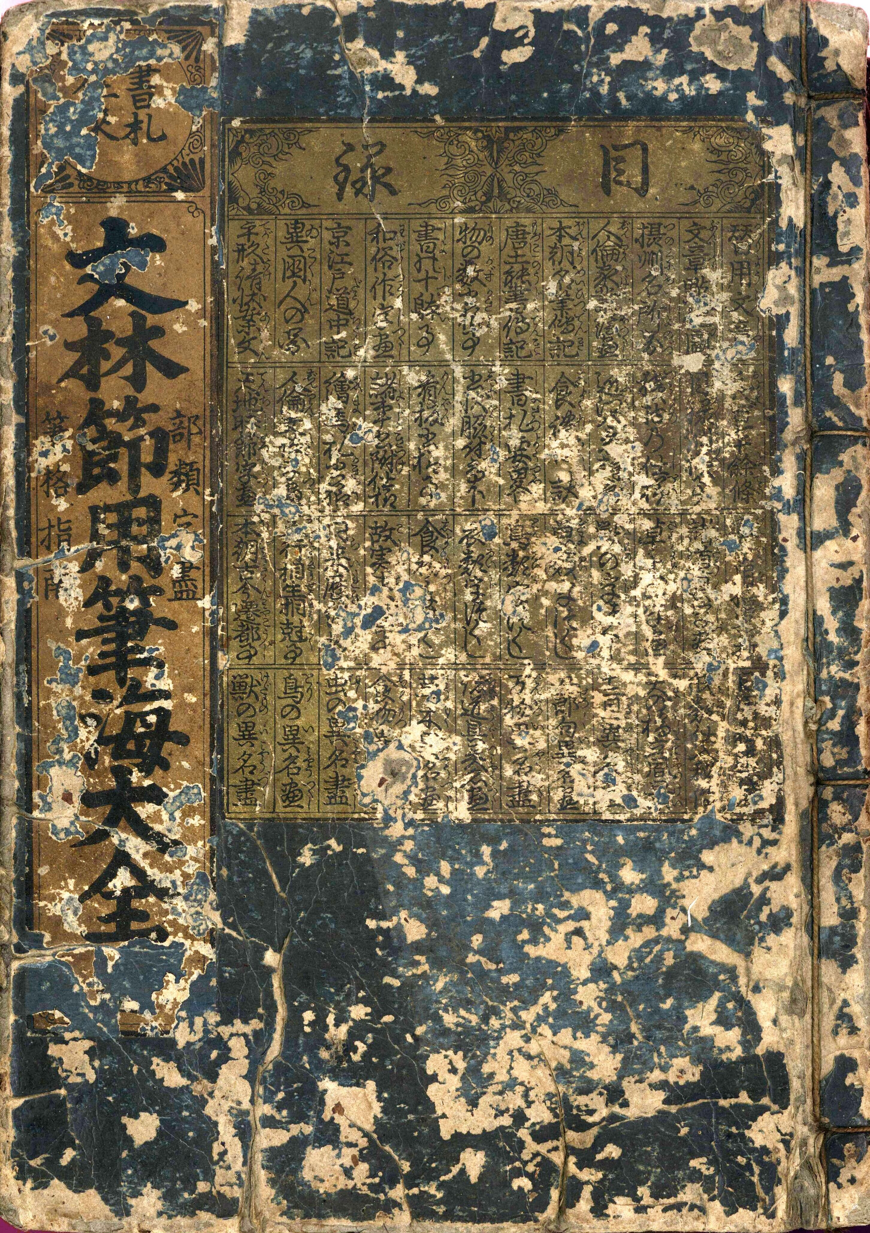 【備考】分類「往来物」。袋綴じ展開収録(見開き図再掲)。また、同板の文政元年板も抄録。『〈書札往来〉文林節用筆海綱目』は、享保2年初刊『〈万教訓・諸礼法・書札大成〉文林節用筆海往来』の改題本である延享4年刊『〈書札往来〉文林節用筆海綱目』の付録記事を再び改編した改題本。『文林節用筆海往来』は、「未逢人に遣す状」から「すそわけ物を遣状・同返事」までの286通を収録した最も浩瀚な用文章の一つ。各状とも比較的短文でほぼ同輩向けの例文となっており、これを短句に分けて大字・9行・付訓で記し、さらに割注形式で尊卑別の表現や略注を施す。書名の「節用」は、例文の配列や語彙集(頭書「節用字づくし」)で、『節用集』の如きイロハ分類を用いたことに由来し、例えば本文の「ホ」項で「奉公に出たる人に遣す状」「蛍見を催す状」「盆の祝儀につかはす状」「法躰したる人に遣す状」のように、主題の頭字によってイロハ分けするのが特徴。自序によれば、従来の用文章では例文が少なく、「四季の式目、若(もしく)は婚姻、饗応の躰をそふるのみ」であるのを不満に思い、「民間の文通すへき」例文の数々を収録したとする。『文林節用筆海綱目』は同書の付録記事、すなわち、前付・後付の全てと頭書の一部を改編したもので、前付に「文章貴点化与機杼」「摂津国名所図」「人倫家業絵尽」「飲中八仙歌」「和漢名筆略伝記」「物の数書様の事」「書の十体の事」「和俗制作字」「京・江戸道中記」「異国人の図」「手形請状案文」「進物并祝言・結納目録調様の図」「近江八景詩歌」「当流食礼口訣」「書札要略」「看板書様事」「暖簾書様事」「箱の書付仕様事」「歌書書様事」「扇詩歌書様事」「色紙・短冊書様」「掛物絵讃書様」「絵馬・札書様」「日用秘事袋」、頭書に「節用字づくし」「故実来歴事・同来歴絵抄」「鳥獣魚虫づくし」「衣食・道具づくし」「人倫支体づくし」「天地時節づくし」「文章用捨之聞書抄」「異名尽」、後付に「男女相姓之事」「十干十二支」等を載せる。