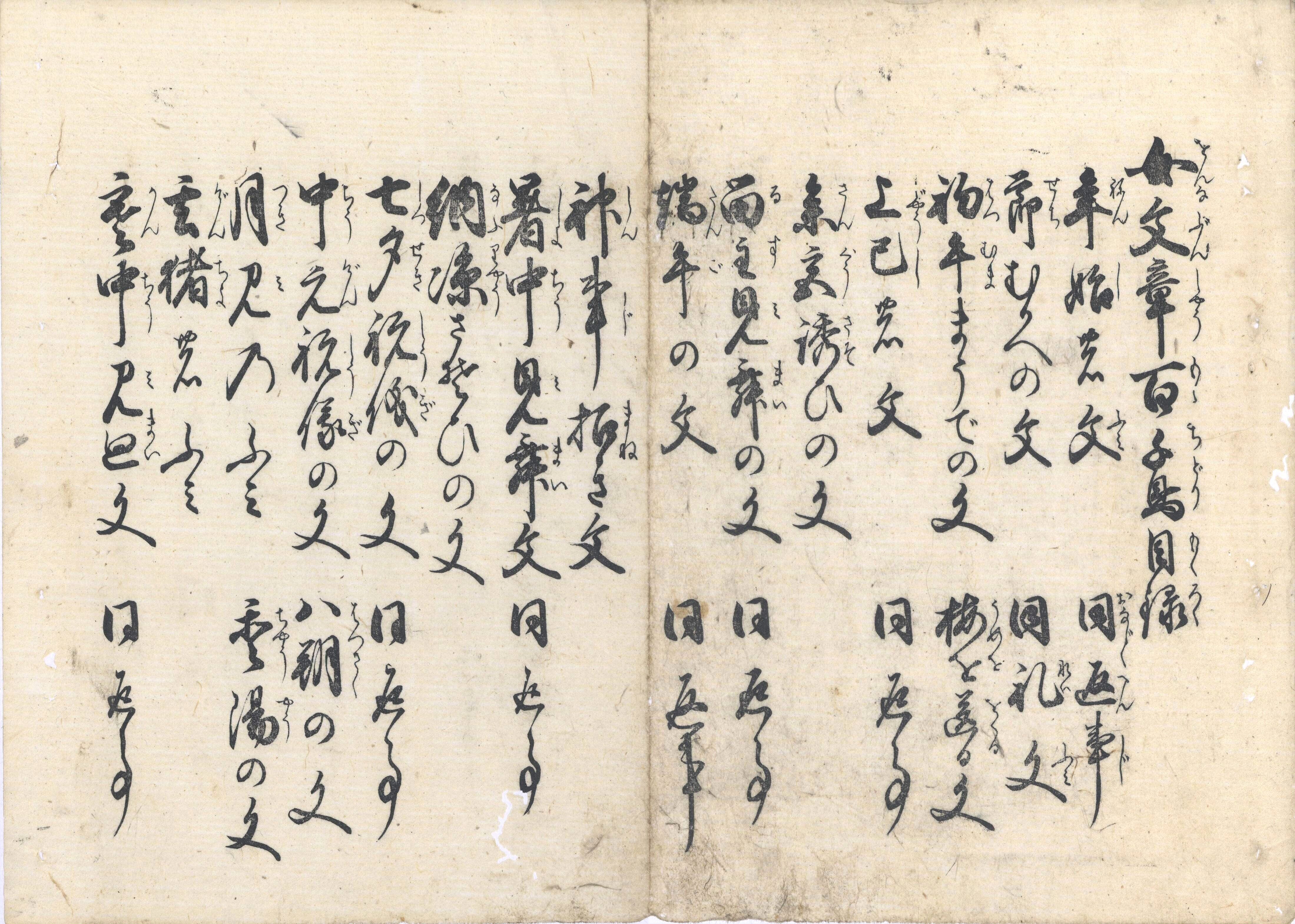 【備考】分類「往来物」。袋綴じ展開収録。刊年は見返しの書籍広告による。『女文章百千鳥』は、「年始の文」から「枡懸のふみ」までの48通の例文を収録した女用文章。概ね五節句や四季折々の手紙、各種祝儀状・見舞状等の順に収録し、各例文を大字・5行・ほとんど付訓で記す。