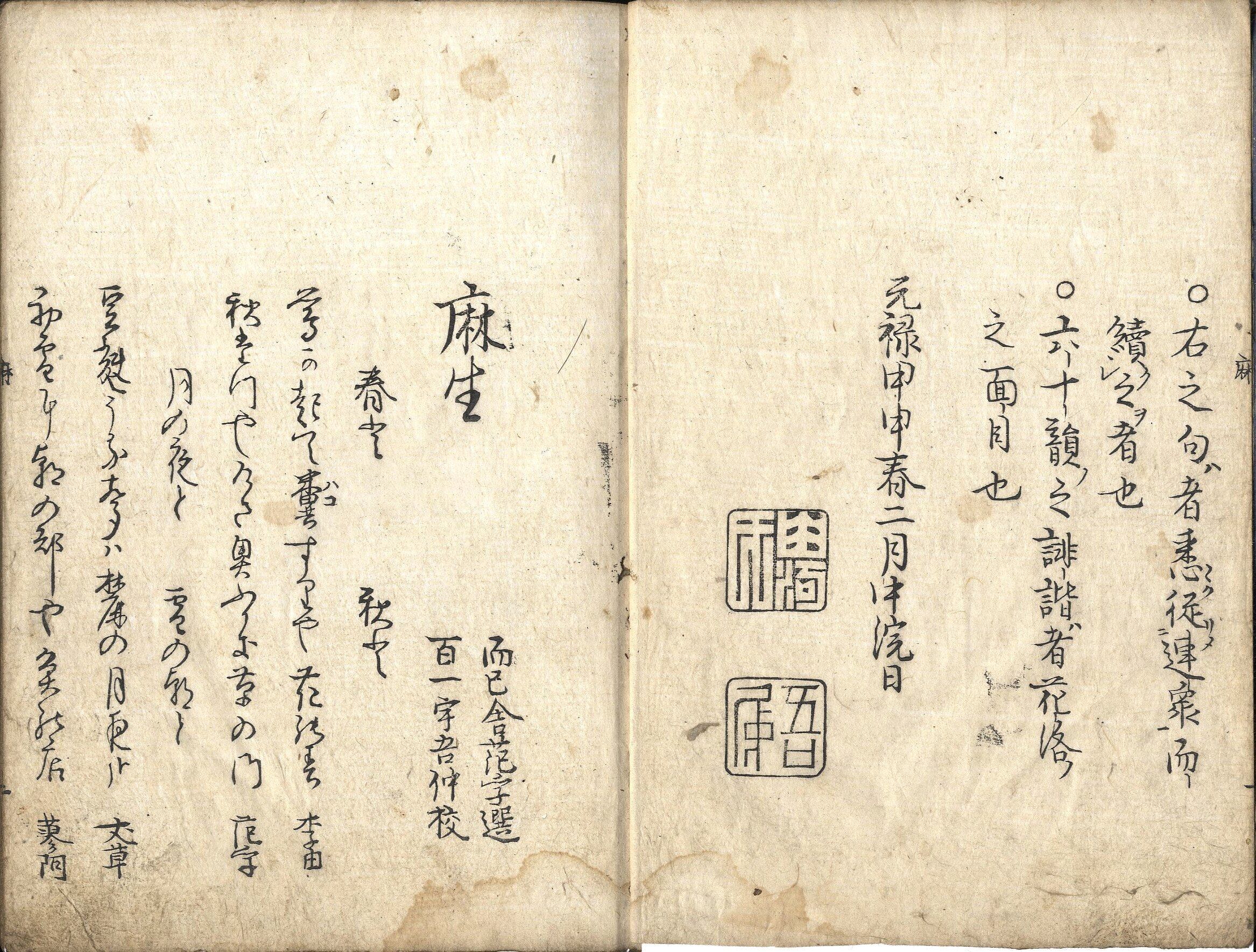 【作者】而已舎范孚ジイノヤ・ハンプ(支頤亭シイテイ)編、田河吾仲(百一宇)校、菊阿仏(森川許六キョリク・五老井)跋。
