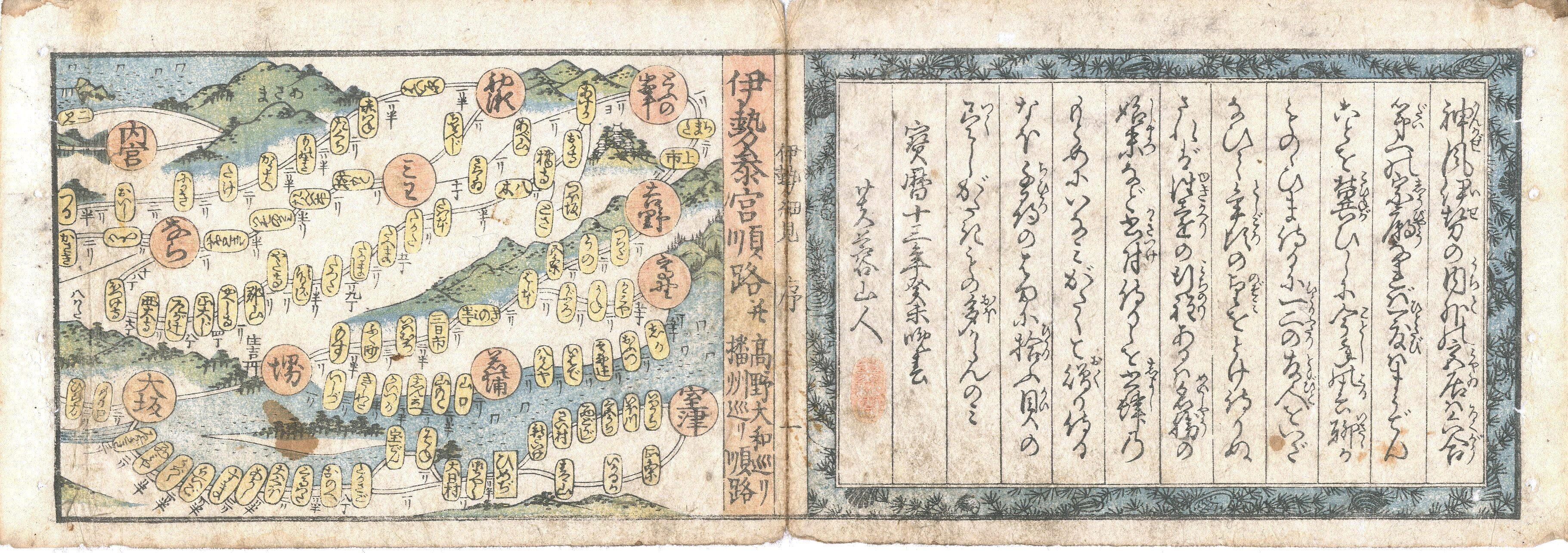 【備考】分類「地誌」。袋綴じ展開収録(見開き図再掲)。京都・大阪・江戸からの伊勢参宮の道法や沿道の名所や地誌などを略記した道中記。宝暦13年晩春の序文に、「今年の春、聊かものゝひま侍るに、一、二の友人をいざなひて年頃の望をとげ侍りぬ。されば、往還(ユキカエリ)の行程(ミチノリ)あるは名勝の始末など書付侍るゝを、書肆のもとめに」応じて上梓した旨を記す。巻頭に色刷り絵地図「伊勢参宮順路、并高野・大和巡り、播州巡り順路」を掲げる。また、巻頭で、伊勢参宮が本来「私に詣づる事を堅く禁じさせたまふ」ものであり、世間に横行する「抜け参り」等は言語道断の所業であり、伊勢参りは「主・親の許し」を得て行うべきものと戒める。