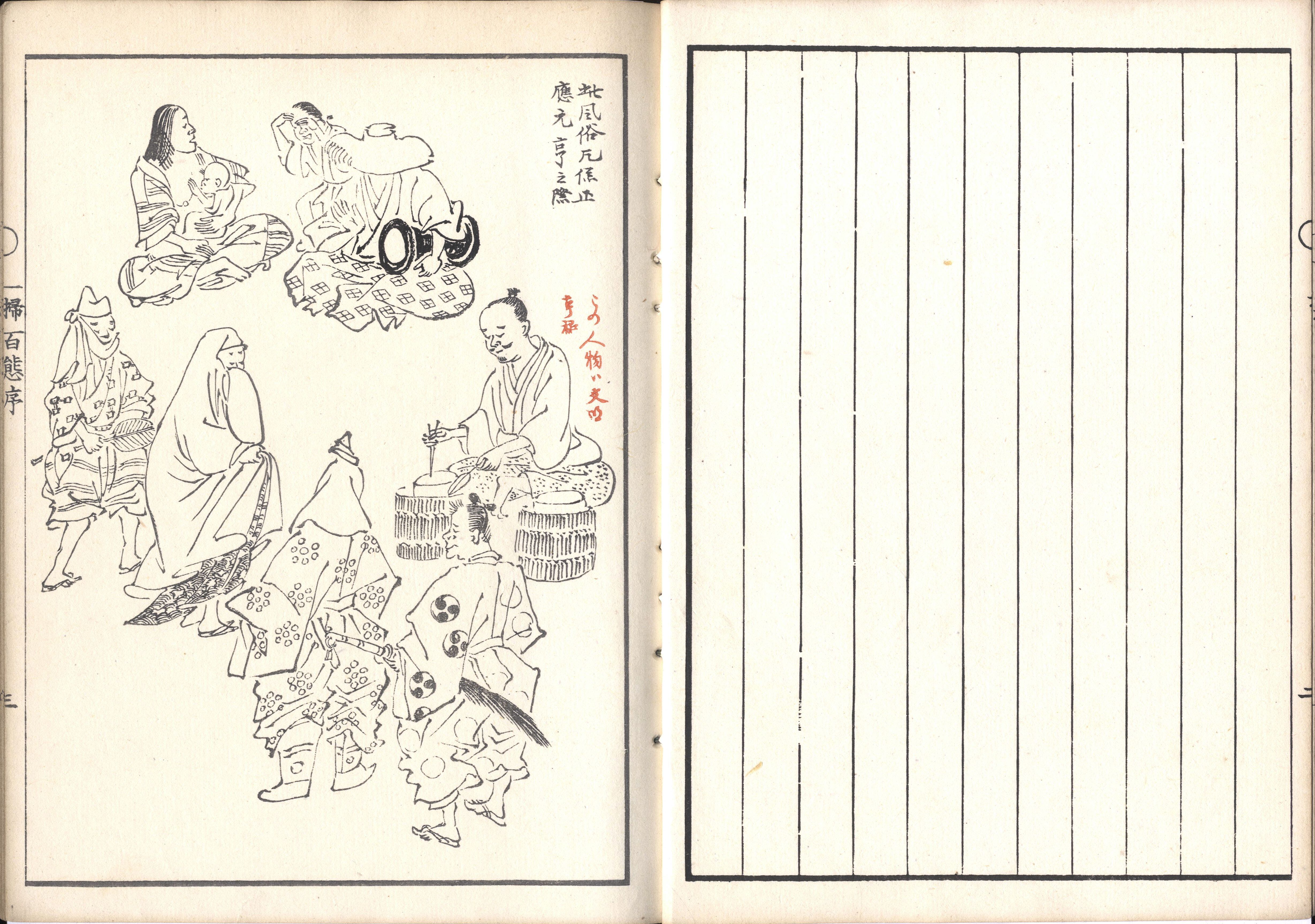 【備考】分類「絵画」。彫工:豊原堂。庶民風俗を活写した渡辺崋山の代表作。/鋭く速い筆でユーモラスに、しかも品のよさも感じさせる画図、これは、崋山が26歳の時に描いた作品である。鎌倉時代から江戸の明和時代(1764~72)に至るまでの古風俗10図、その当時の江戸の風俗41図により成る朱書きの入ったページもある稿本である。1日2夜かけてまとめ上げ、11月13日に出来上がったものである。古風俗より風俗の方が生き生きとして彩色されている。しかし最後の数ページには彩色されていないのは不思議である(田原市博物館HP)。SE01979