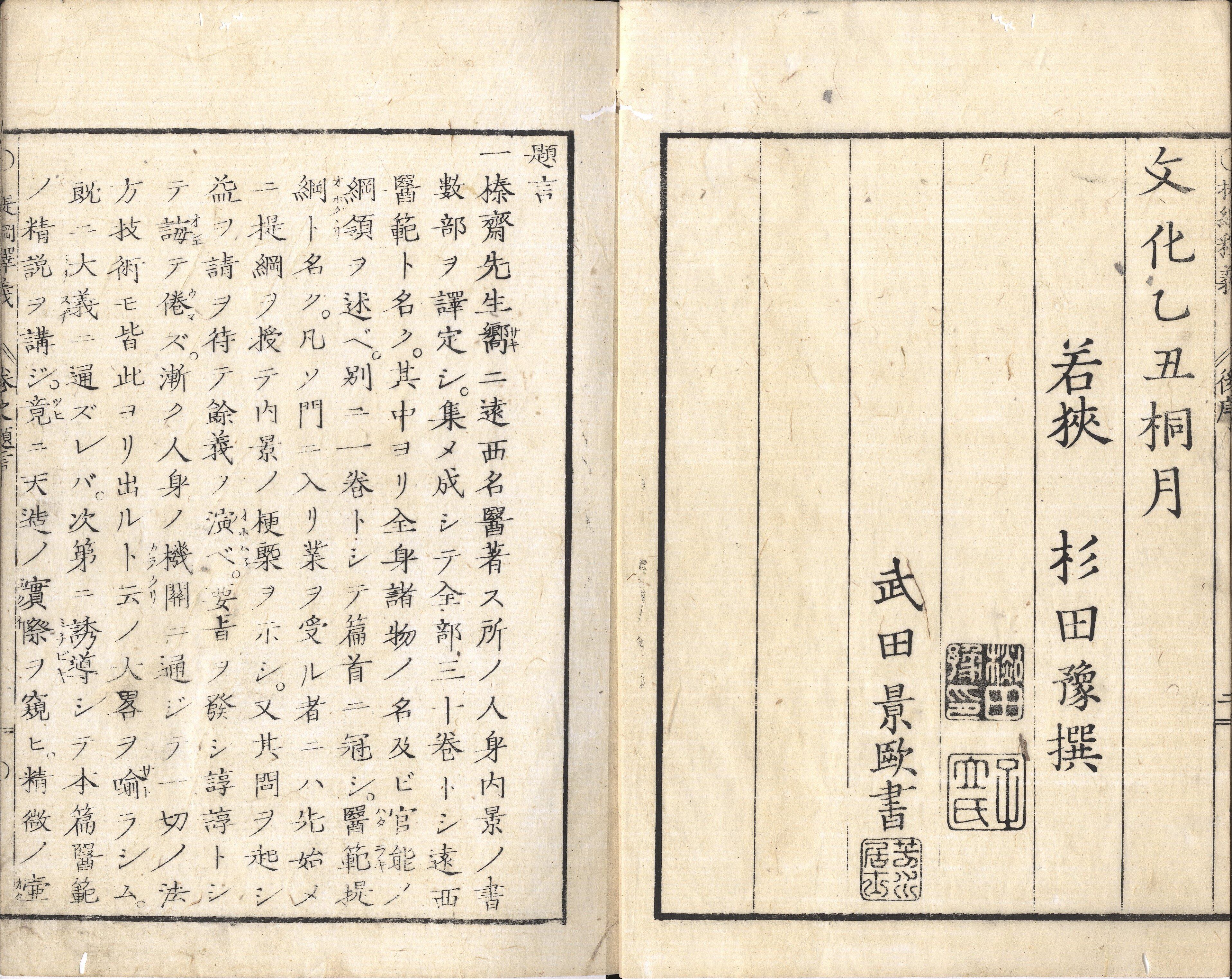 【年代等】文化2年2月、諏訪俊題言。同年3月、杉田勤(紫石)序。同年7月、杉田予序。江戸後期後印。[江戸]風雪堂蔵板。須原屋伊八(青黎閣)売出。