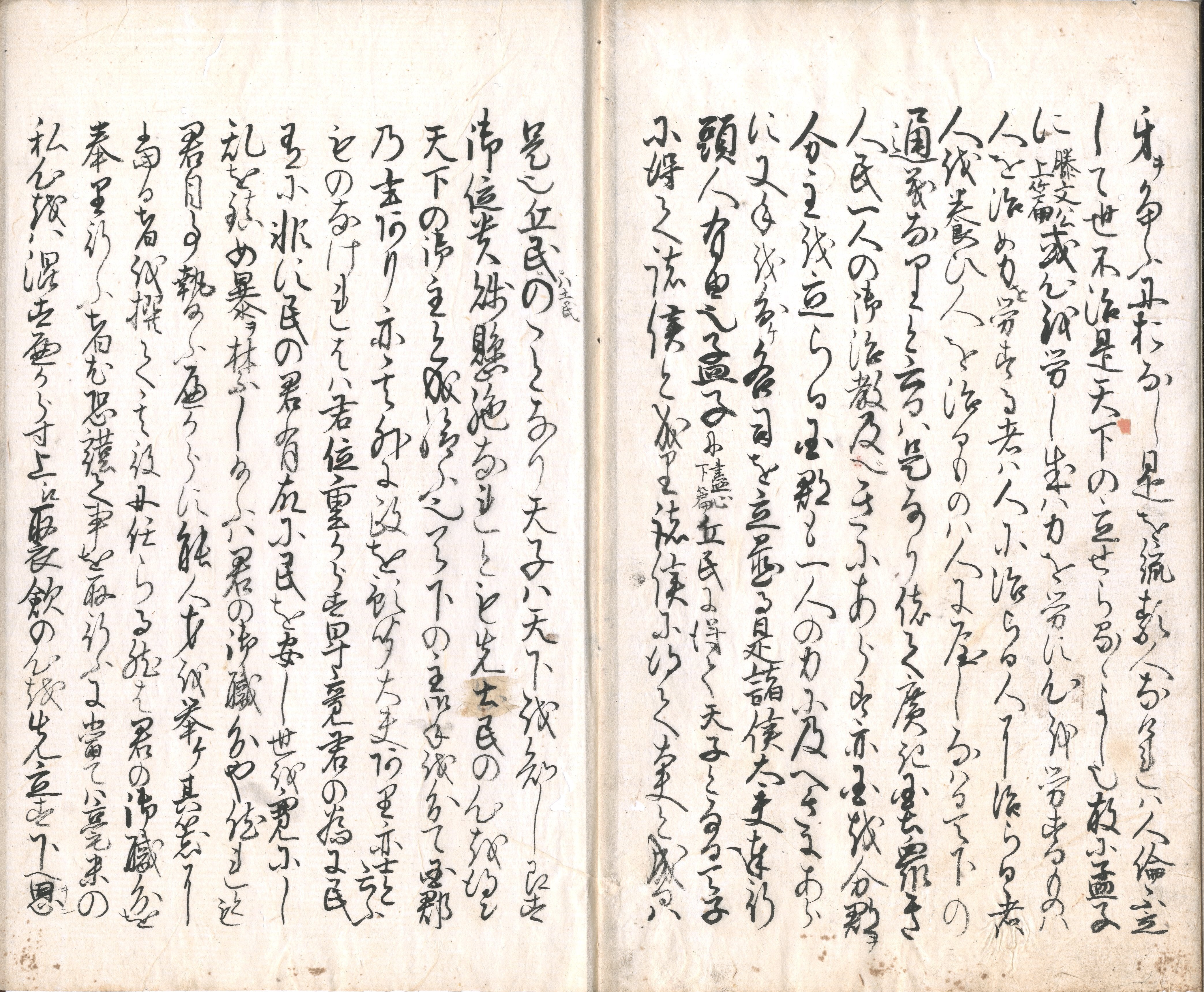【備考】分類「教訓」。『日本経済叢書』や『日本経済大典』などでその内容が知られてきたが、これまで原本の所在や所有機関がなかった稀書。本書は、第1条冒頭に「夫、奉行の職は、上之御心を奉り行ふゆへ、先、上之御職分を知る事肝要也」と記すように、奉行職(幕府や諸藩の上中級職名)にある者の公務上の心懸けを説いた教訓書。書名に「うわのそら」と冠するが、決して戯作や戯文ではなく、作者が自らの戒めのために付けたものであろう。各条はそれぞれ文章の長短があり、全27カ条からなる。第1条「職分と上下の心得」、第2条「有事における民力の活用」、第3条「民への慈悲」、第4条「法と理」、第5条「年貢上納の法」、第6条「貧窮の救恤」、第7条「百姓の仕置き(取り締まり)」、第8条「君主と領民の伝役の心得」、第9条「奉行職の不為と不能」、第10条「聚斂(シュウレン、重税を取り立てて人民を苦しめる)の戒め」、第11条「鷹・野・川狩の心得」、第12条「勧善懲悪の政」、第13条「刑罰」、第14条「下情への精通」、第15条「訴訟心得」、第16条「庄屋と百姓の争論」、第17条「衣食住の質素倹約」、第18条「政の目標(国富と移風易俗)」、第19条「風俗を改める方法」、第20条「凶年・飢饉の蓄え」、第21条「公務上の守秘」、第22条「奉行頭人の留守居役の重要性」、第23条「民間に対する過度な穿鑿の禁止」、第24条「同役が和し難き理由」、第25条「政の五美四悪」、第26条「治国の三事五要(敬事而信・節用而愛人・使民以時の三事と、敬・信・節・愛・時の五要)」、第27条「奉行の任務は農業の艱難辛苦を熟知すること」を説く。