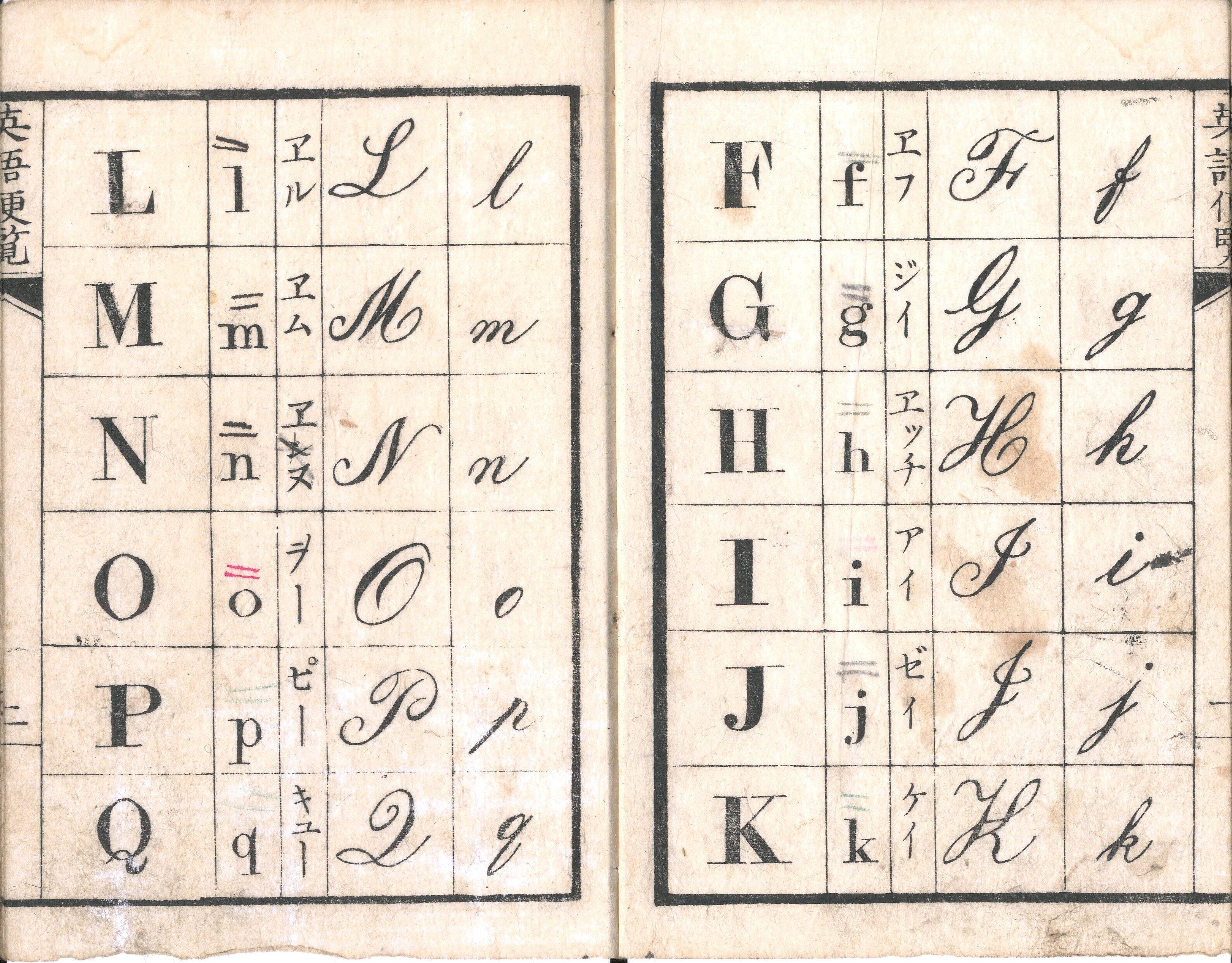 【備考】分類「外国語・往来物」。「田舎の幼童(ワランベ)婦女子」に英語の初歩を教えるために編んだ英語入門書。まず「英国の二十六字(アルファベットイタリック体・ローマン体)」、英字によるイロハの表記である「〈和英通韻〉いろは韻」、英字による五十音表記である「母韻五十」を始め、数字・四季・十二月、時間(時・分・秒)、時計の見方、初歩的な日用英語である「平常に用ゆる英語」、初歩的英会話である「和英会話俗解」までを収録する。