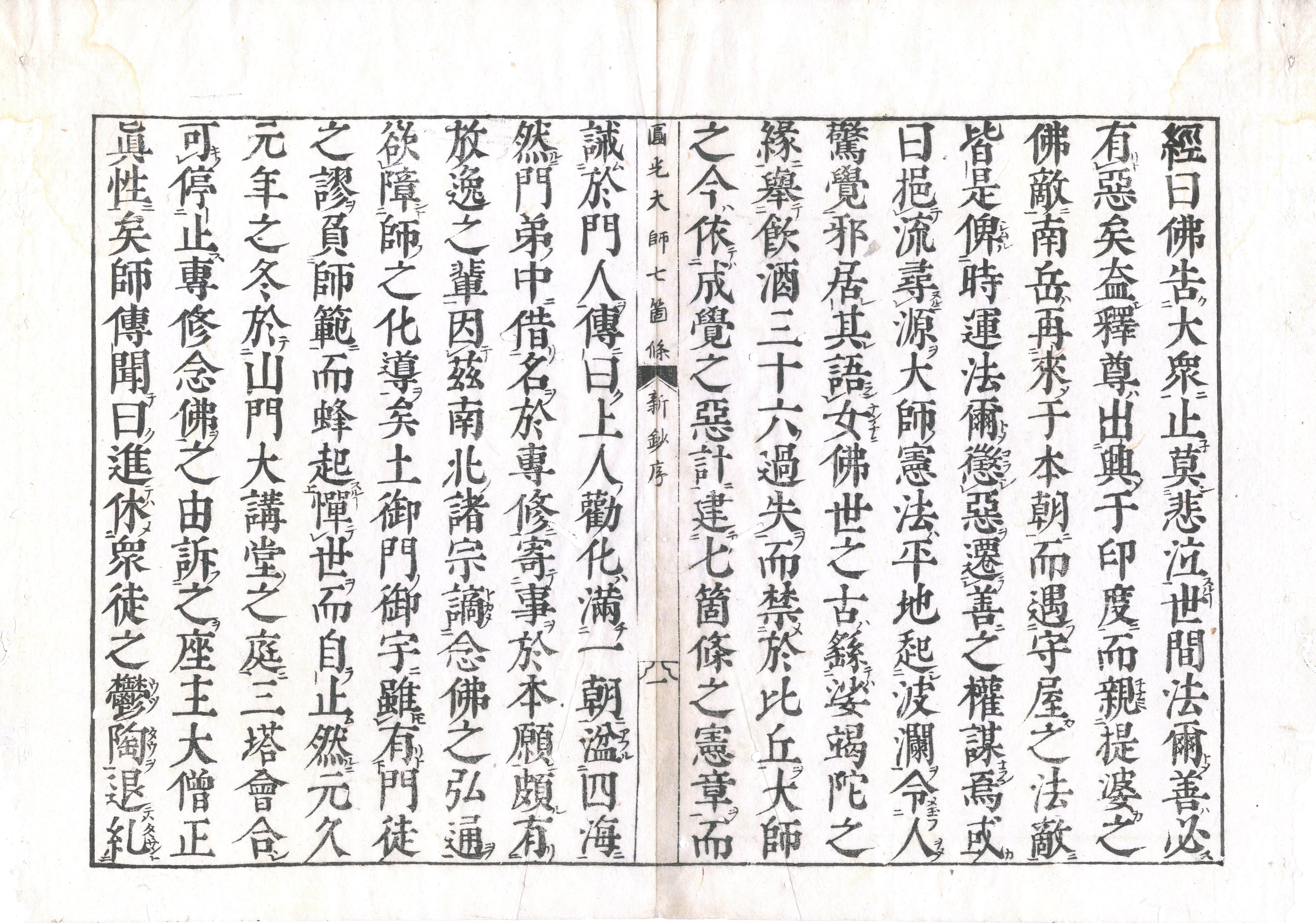 【備考】分類「浄土」。袋綴じ展開収録。円光大師(法然)の『七カ条起請文(七箇条制誡)』の注釈書。は、1204(元久1)11月に法然が旧仏教批判の抑制を門弟に求めた訓戒。法然と弟子190名が連署。『七箇条制誡』は、延暦寺衆徒が天台座主に専修念仏停止を要請したのに対し、法然は送山門起請文と七箇条制誡を記して弾圧回避を図った。偽撰説も出たが、真撰説で確定。京都二尊院が原本所蔵(思想大系)。