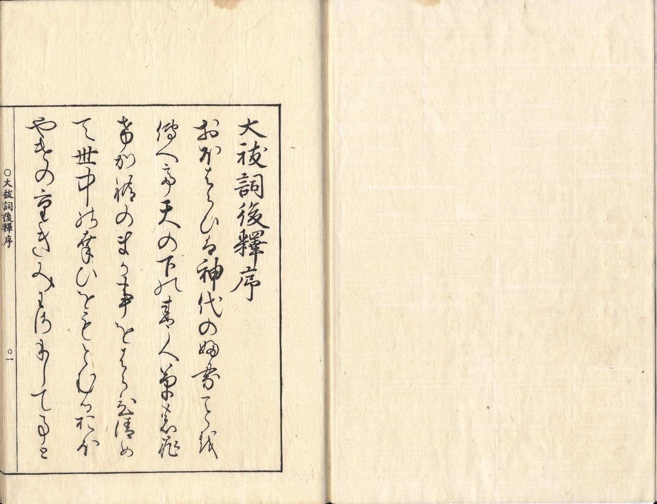 【備考】分類「神道」。後印本も抄録した。『大祓詞後釈』は2巻2冊、注釈、本居宣長著、寛政8年春、[江戸]山城屋佐兵衛・[大阪]河内屋茂兵衛刊。起稿は寛政7年3月30日、版下書了は同年10月18日。寛政7年11月の神祇伯資延王の序を付す。なお、宣長は「大祓」に「オオバラヒ」と付訓しているので、書名の訓みもそれに従う。内容は『延喜式』の祝詞の「大祓詞」について、1句ごとに本文をあげ、まず賀茂真淵の『祝詞考』の説を掲げて、その後に「後釈」として自己の注解を示し、最後に「つけそへぶみ」として、「大祓詞」以外の祝詞の語句の注を若干ずつ加えたもの。本書は宣長が『出雲国造神寿後釈』を完成した後、祝詞の代表としての「大祓詞」の注解にその他の祝詞の略注をも添えて、祝詞の全注釈に代えようとしたものとおぼしく、前者『出雲国造神寿後釈』に比し、広く根本的問題を論じ、本格的な姿勢がうかがわれる。神祇伯に序を請うたところにも、天下に正説を示そうとした気概が感じられる。まず冒頭には、真淵の説のすぐれている理由とこれを批判する真意を弁じ、「六月晦大祓」の条では、大祓の意義・沿革などについて精密に分析し、文献を引いて詳細に考証し、『祝詞考』の誤りや不備を補っている。特に、真淵が各祝詞の成立年代を「神賀詞は飛鳥岡本宮の御代…大祓の詞は大津清御原の御代」などと、直観によって断定したのを退け、祝詞の成立過程には長い年月を考えるべきで、その間に詞句の変化もあり、1、2の語句によっては年代は定められないとするのは、学者としての卓越した見識を示している。詞章の各句の注釈も、考証綿密、整然たる論理と古代語法の学識に支えられ、周到を極めている。勿論今日から見て訂正すべき点もあるが、祝詞の研究として画期的で、現在も必見の価値がある。なお、本書の補正の書として藤井高尚の『大祓詞後後釈』1巻(文化10年刊)がある(「日本古典文学大辞典」参照)。
