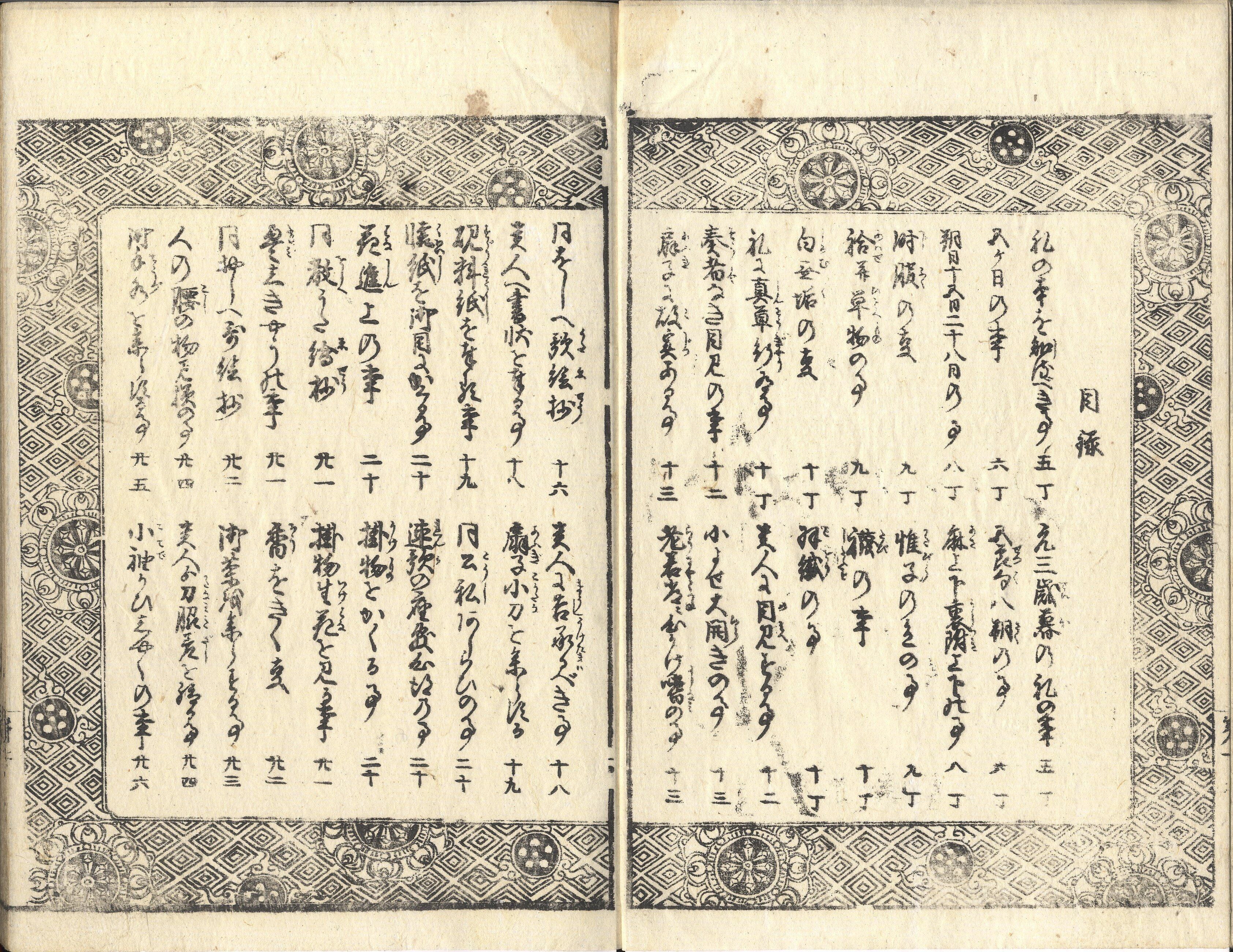 【備考】分類「礼法」。礼法全般、食礼・婚礼、通過儀礼、小謡等までを図解入りで説いた童蒙向け小笠原流礼法書。半紙本2巻2冊と3巻3冊の2種ある。3巻本の第1冊(上巻)は日本礼法の起源や礼の根本、五節句および時服、貴人や客人への応対、物の請取渡し、種々座礼、食礼等、第2冊(下巻)は縁談・結納から始まる婚礼全般と出産以後の生涯の通過儀礼に関する記事と「式礼座席小謡(祝言・佳祝・追福の3門から成る121番)」「茶の湯の事」「茶道百首教歌」「生花仕やう」「香の事」など芸能関連の記事で、いずれも礼法の心得を詠んだ教訓歌(礼法教歌)を多数載せるのが特色。また第3冊(下巻付録)は「式礼用文章」と題した用文章で、「年頭披露状」以下49通の消息例文と頭書「書札要例集」から成る。この「式礼用文章」序文には、近年の用文章が「商家諸職の便用、俗事のみを専らとする」結果、「分限相応の文言を失し、只端的に書」く傾向があるが、相手に失礼に当たる場合も少なくないため、本書を手習ううちに手紙の尊卑貴賤を弁え、文面の書き方を身に付けることができるだろうと述べる。SE02177