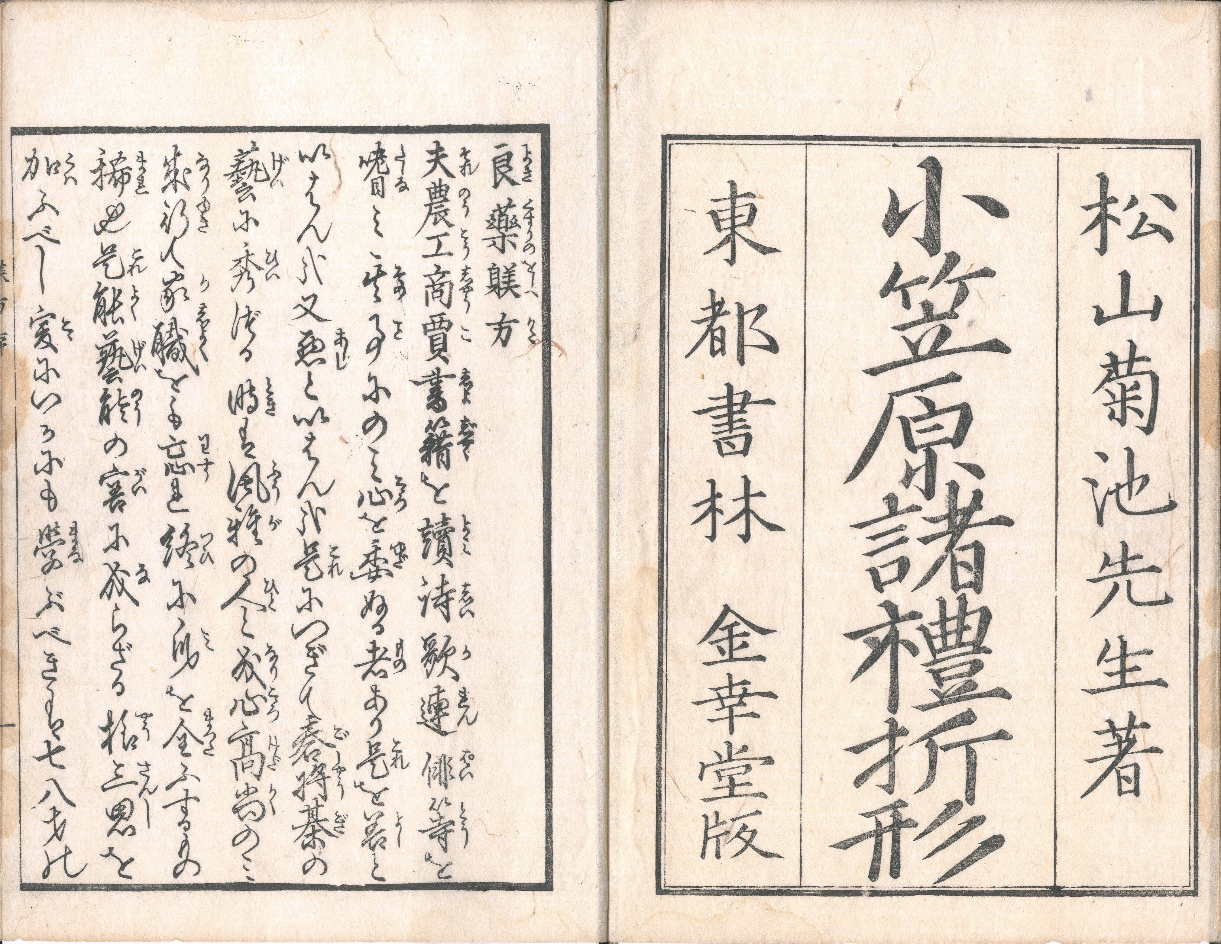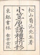【備考】分類「往来物・礼法」。同板別本も抄録した。また、冒頭に書袋を掲げた。本書は、享和元年『折形本躰伝』に、弘化4年刊『良薬躾方』(ただし末尾4丁を除く)を増補した礼法書(『良薬躾方』については後掲)。『折形本躰伝』は小笠原流折形の比較的詳しい図解書である。序文によれば折形は「木・火・土・金・水」の五行から生じた「天の節文(節度を守り、程良い飾り付けすること)」であり、同書は菊池家伝来の折形とする。本書に掲げる折形図は前半部(第11丁裏まで)の「極真の熨斗包」以下116六図と、「男蝶・女蝶」以下14図(水引を朱刷りとする)の合計130図である。作者の詳細は不明だが小笠原流を自称した礼法家であろう。「小笠原流…」の書名も出版の際に書肆が付けたものとも考えられる。このように小笠原家以外の礼法家が続出して一人歩きしたのが江戸時代の小笠原流礼法であった。また『良薬躾方』は、食礼を主とする礼法・婚礼全般を概説した往来物。前半は「喰方之次第、膳に向ひ様之事」以下65カ条で食礼および給仕方作法を述べ、後半「当時婚礼略式」は床飾り・祝言膳部・色直し等について記す。また巻末に、「斉家丸」「修身丸」「六親和合丸」「放党丸」「富貴丸」と題した修身・斉家・家内和合・貧富等の平易な教訓を載せる。本文を小字・14行・付訓で綴り、本文中に挿絵数葉を挟む。なお、本書の宣伝のために出版された安政2年刊『きさらきつみ草』によれば、本書は嘉永4年初刊、同7年再刊で、価格は「銀一匁」であった。