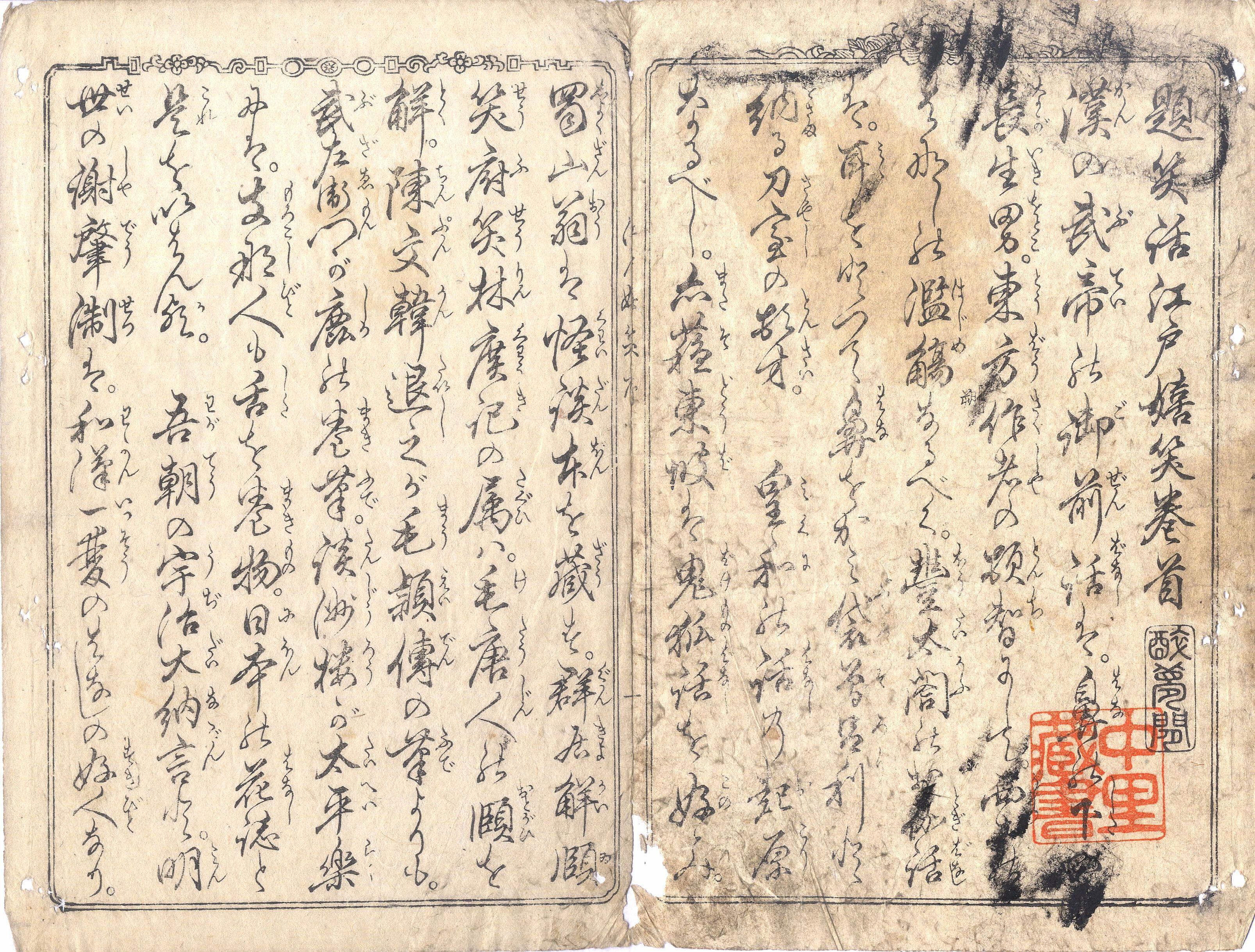 【備考】分類「咄本」。袋綴じ展開収録(見開き図は再掲)。「太平楽」「弁天尽」「為(タメ)」「初鰹」「角」「神尽」「蝸牛」「下戸」「夜永」「正月」~「十一月」の20話を収録する。巻頭に「七福神初夢あそびの図」を掲げる。『諢話江戸嬉笑(オドケバナシエドキショウ)』とは別本。(参考)『諢話江戸嬉笑』は、巻頭に「東西咄角力(ハナシズモウ)」とある通り、三馬門下の3人が角力に擬して東西に分かれ、2話を一番として自作を披露し、三馬が行司役で評を添えて咄の優劣を判定する咄角力の形式をとる。古く『露鹿懸合咄(ツユシカカケアイバナシ)』(元禄10年)にも見られ、咄会での選考過程を偲ばせているが、これは寄席で実演される咄角力の余興と関連があろう。全11番22話の内容は、先行話からの焼き直しもあるが、「生粋」(「ずっこけ」の原話)はじめ現行落語の原話が多いのも咄家の作らしく、噺本に縁の薄い三馬の序と短評も興味深い(「日本古典文学大辞典」参照)。SE02208