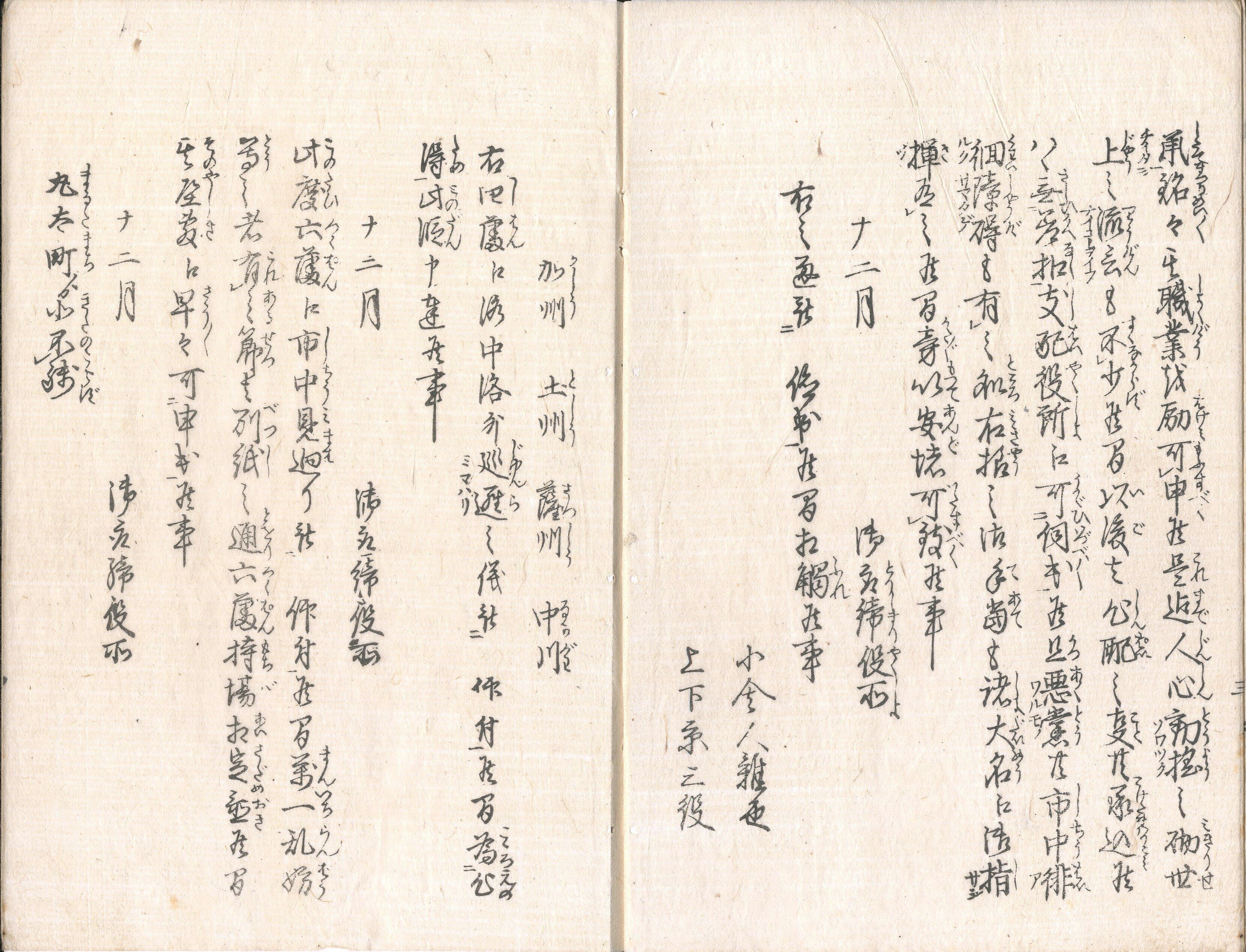 【備考】分類「法制」。首題に「慶応三年卯十二月より御布令(オフレ)之写」とあるように、同年12月に出された法令であるが、続く冒頭に「今度、京都町奉行所御廃止ニ相成候間、此段山城国中江早々可相触者也」と記すため、京都板であろう。同年12月に発布された20法令を収録する。