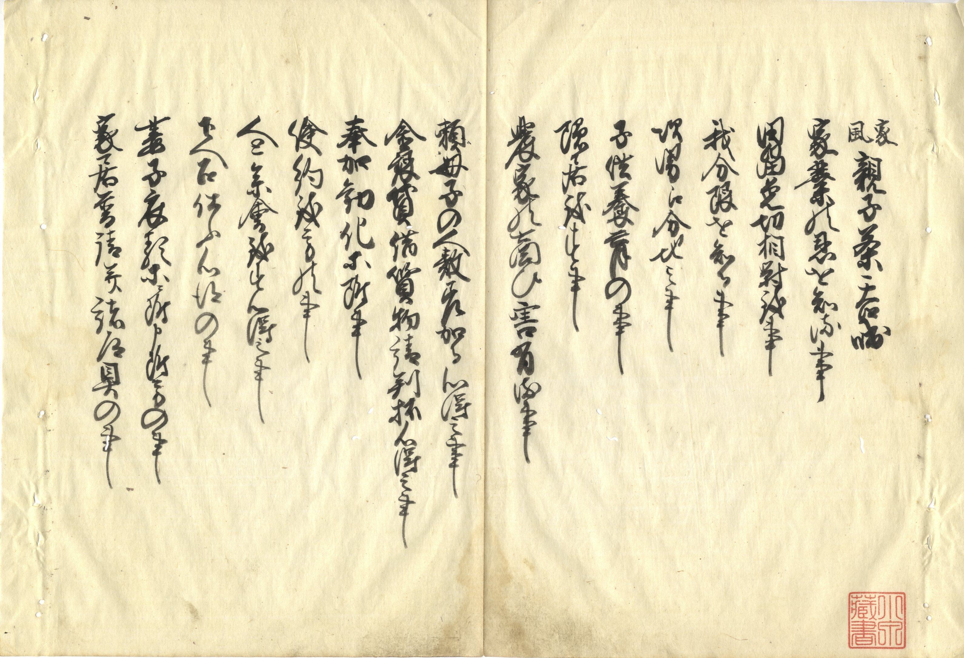 【備考】分類「教訓」。但馬国養父郡宿南村、出石藩の大庄屋であった作者が子孫のために記した教訓書。各丁の袋綴じを開いて収録。SE02221