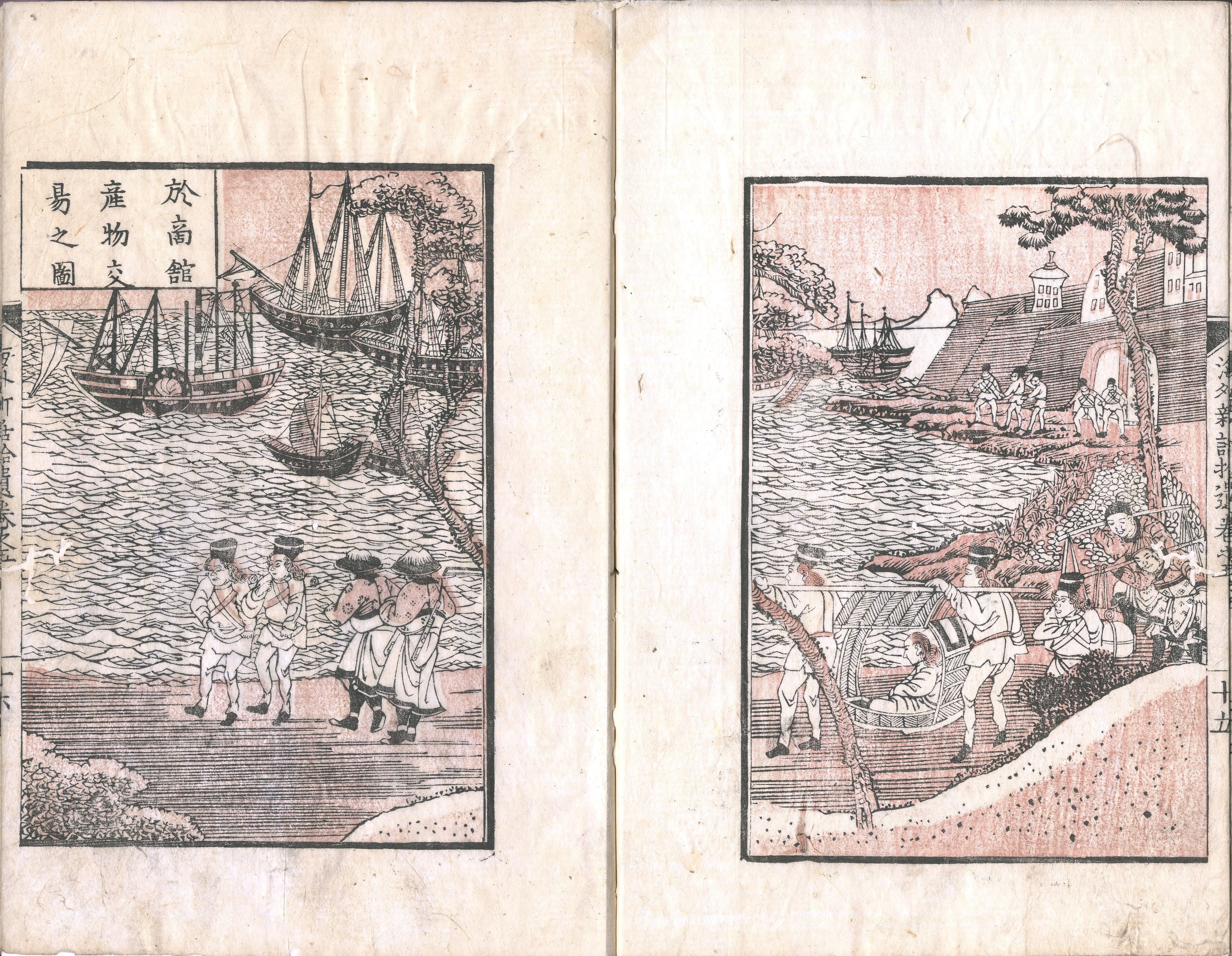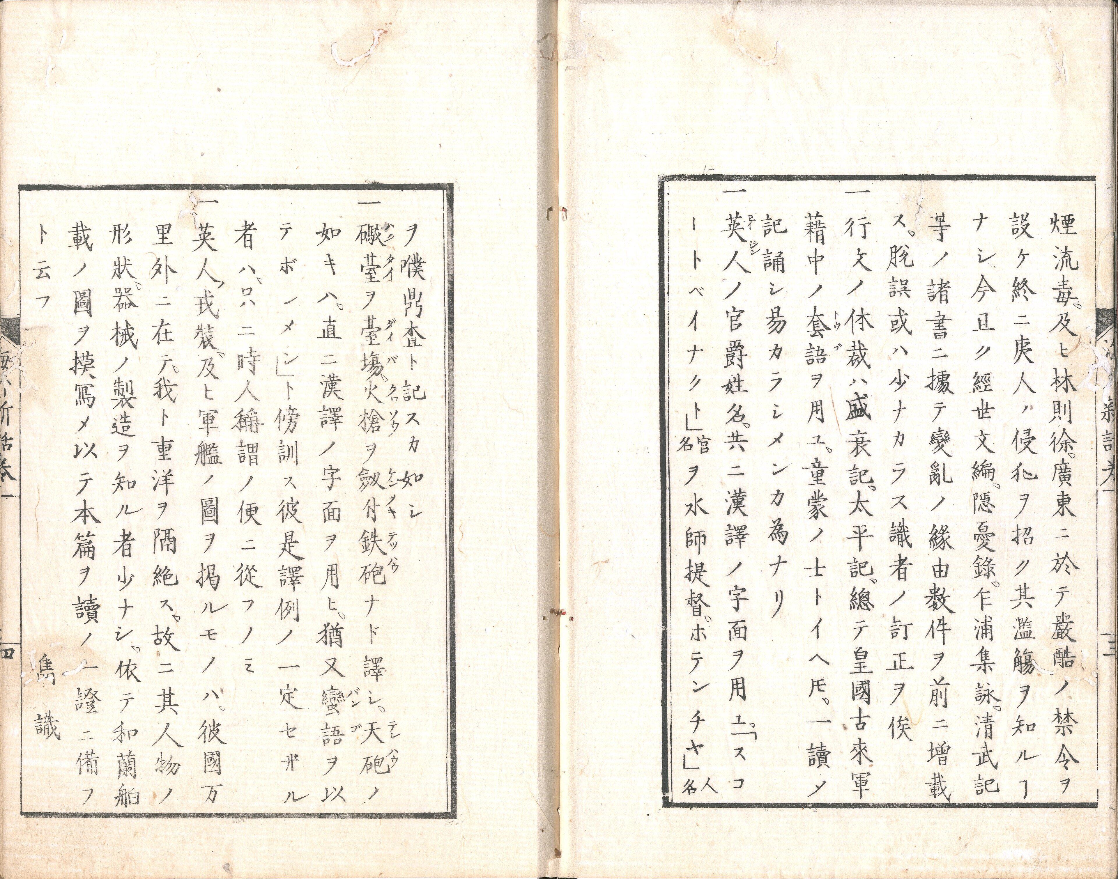 【備考】分類「外国史」。「坤輿略圖」「清國略圖」挿図あり。『夷匪犯疆録』にもとづく編訳。中国清朝時代の阿片戦争にからむ通商交易までの経緯を詳記す。中国のアヘン戦争の事情等を地理的に記す。『海外新話拾遺』も同じく「夷匪犯疆録」よりとっている(国文学研究資料館DB)。嶺田楓江は幕末の丹後田辺藩士で、佐藤一斎に儒学、箕作阮甫に蘭学を学び、頼三樹三郎らの志士と交際している。嘉永2年、中国における阿片戦争の惨禍を知り、その状況を広く憂国の士に訴えんとして著したのが本書である。書中、世界及び中国の略図を付し、当時における英国のアジア侵略状態を図示した上、多くの挿絵をのせ、理解を容易にしている(京都外語大附属図書館HP)。なお、奥田尚「嶺田楓江『海外新話』の一部分の紹介」によれば、『海外新話』は嘉永二年己酉(1849)3月の序文を持ち、同年11月下旬から12月上旬に50部が刊行された。しかし、同年中に幕府の学問所はこの本についての調査を命じ、その結果、新規の本の出版は学間所の許可を得なければならないのに、同書はそれを得ていないことと、このような外国事情を記した書物の開板は好ましくないとして、翌3年(1850)同書の没収と開板禁止を申し渡した。著者の嶺田右五郎楓江については同年10月に禁固刑(「押込」おしこめ)とし、翌年正月に許された(「押込御免」)ものの、京都・大坂・江戸の三都居住禁止(「三都構へ」)を命じられた。ところが、没収・開板禁止処分が命じられたにもかかわらず、同嘉永3年5月には、同書の重版が出まわっており、関係者が検挙された。200部を仕立てたとも、50部を仕立てたともあり、全数は明らかではないが、そのうち差し押さえられたのは40部とある。嶺田楓江の取り調べの最中に、すでに重版を販売した者があるというのは、この『海外新話』がいかに人々に求められた情報であったかを如実に示すものである。また、この『海外新話』を吉田松陰が閲読し、その「序文」「例言」「英吉利国紀略」を筆写していることにも明らかである。