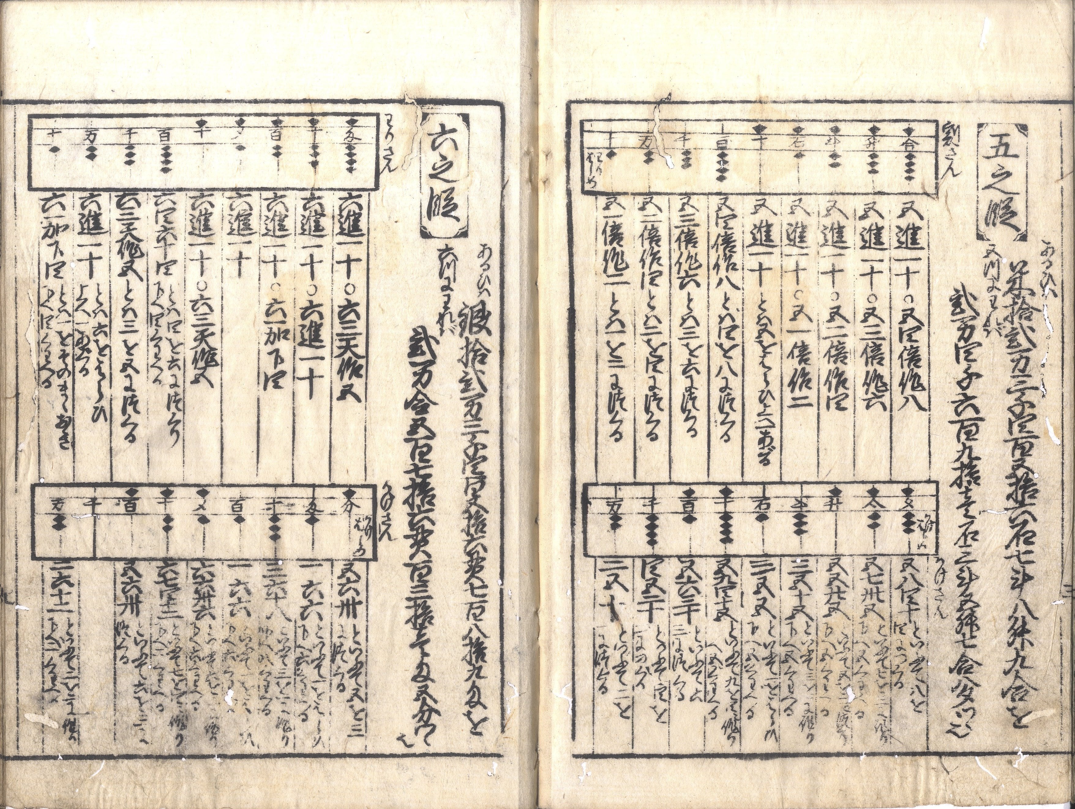 【備考】分類「和算」。江戸後期の薄手の簡略版塵劫記。見返に「九九之数」「鼠さんの事」を載せ、本文は「まゝ子だての算」「大数の名」「田数名の事」「諸物軽重量目事」「八さんの割の事(二~九之段)」「見一~見九図」「俵まはしの事」「すぎはへ俵積の事」「柴薪たば数の事」「利そくの事」「人足づもりの事」「こく高割合の事」「日に日に一ばいの事」「かけてわるさん」等を収録し、裏表紙見返に「米売買之算」を掲げる。