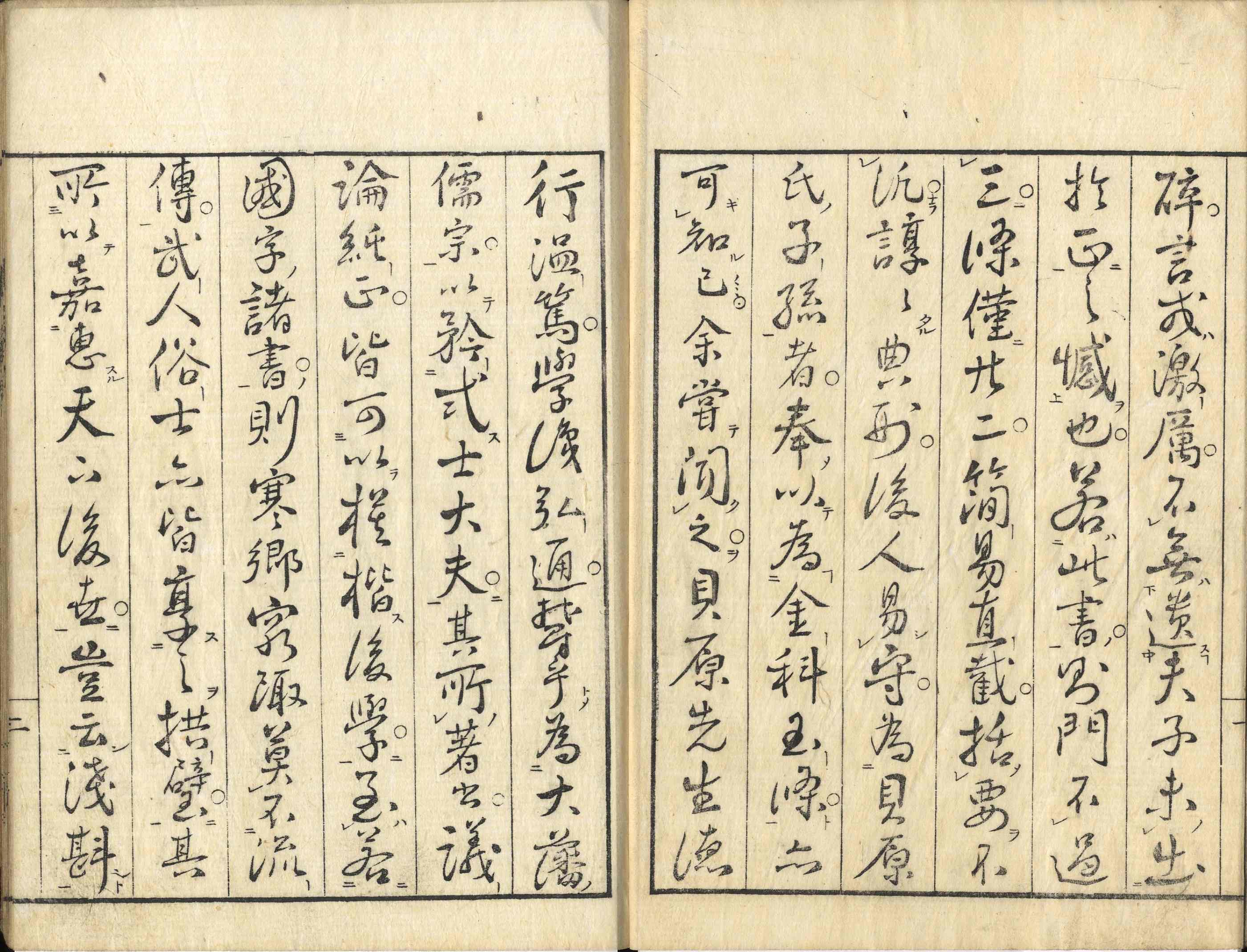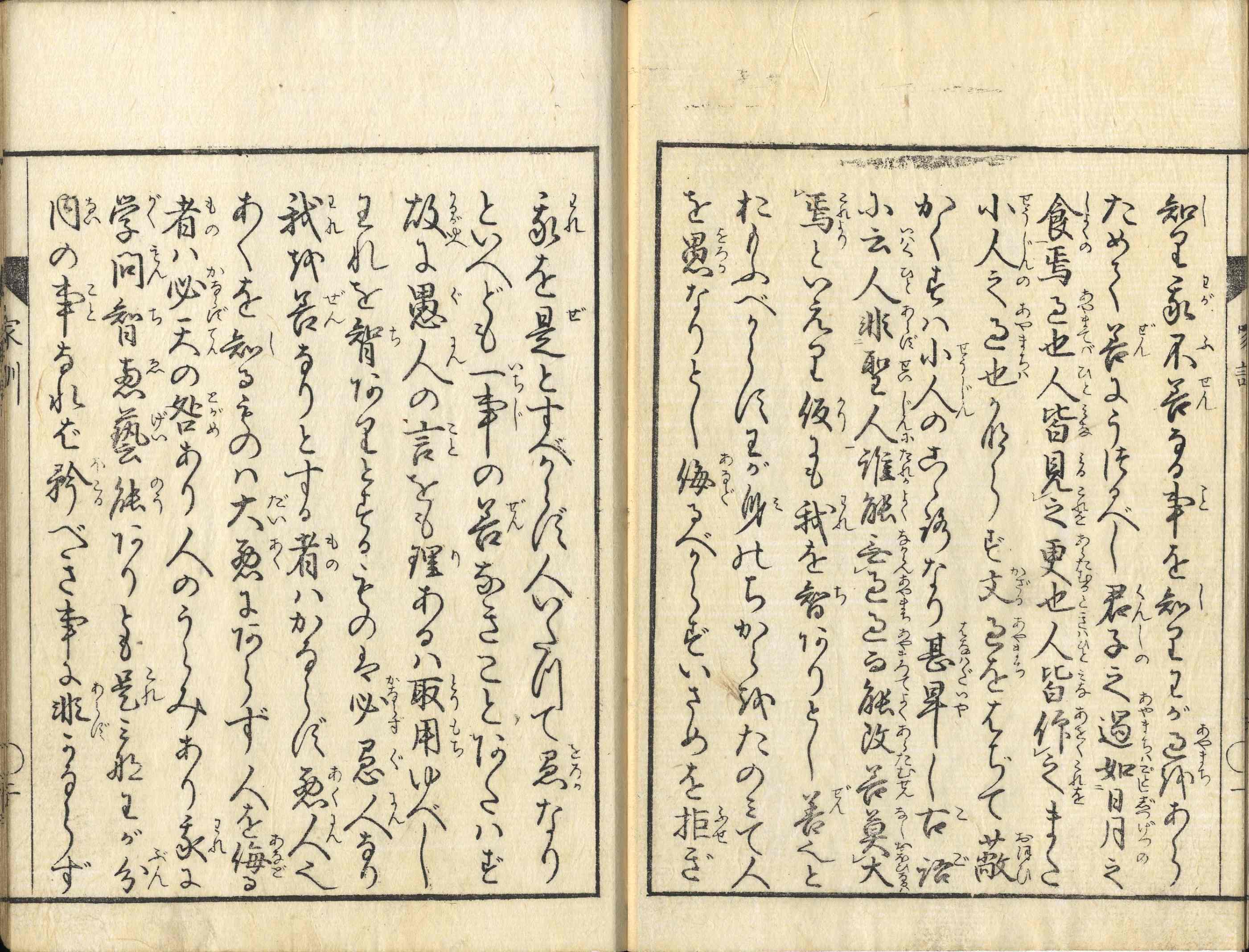 【備考】分類「往来物」。寛政板(2種)と天保板を全冊収録。益軒が子孫のために綴ったとされる家訓を上梓したもので、「聖学須勤」「幼児須教」「士業勿怠」の3章合計20カ条から成る。まず「聖学須勤」では、聖人の教えを学び努める志を立てる「聖学」の大意や、己を誇り人を侮る「矜」は「天下の悪徳」であり、逆に智を開き善に進むための徳たる「謙」は「天下の美徳」であると説き、「幼児須教」では「随年教法」など『和俗童子訓』流の教育論にも言及し、「士業勿怠」では武士の職分や日常生活での基本的心得(倹約、文武両道、忠孝勤倹)を諭す。貝原家では15歳になったら以上の家訓を代々相伝すべきことを後文で述べる。本文をやや小字・9行・付訓で記す。なお、本書は後人による偽作とする説もある。また、別掲天保7年板([大阪]塩屋喜兵衛板。天保7年7月、宮本榘跋)の巻頭に「損軒貝原先生像」および「益軒略伝」を掲げる。